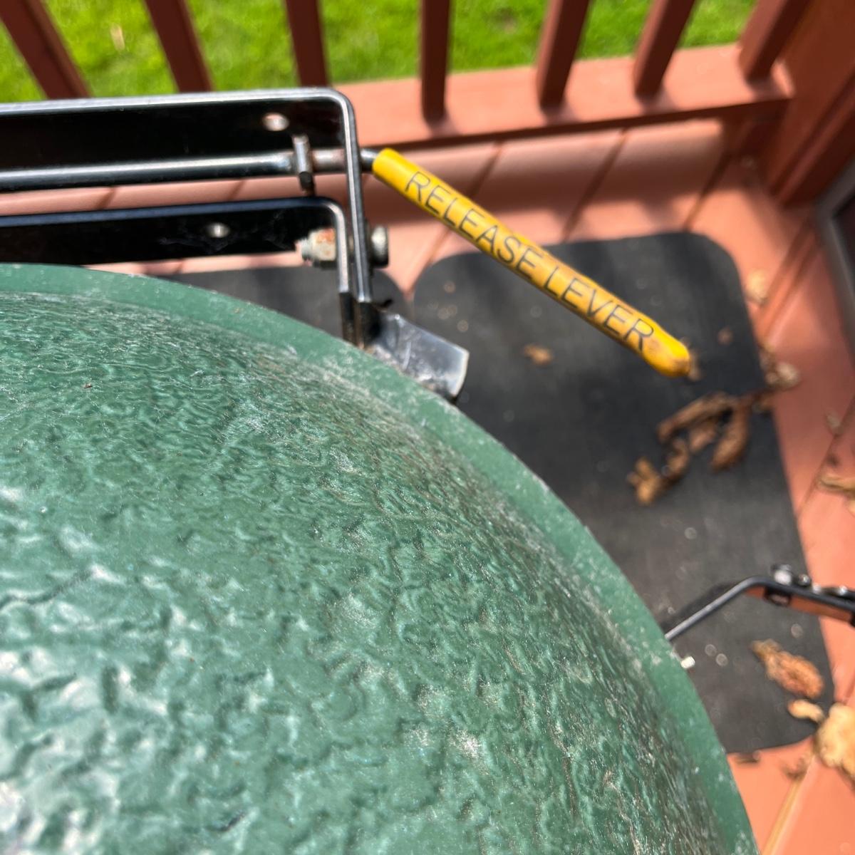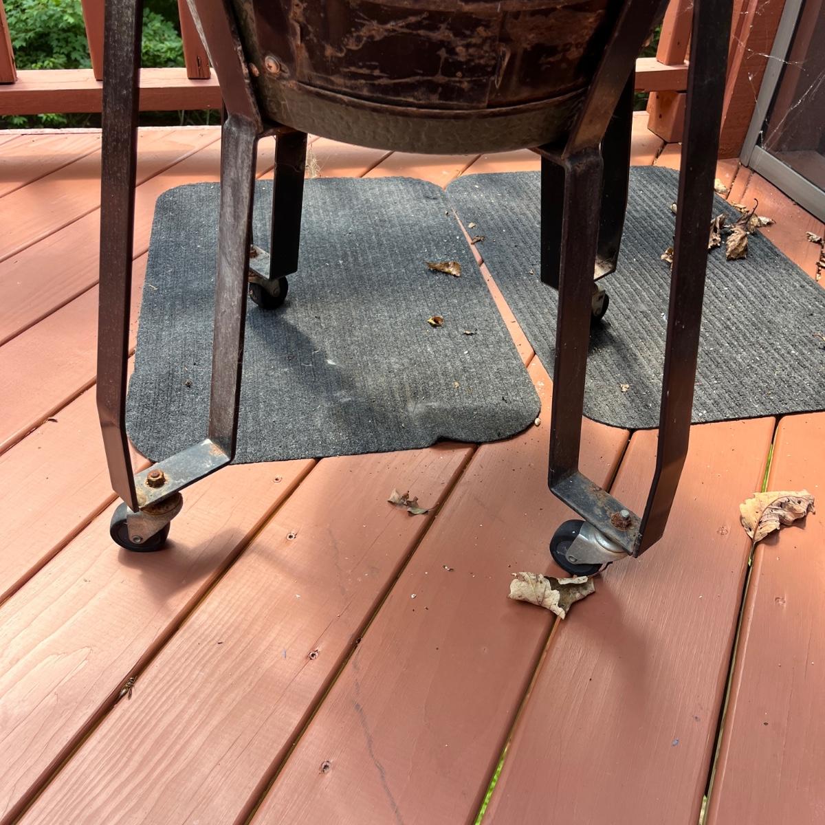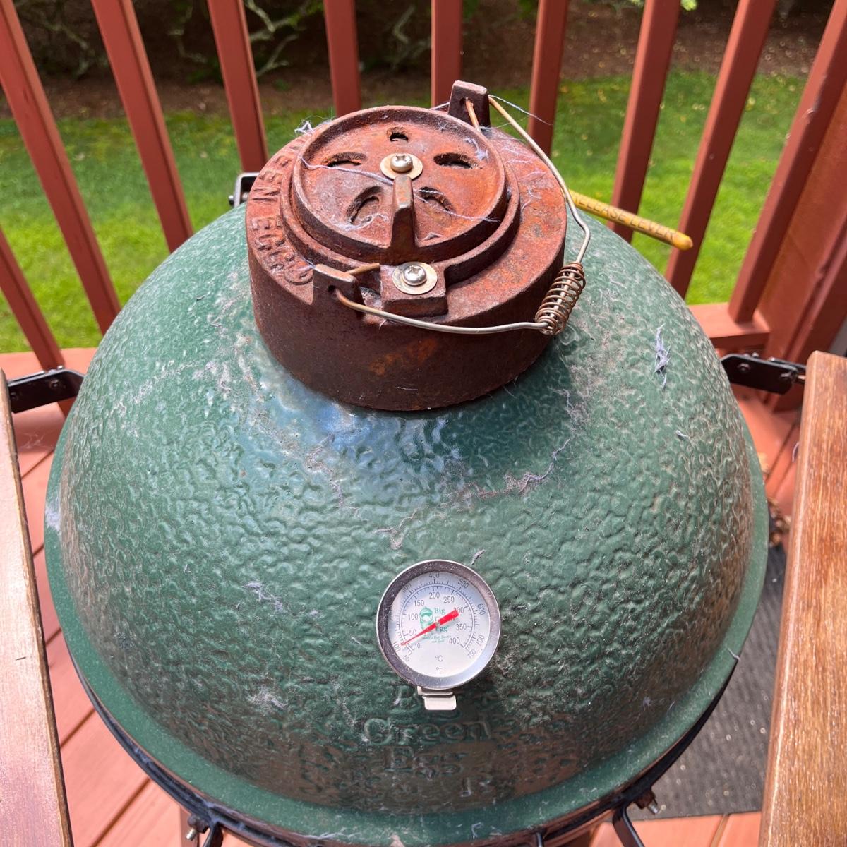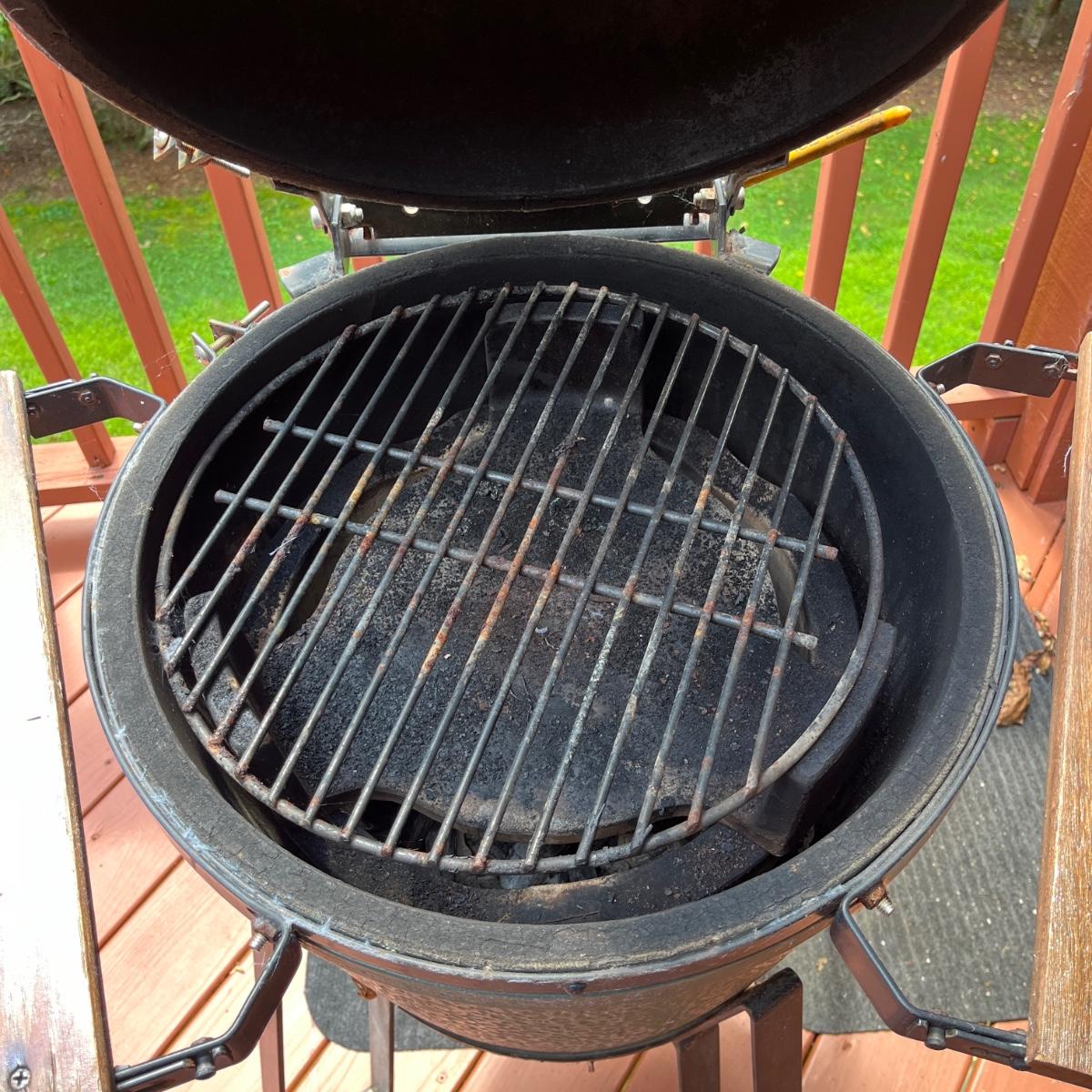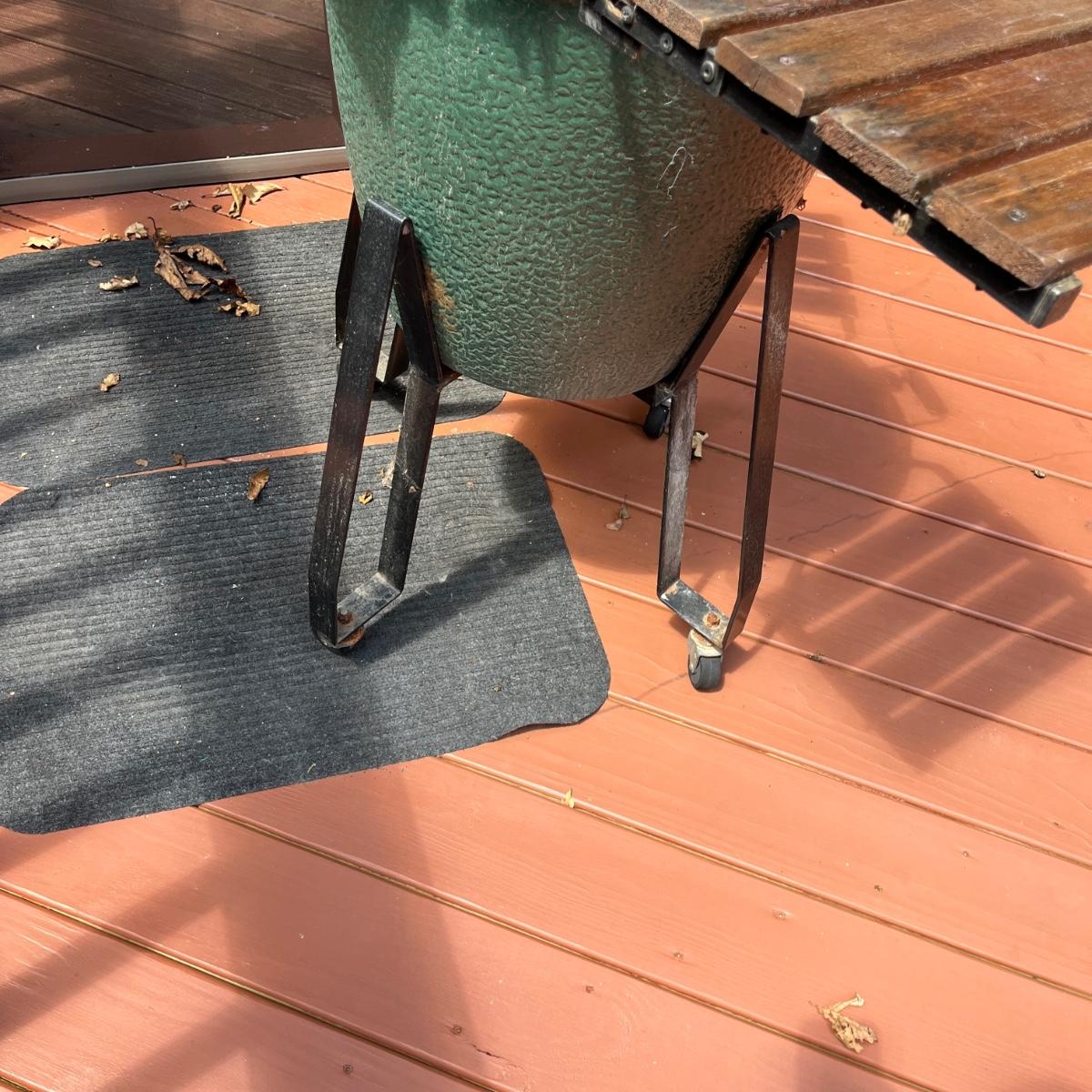 Lot includes a Big Green Egg with stand on wheels and cover. Item with stand measures 26” x 24” x 42”H with sides folded down. Cover is well worn, see pictures.