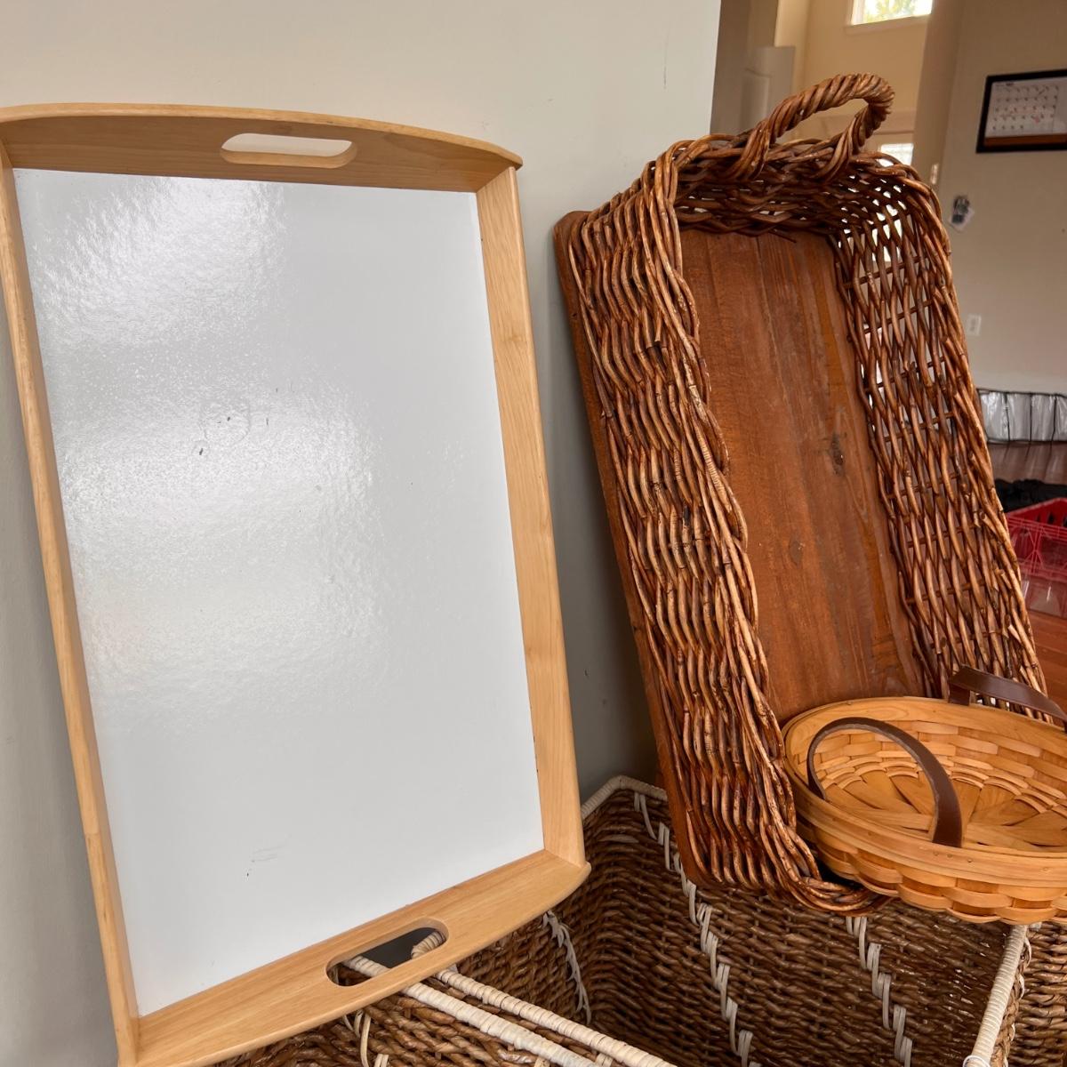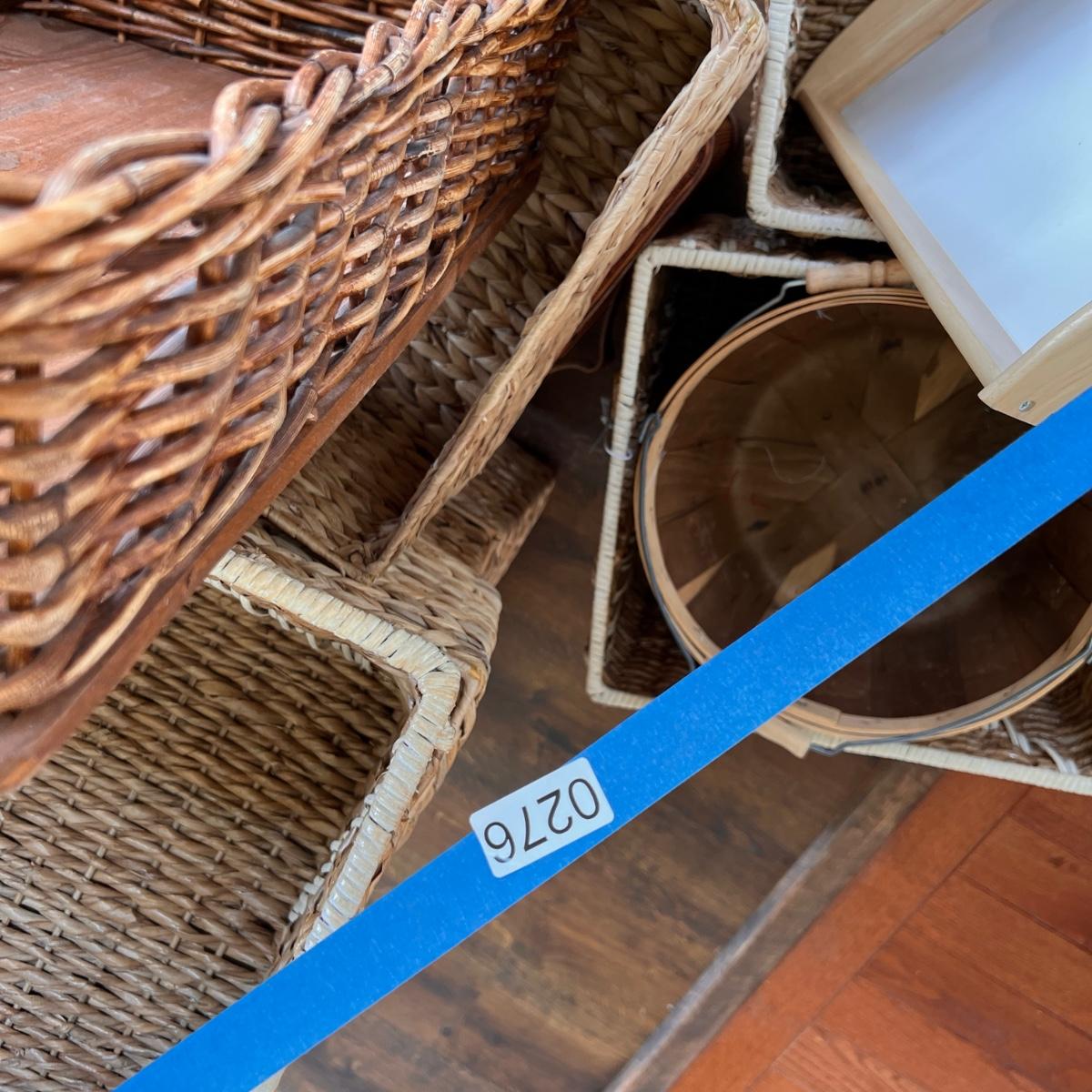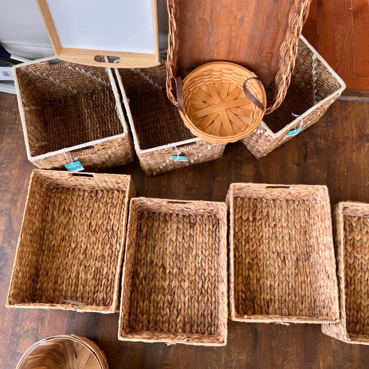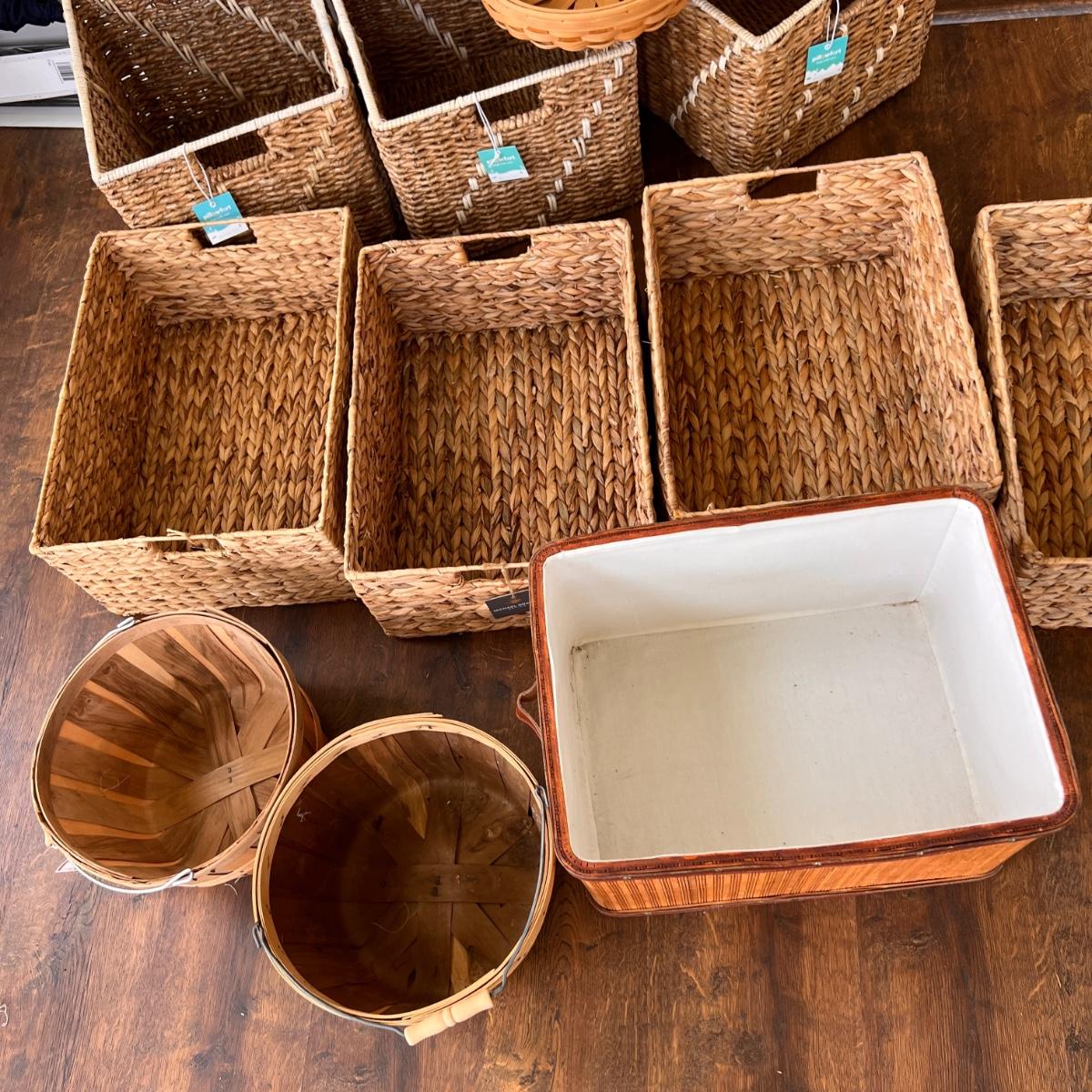 3 basket set, 4 basket set, 2 orchard baskets, mixed tray lot, 1 large cloth lined basket.