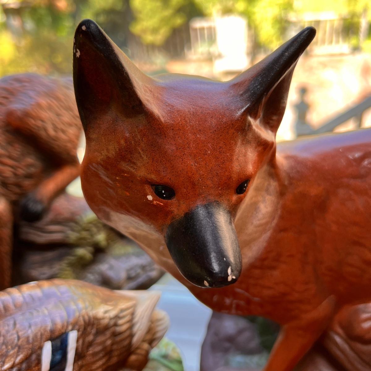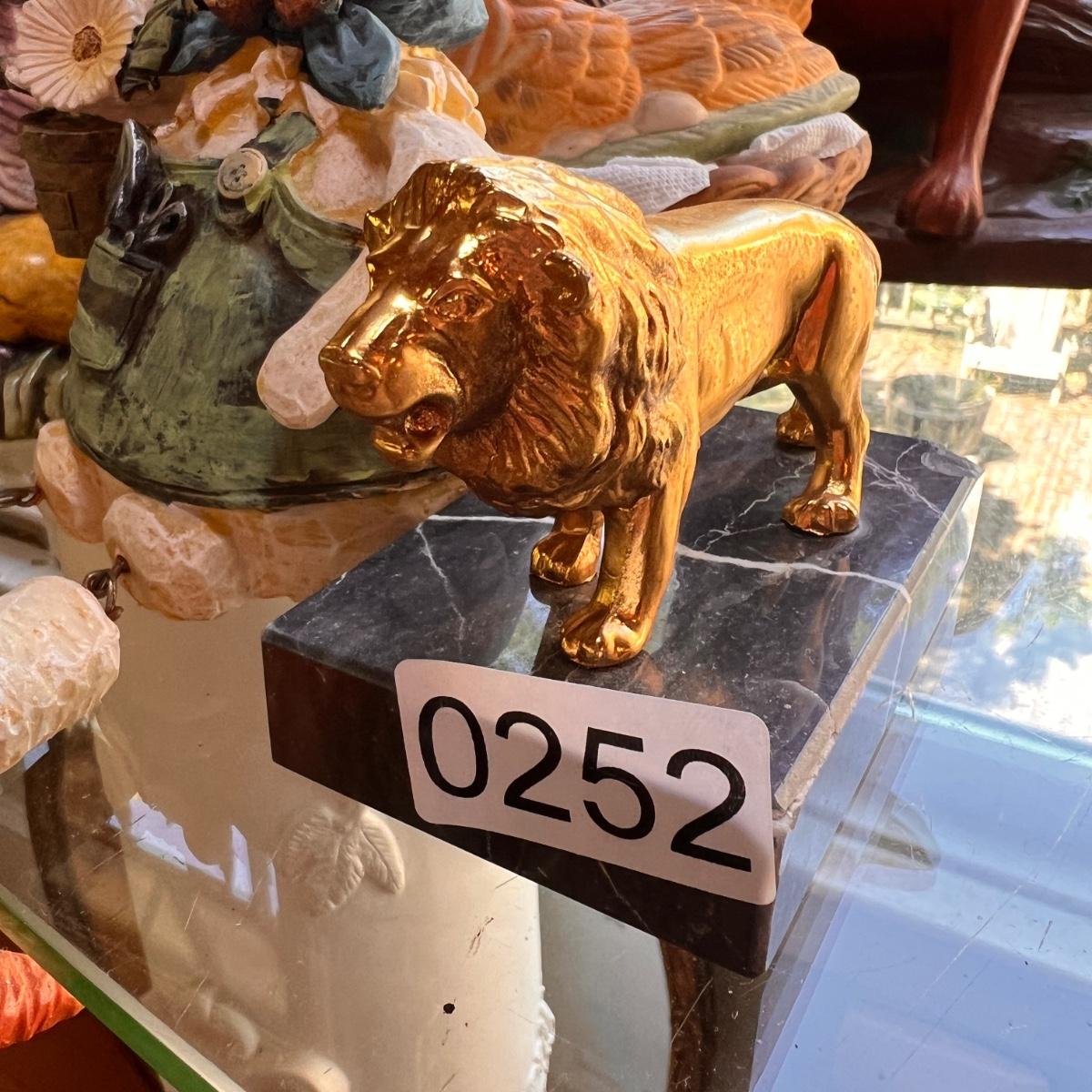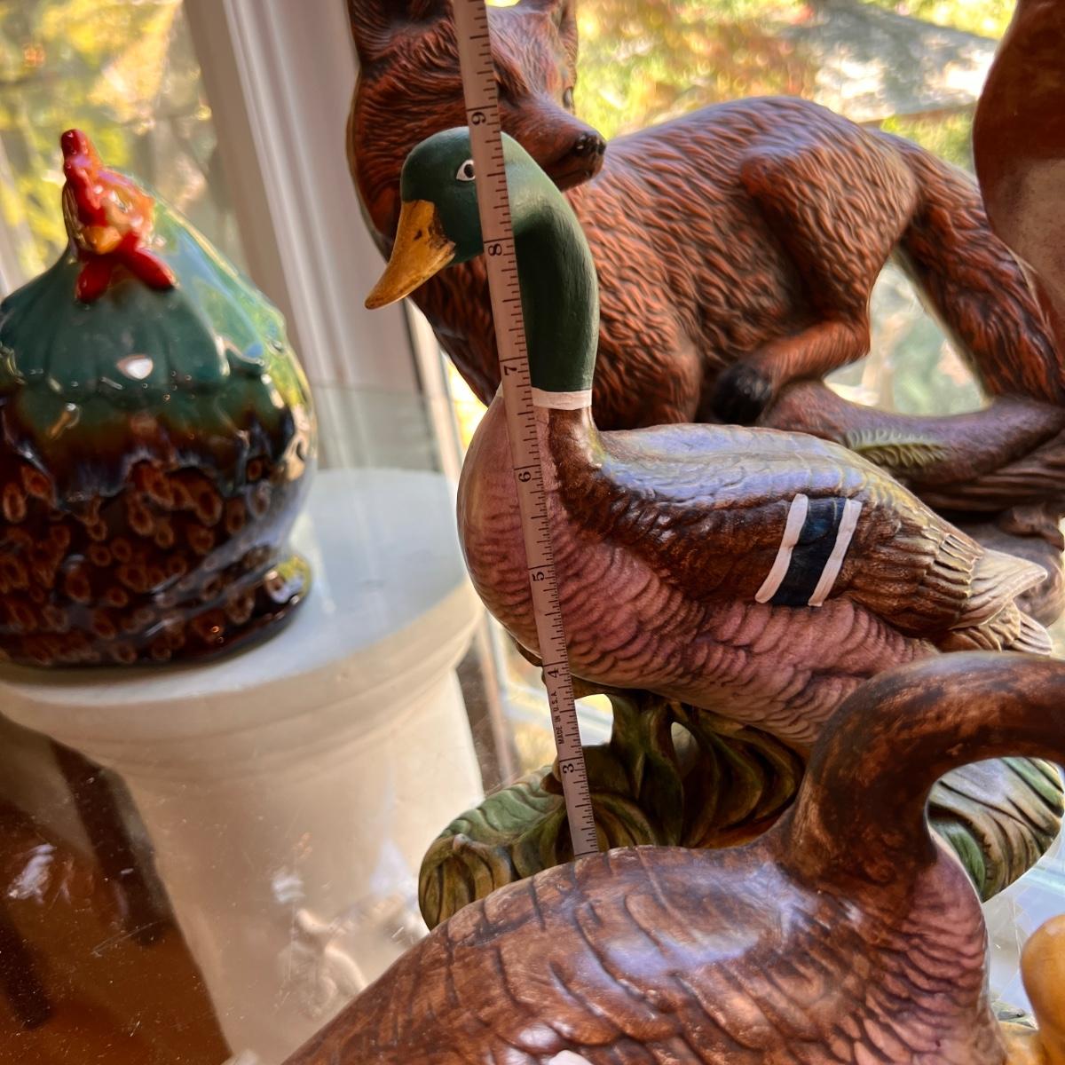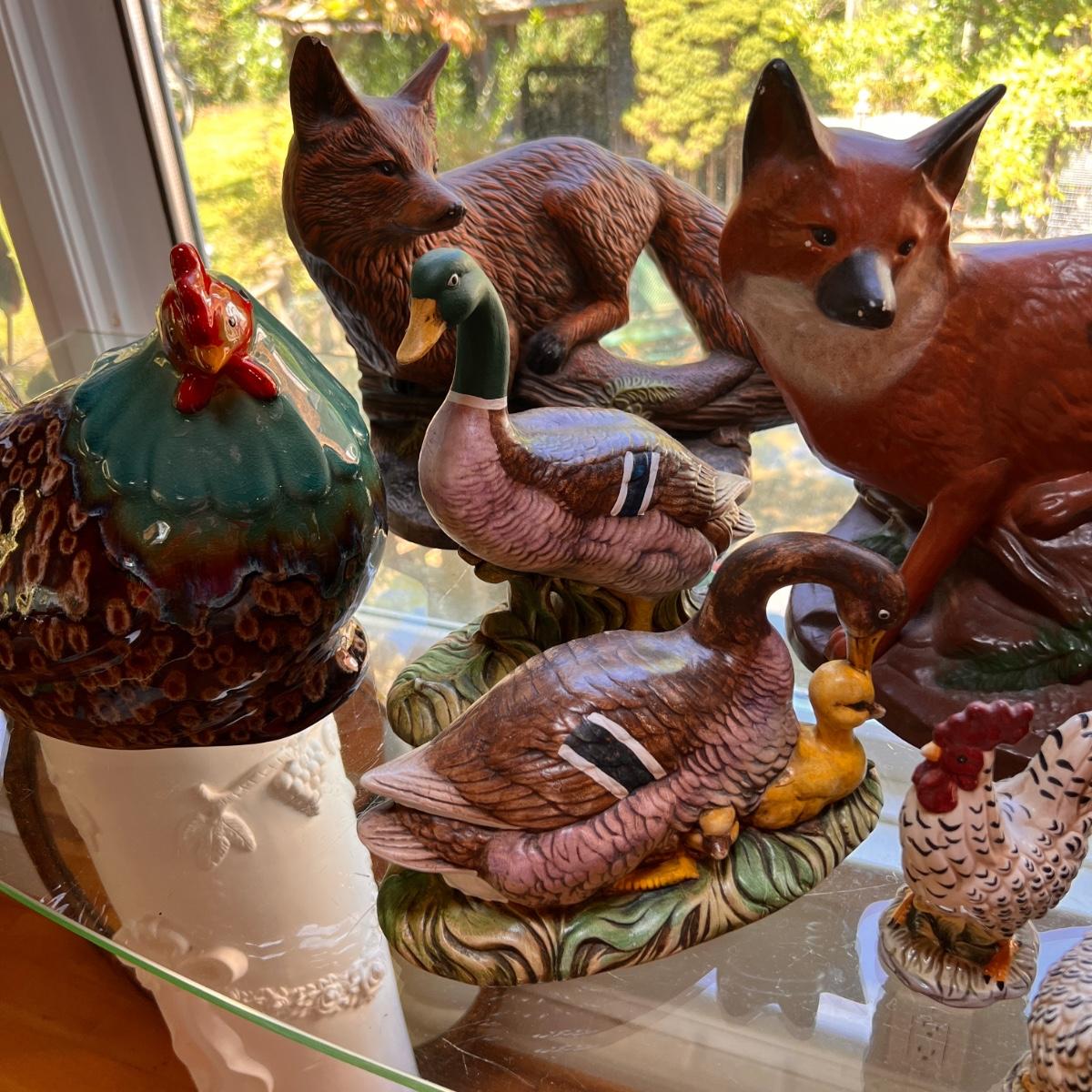 Lots of ceramic animal figurines in various sizes, some vintage and some contemporary. The 2 foxes have small chips. Brass lion on marble base. 2 mini cast iron ducks.