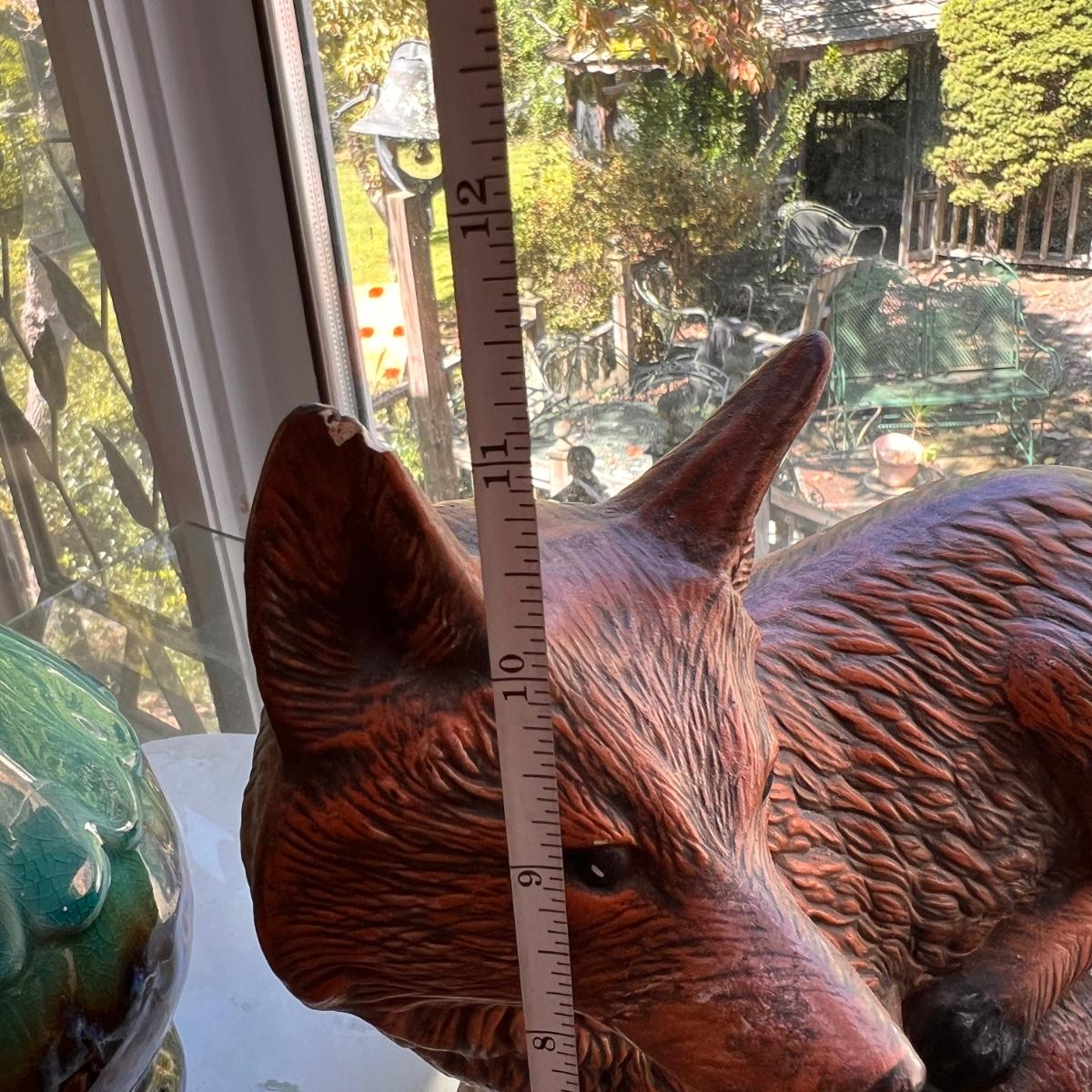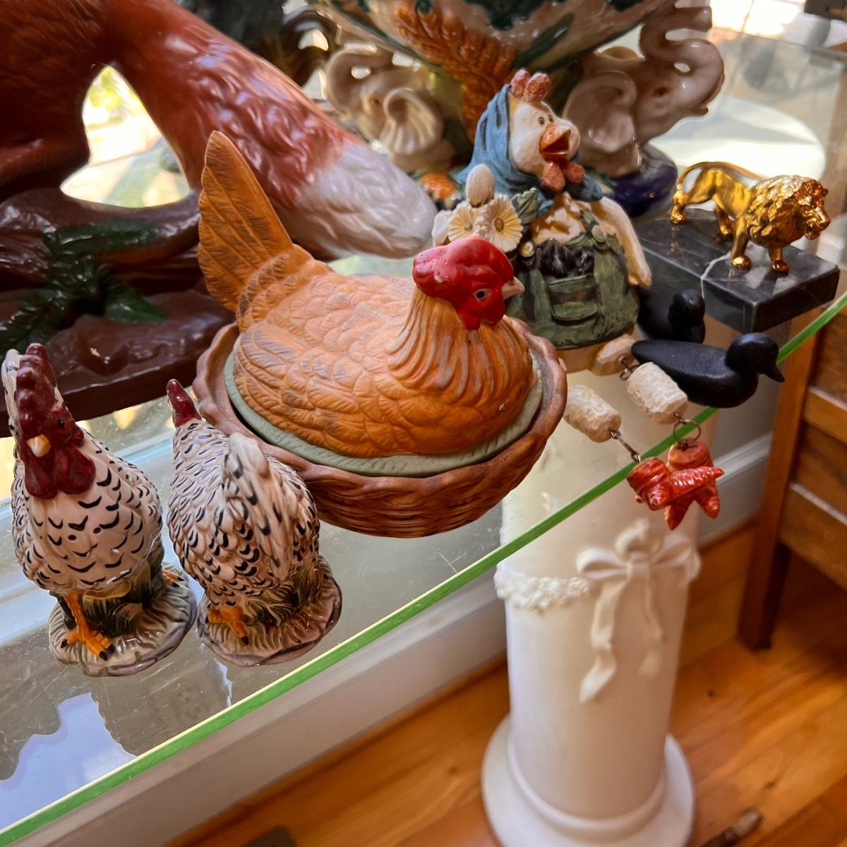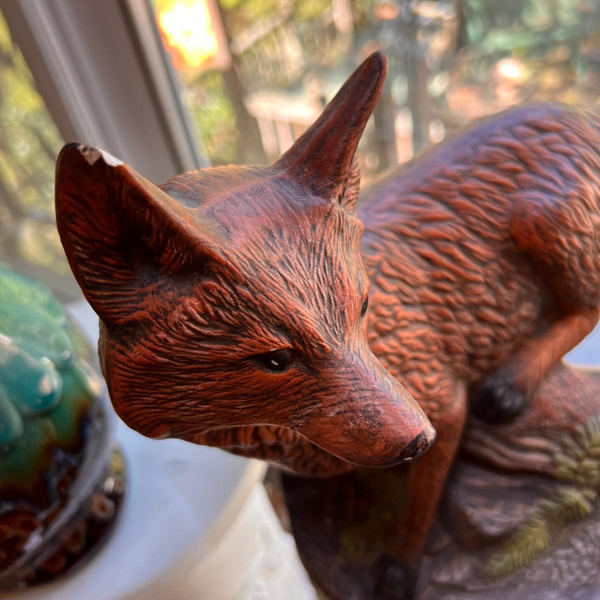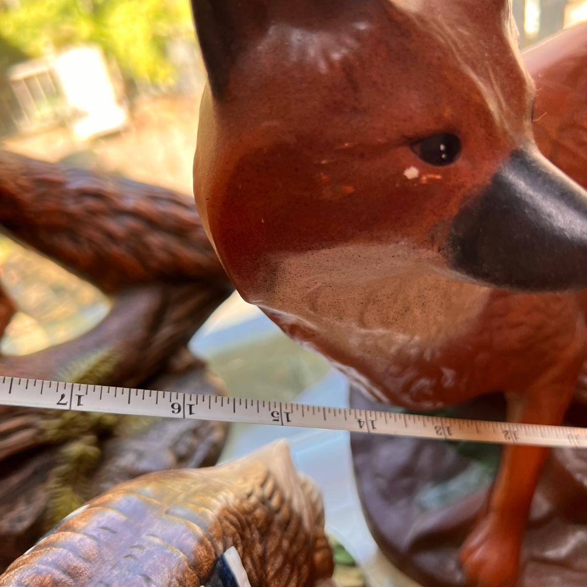 Lots of ceramic animal figurines in various sizes, some vintage and some contemporary. The 2 foxes have small chips. Brass lion on marble base. 2 mini cast iron ducks.