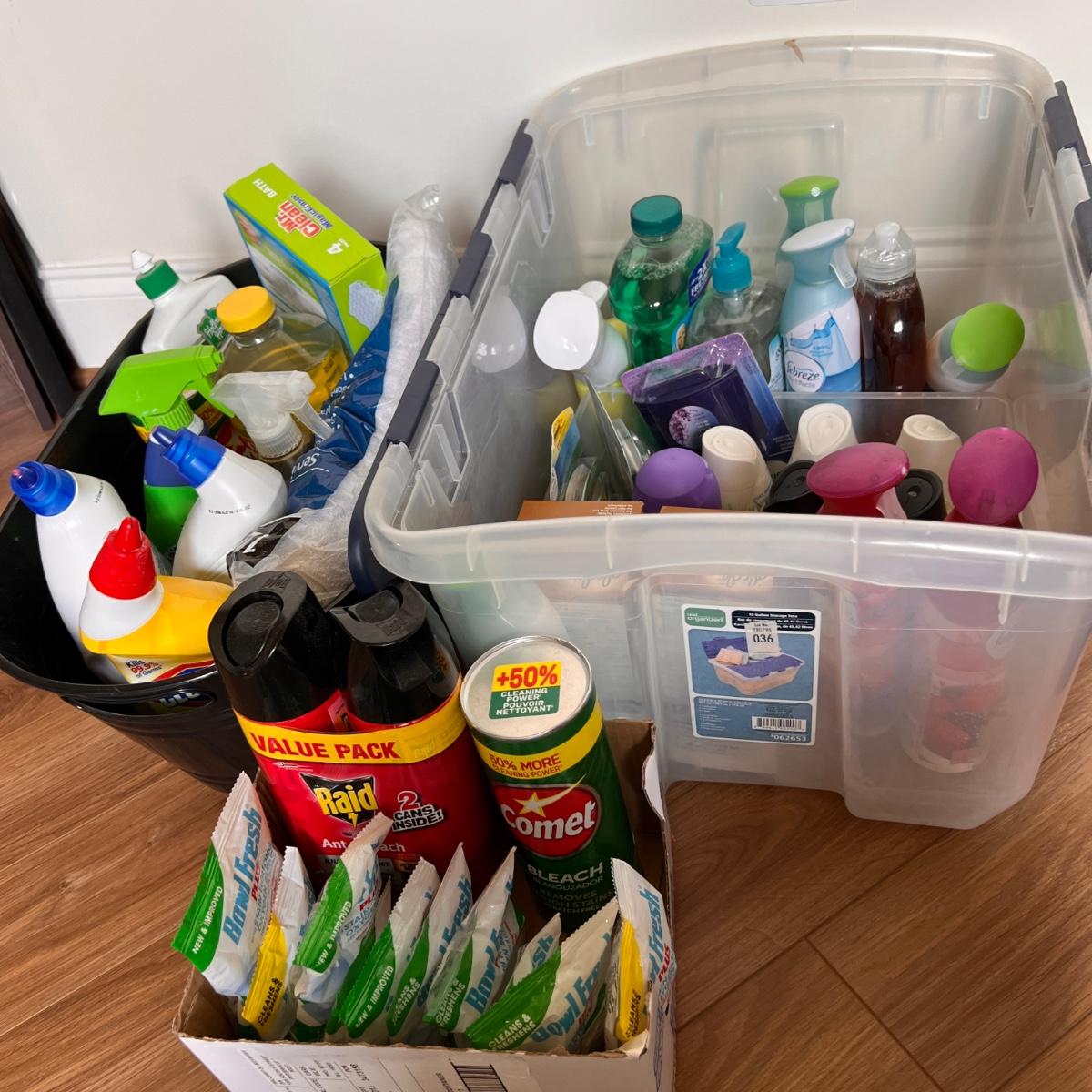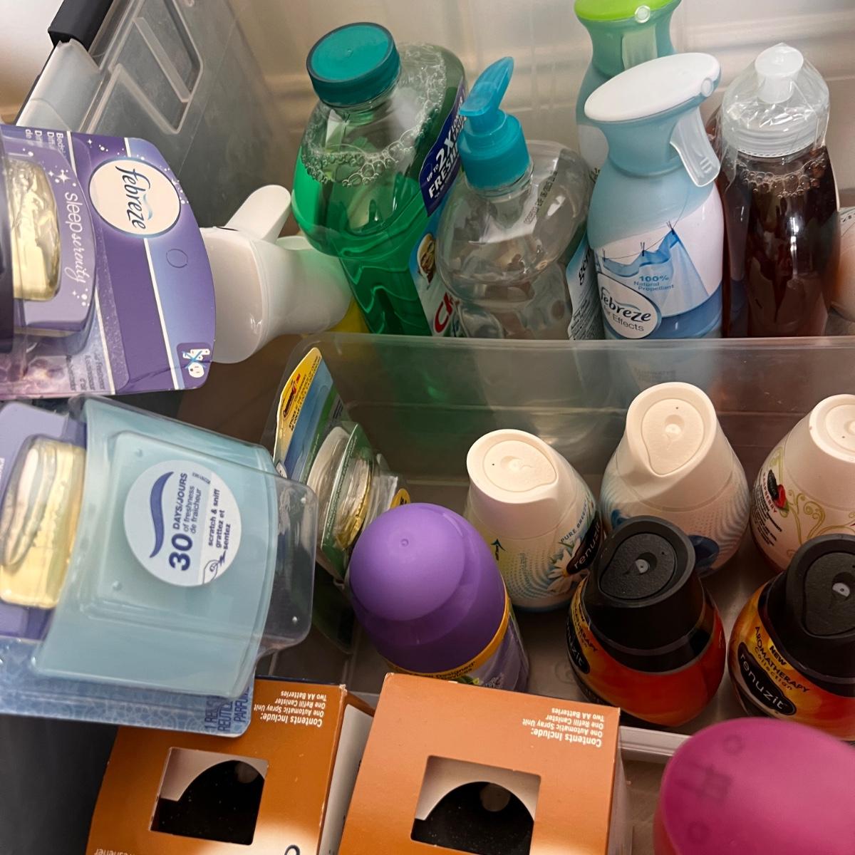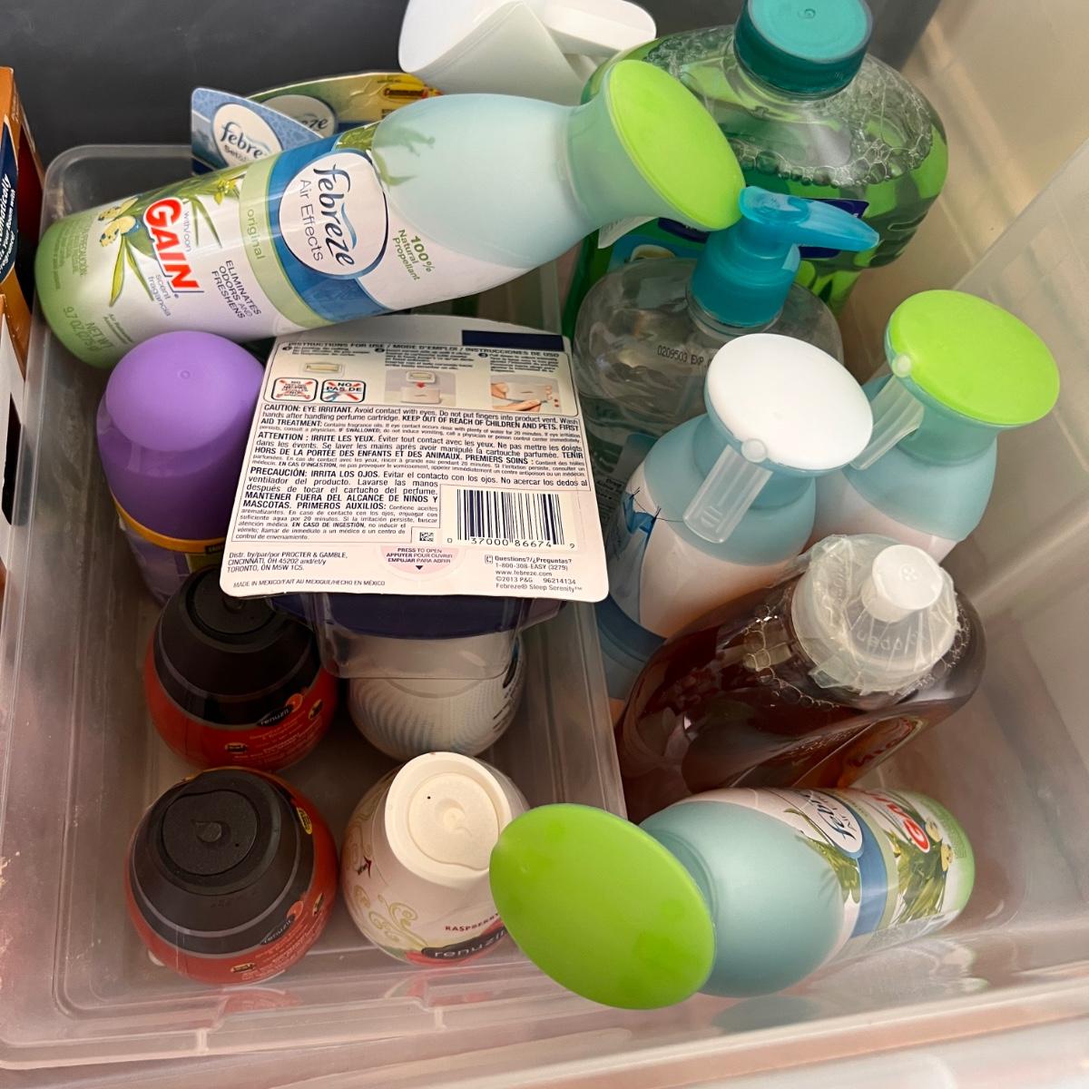 Soap, cleaning fluid, magic erasers, comet, toilet bowl fresheners and cleaners, fabreeze, air fresheners.