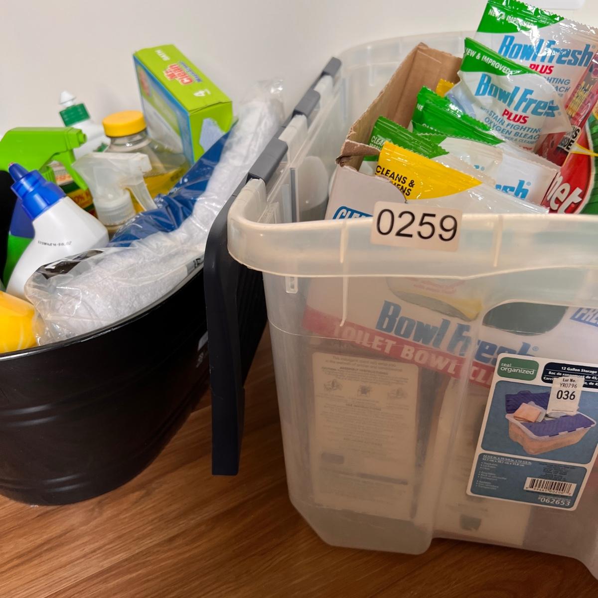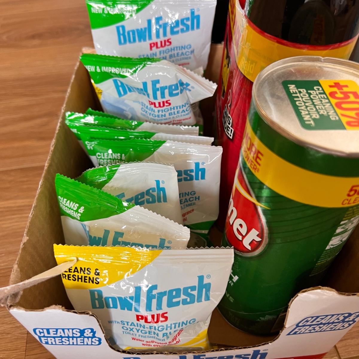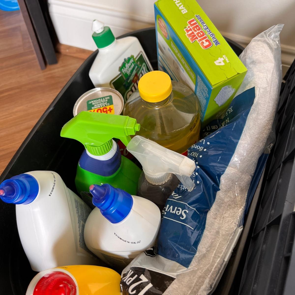 Soap, cleaning fluid, magic erasers, comet, toilet bowl fresheners and cleaners, fabreeze, air fresheners.