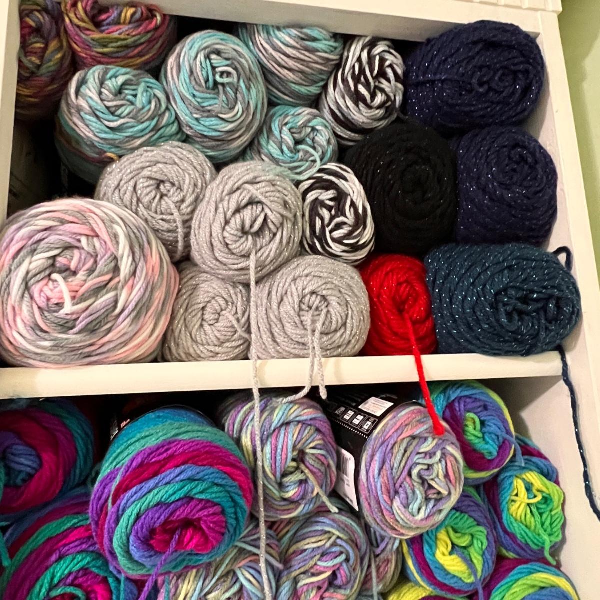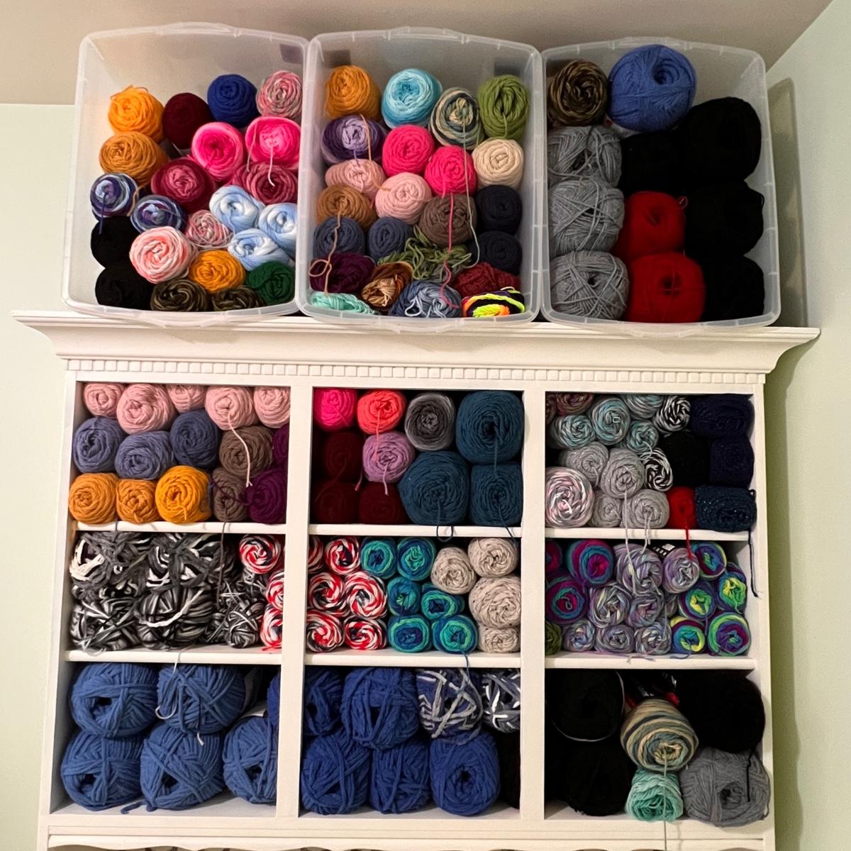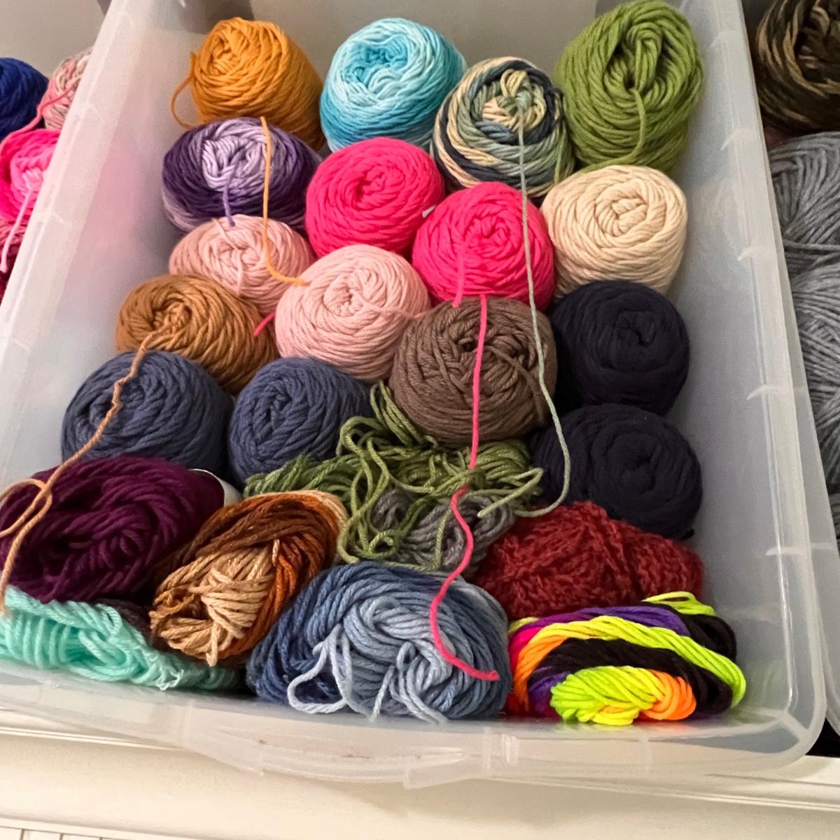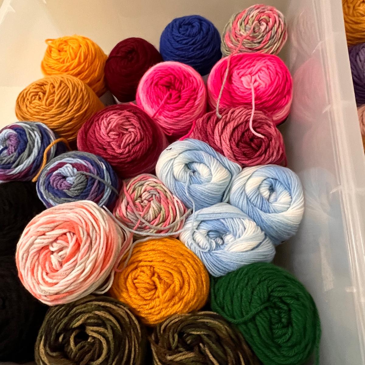 Tons of yarn! New with tags. Various colors and textures. This auction is for the yarn and plastic storage bins only.