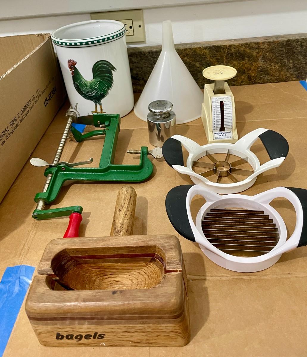 Includes a counter-mounted apple corer, bagel slicer and kitchen tool caddy.