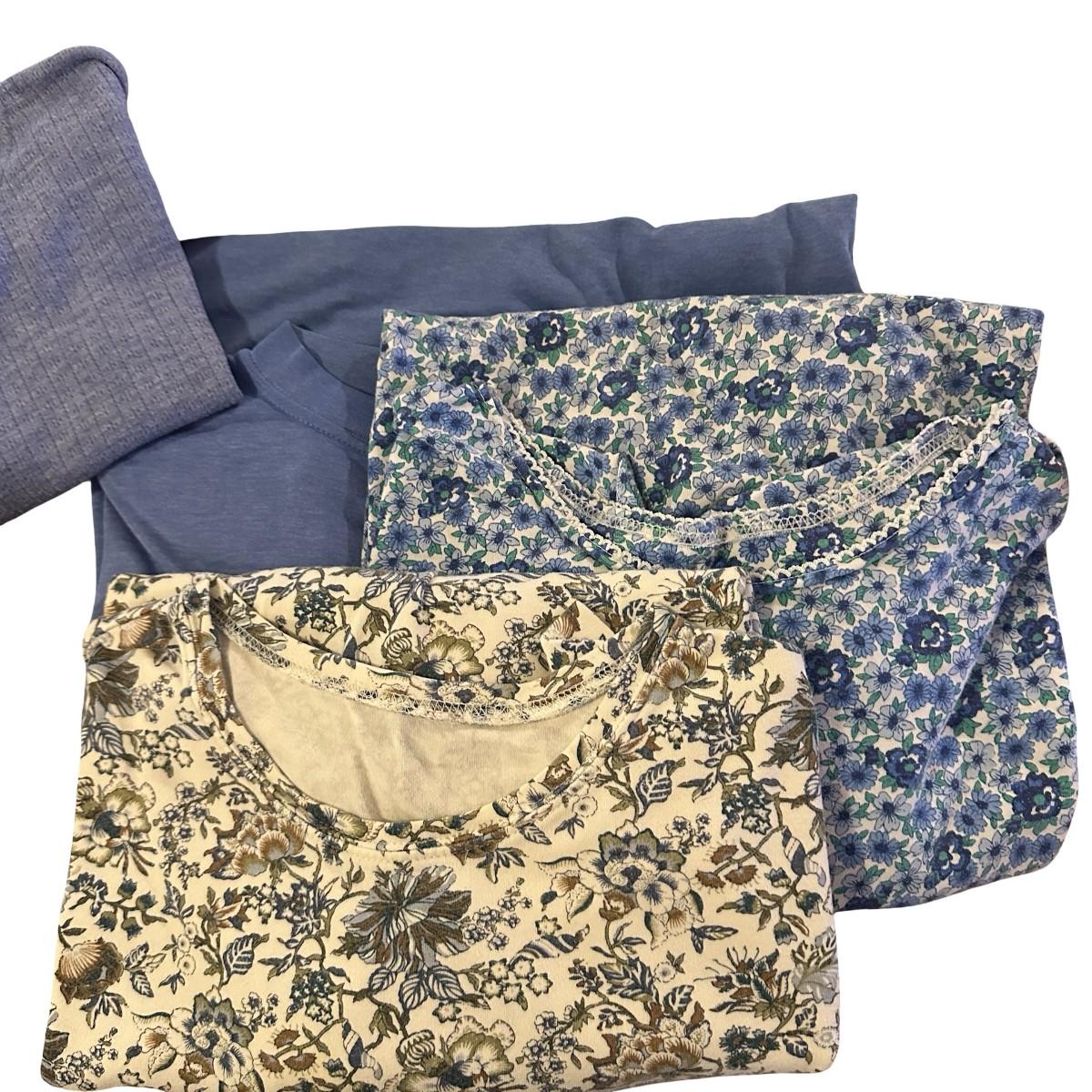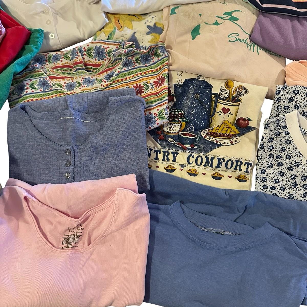 These are all pullover knit shirts and most have the tags cut out. They seem to be Large and XLarge and all in good condition. Also the shorts are cotton elastic waistband and 14-16W sizes. No stains detected, but worn and washed.