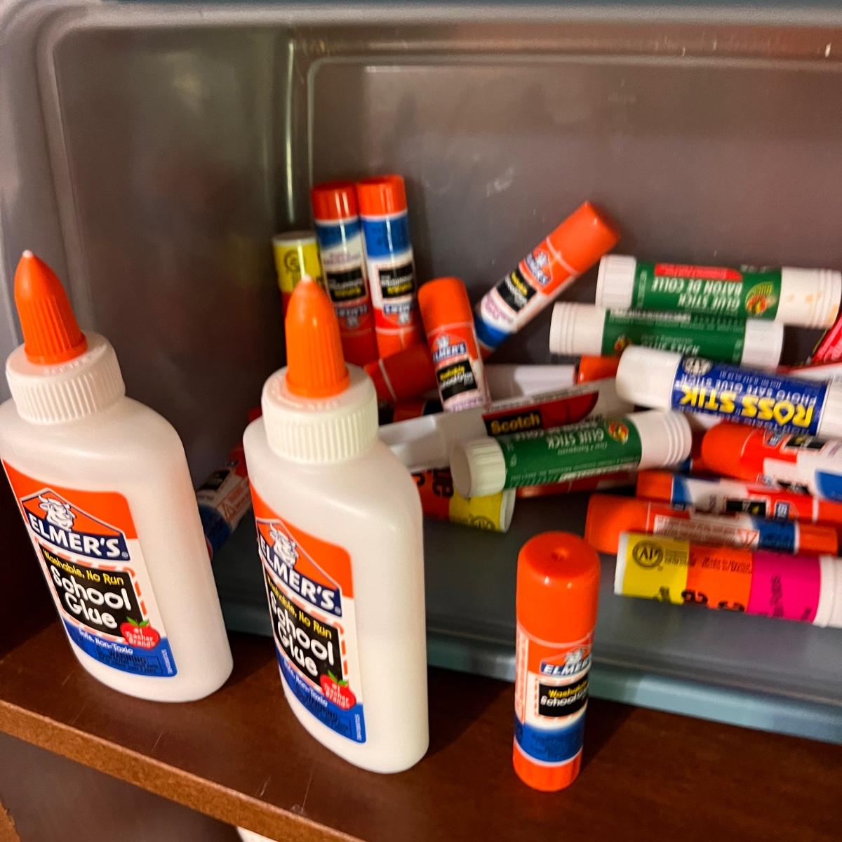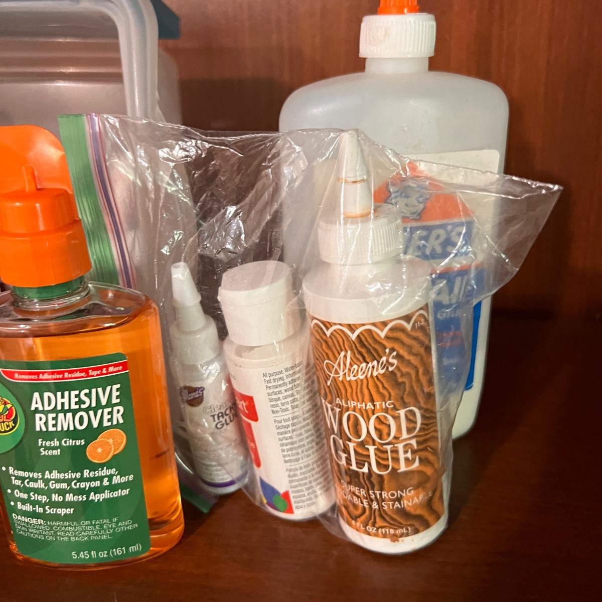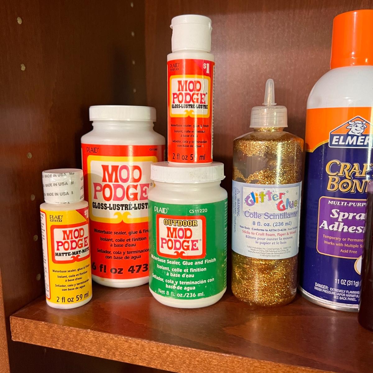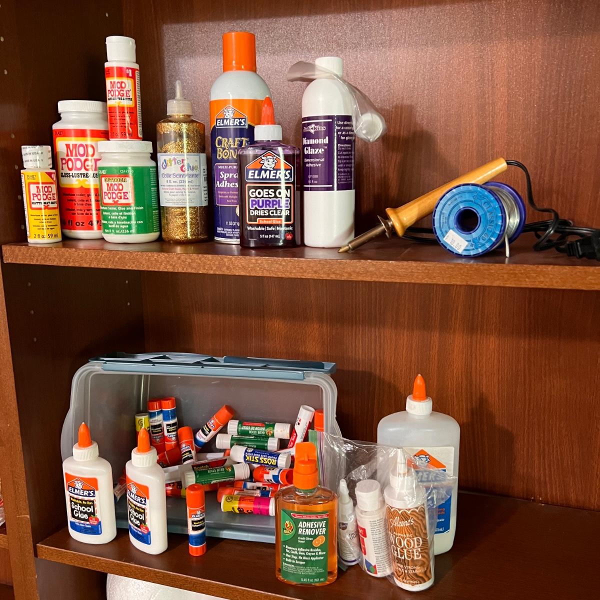 Bottles of Mod Podge, spray craft glue, jewelry resin, glue sticks, soldering iron with soldering spool, goo gone, fabric glue and more. Some new some partially used.