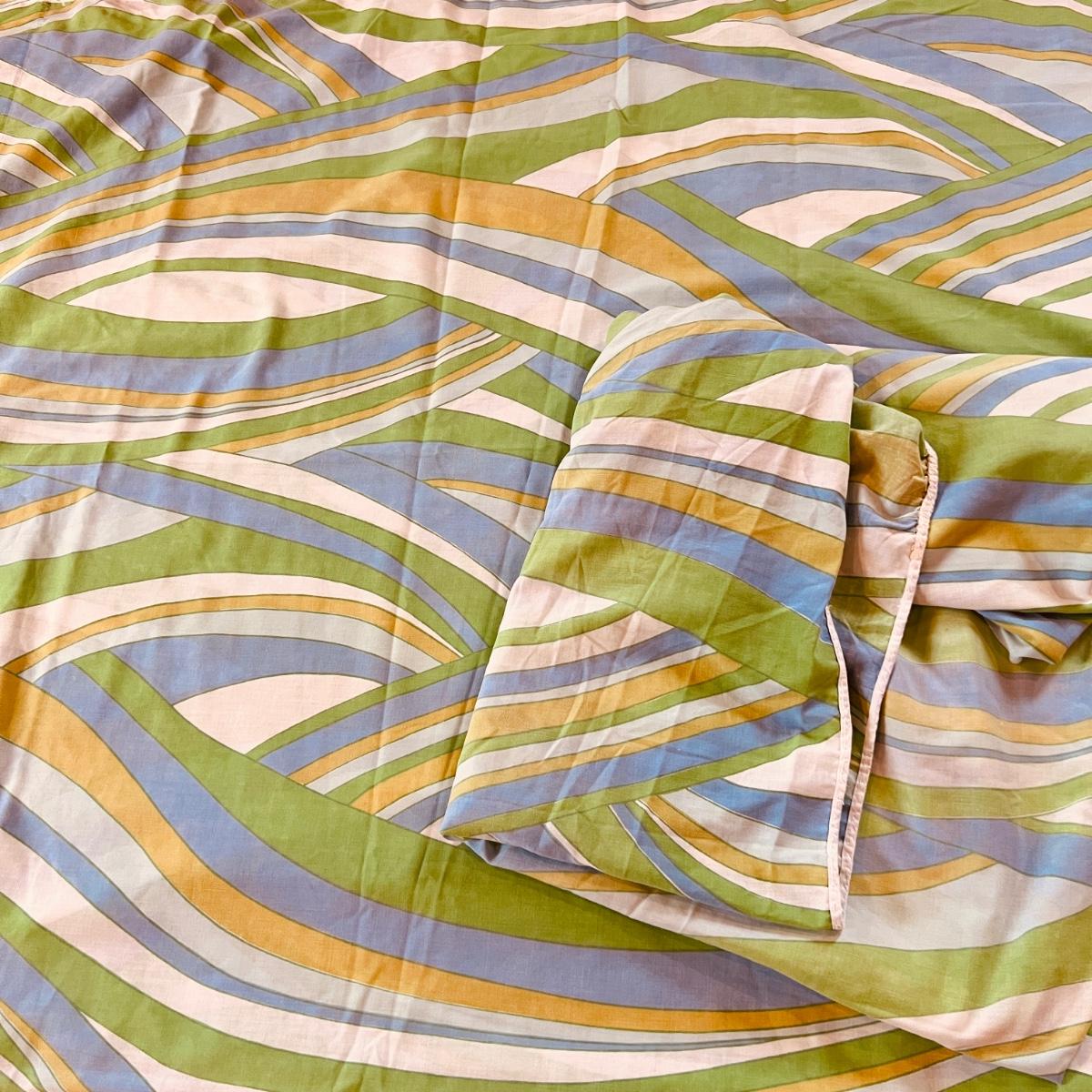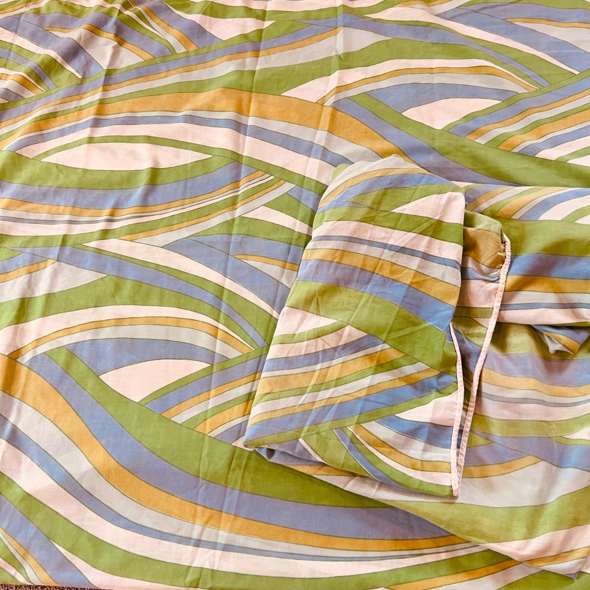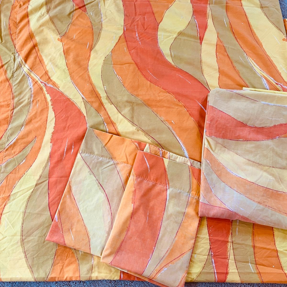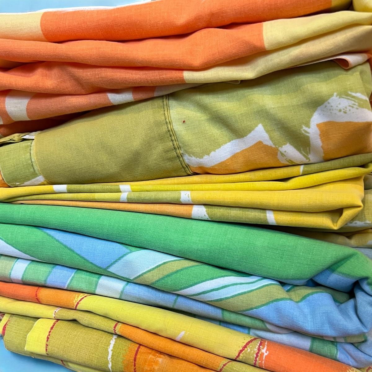 Blue green set includes top bottom and pillowcase. 2 orange yellow greenish sets include tops botttoms and 2 pillow cases. 1 set striped top circle bottom. All are size FULL. These are in used vintage condition. Some colors are bright and some are faded. See all pics for details.