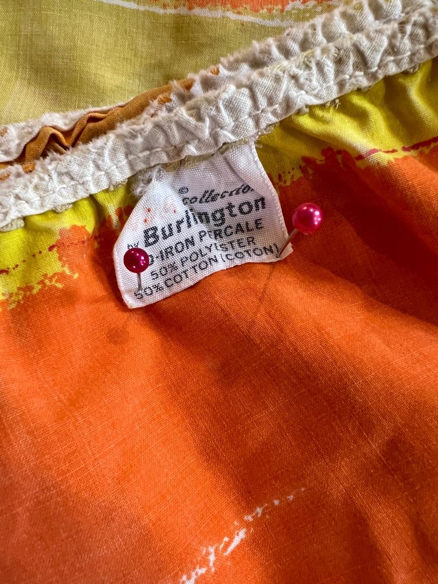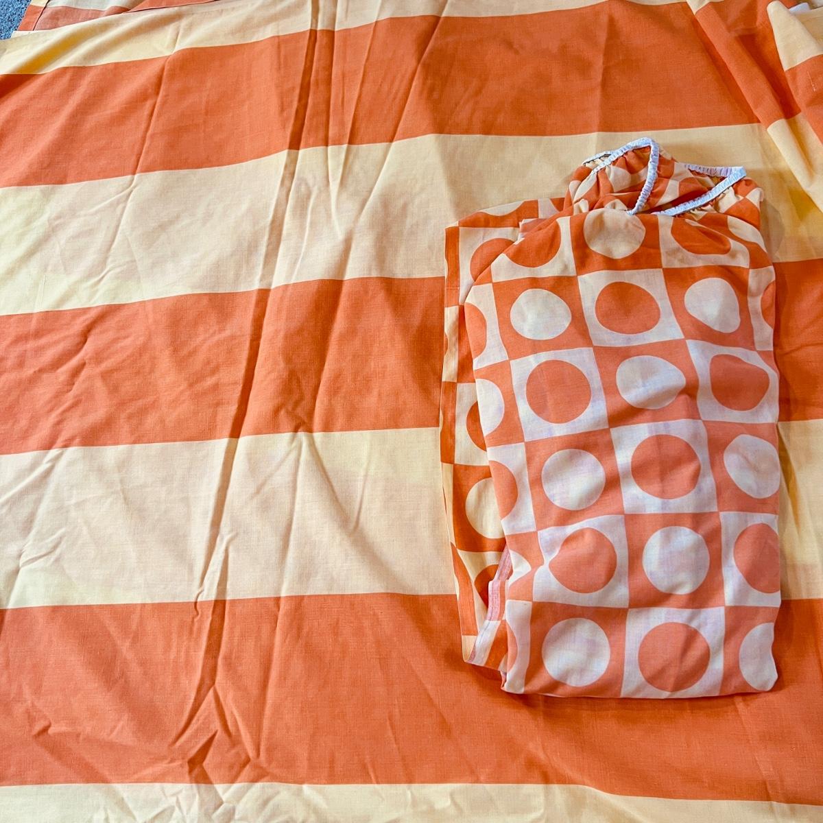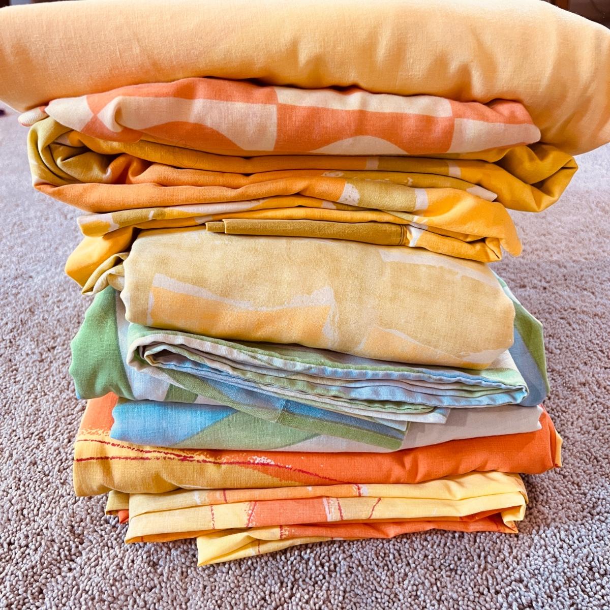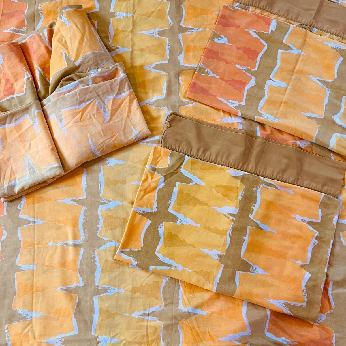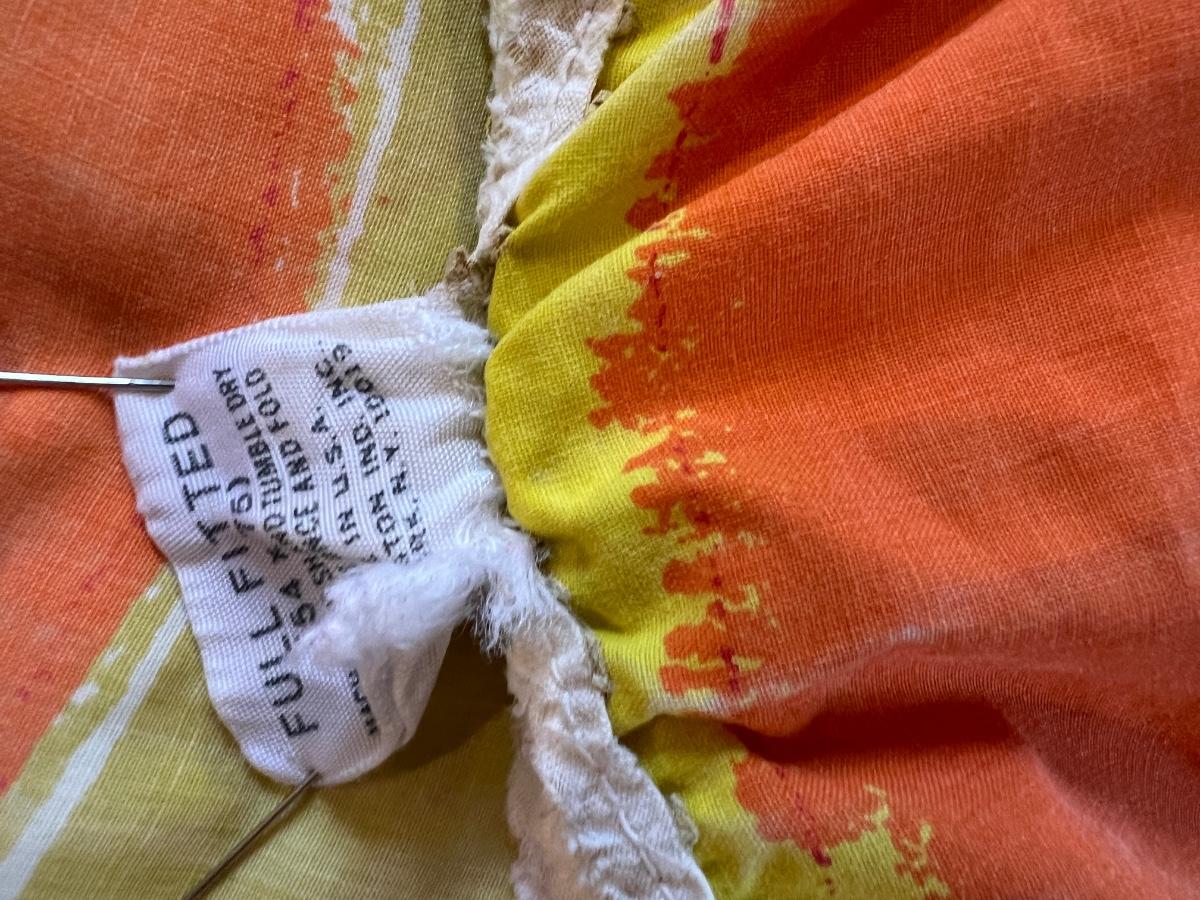 Blue green set includes top bottom and pillowcase. 2 orange yellow greenish sets include tops botttoms and 2 pillow cases. 1 set striped top circle bottom. All are size FULL. These are in used vintage condition. Some colors are bright and some are faded. See all pics for details.