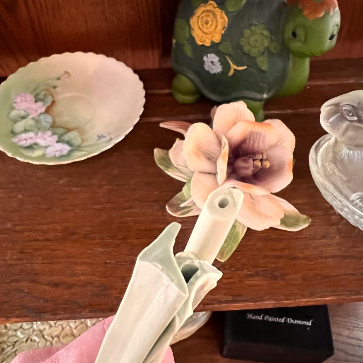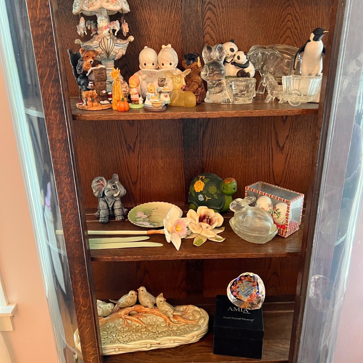 K's Collection, Precious Moments, Gorham, 1982 World Fair Tennessee. Includes Ceramic Tree Branch Dish With Positionable Birds, figurines, musical figurines, dishes, figural bowls, Amia Denver Co diamond shaped paperweight. Porcelain flower with 2 long stems have breaks as shown in pics.