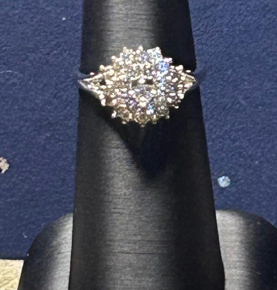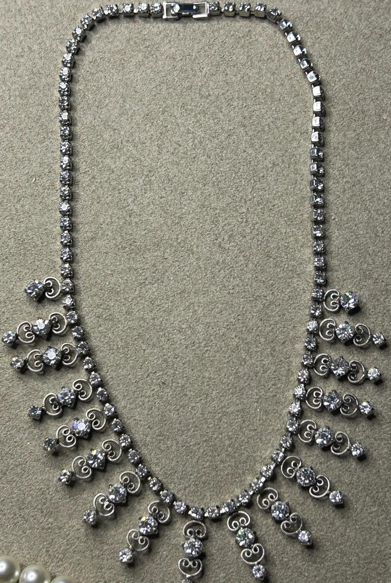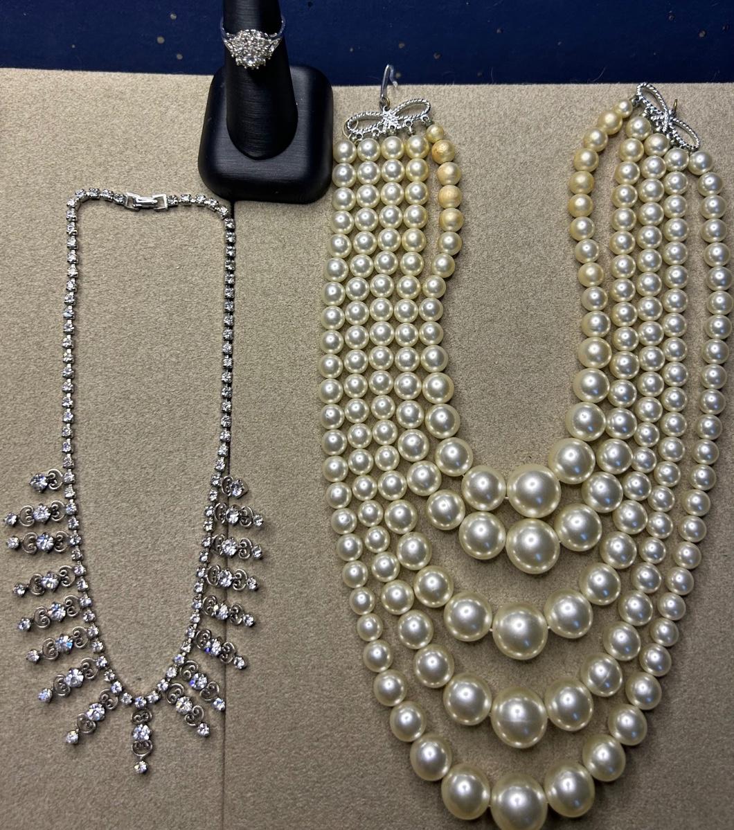 Vintage five strand, faux pearl necklace is stamped Japan, & the ring is stamped sterling