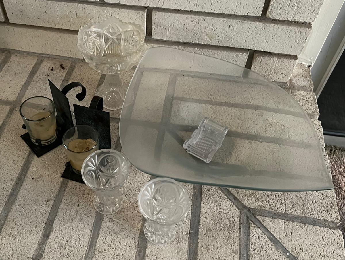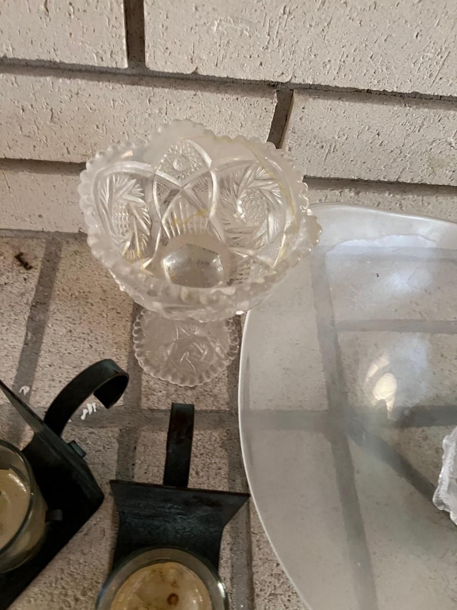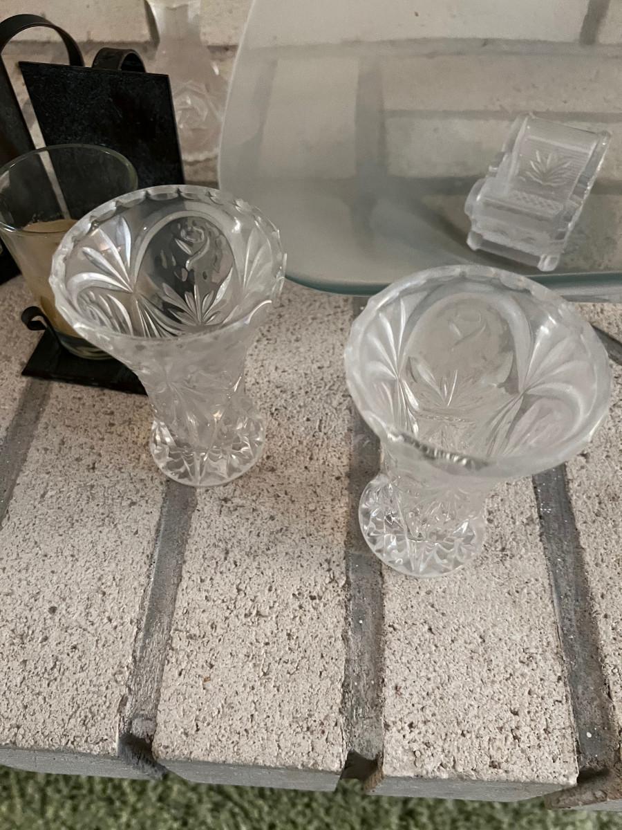 Big Pile of Clear glass Vases, Candle Holder, and a Candy Dish