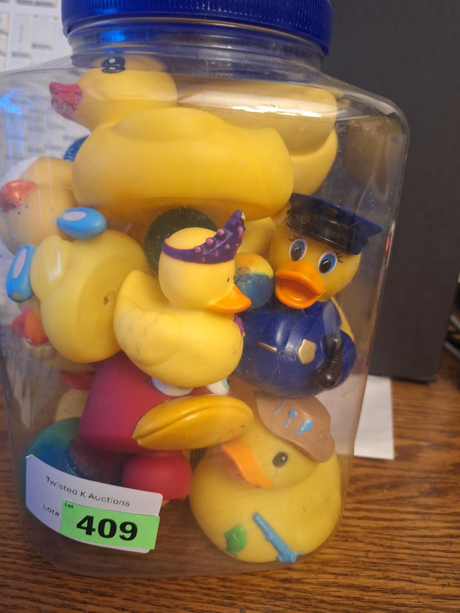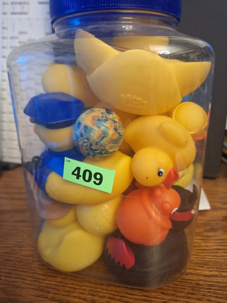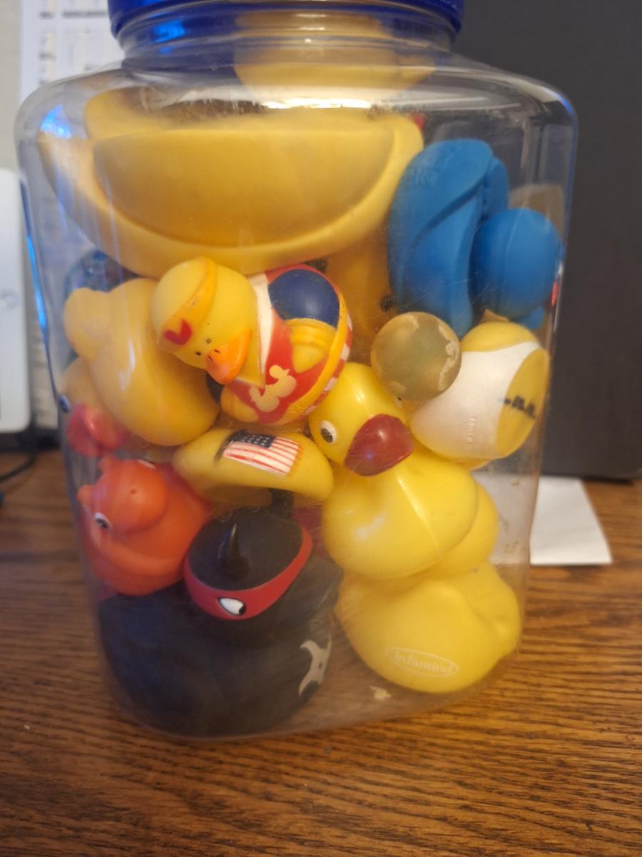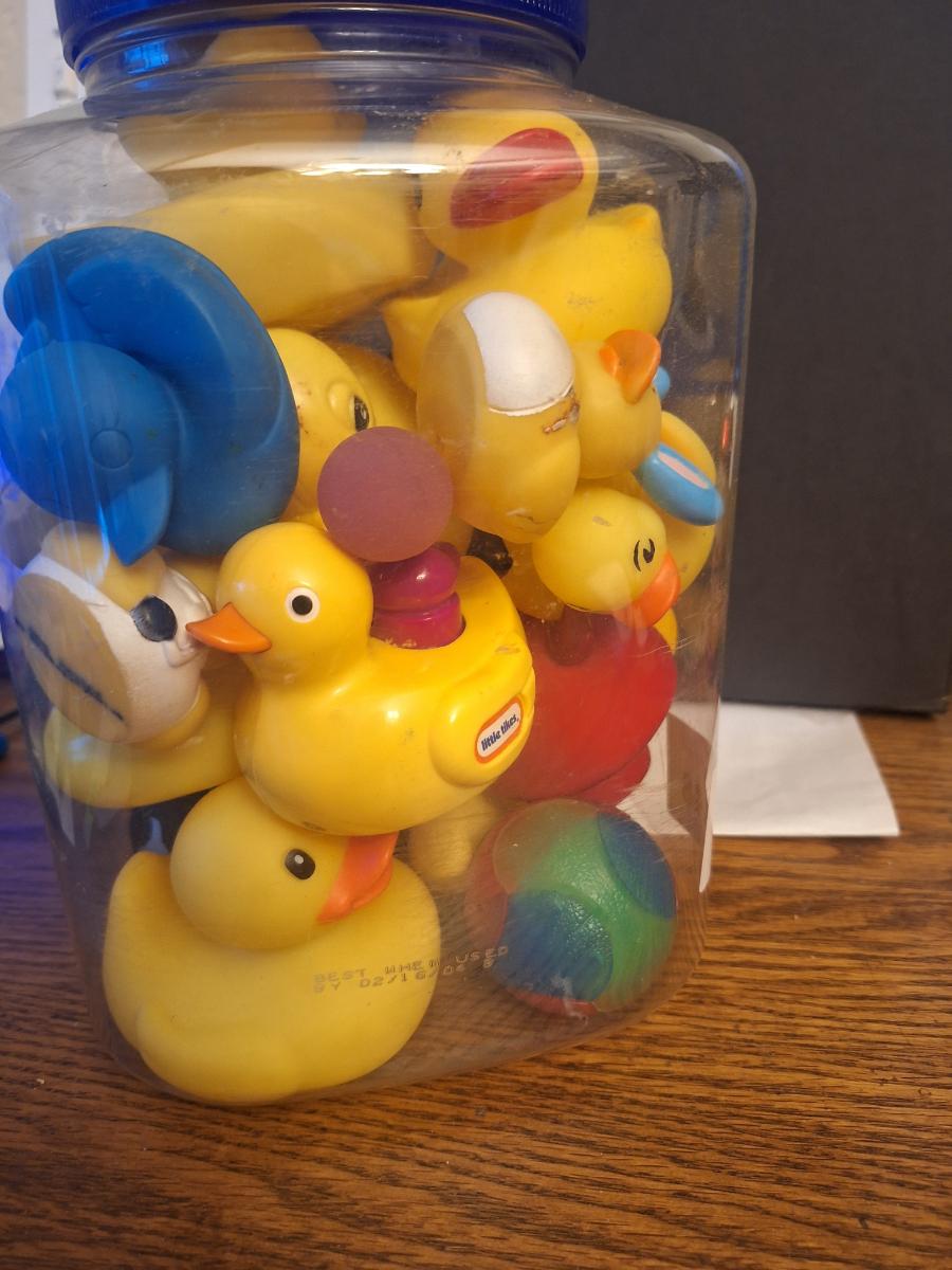 Big plastic jar of rubber ducks
