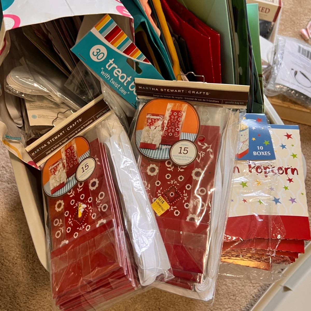 Overflowing bin full of wrapping paper, boxes, bags, bows, name tags. Some martha stewart items new in packages. Storage bin included.