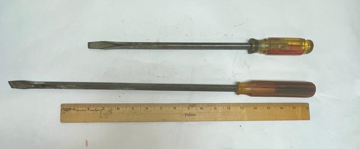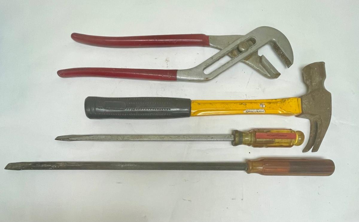 Lot includes 4 extra-large tools: Slip-Lock pliers, Framing Hammer, and 2 Standard slotted screwdrivers. Ruler used in the photos is 18" long.