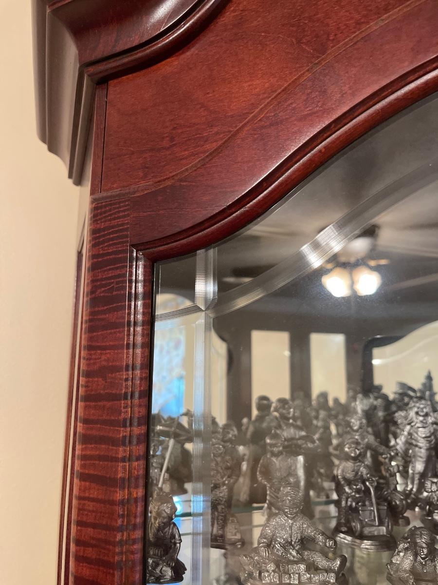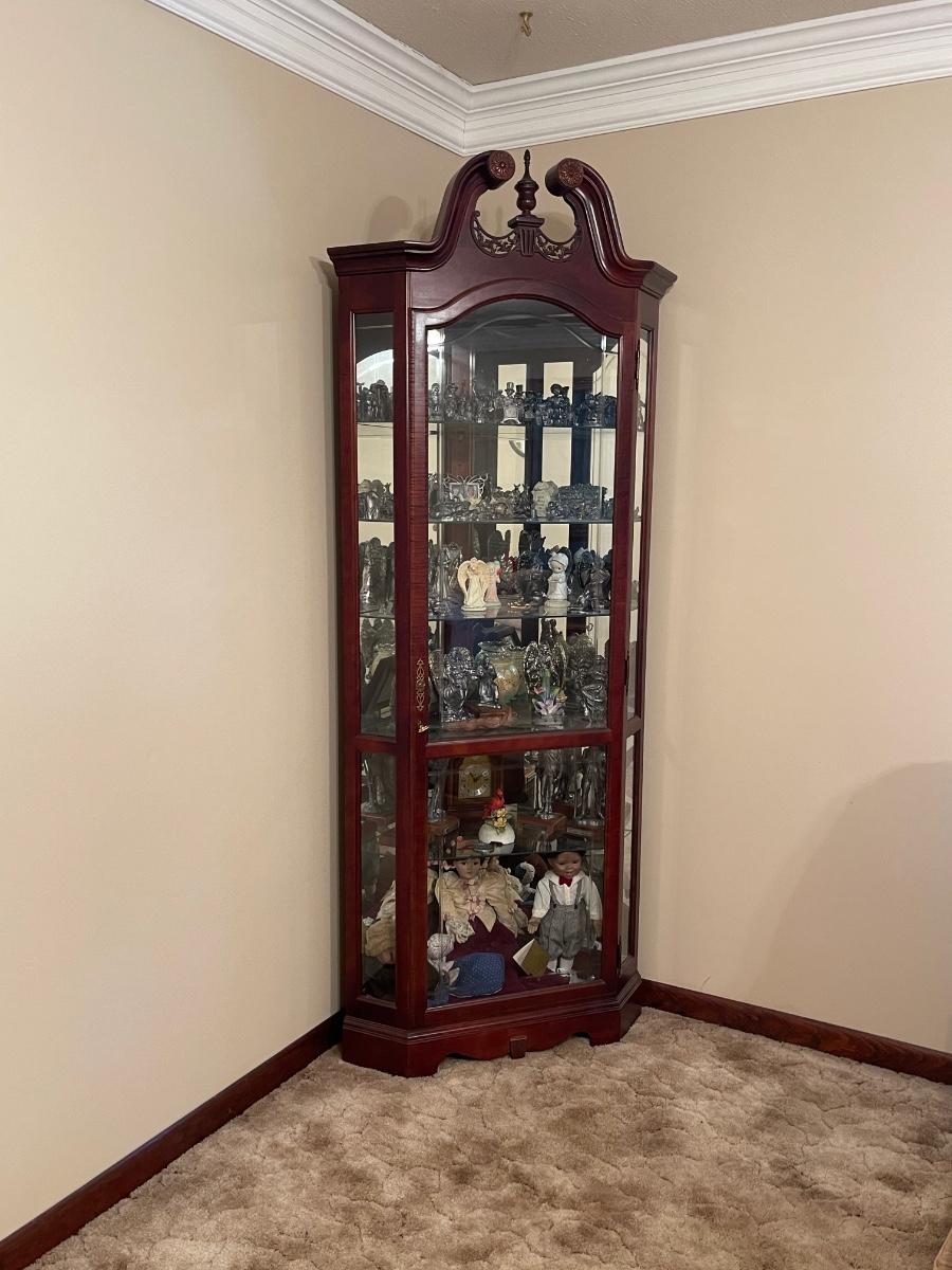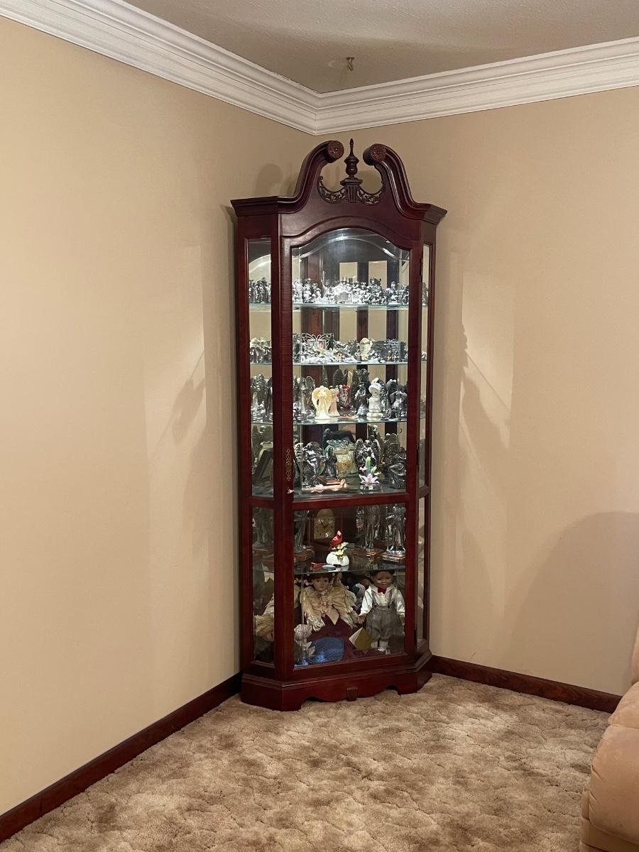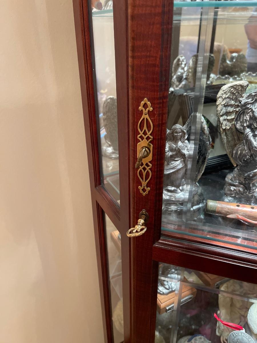 Has Key, 5 glass shelves ~ Excellent ~ Decorative front glass ~ contents not included ~ 84” H x 19” D x 34” W