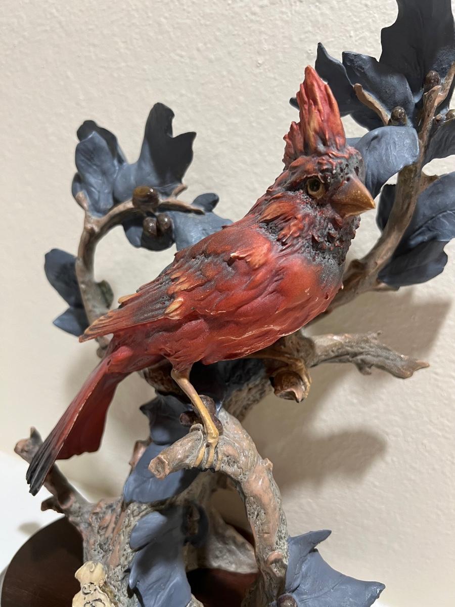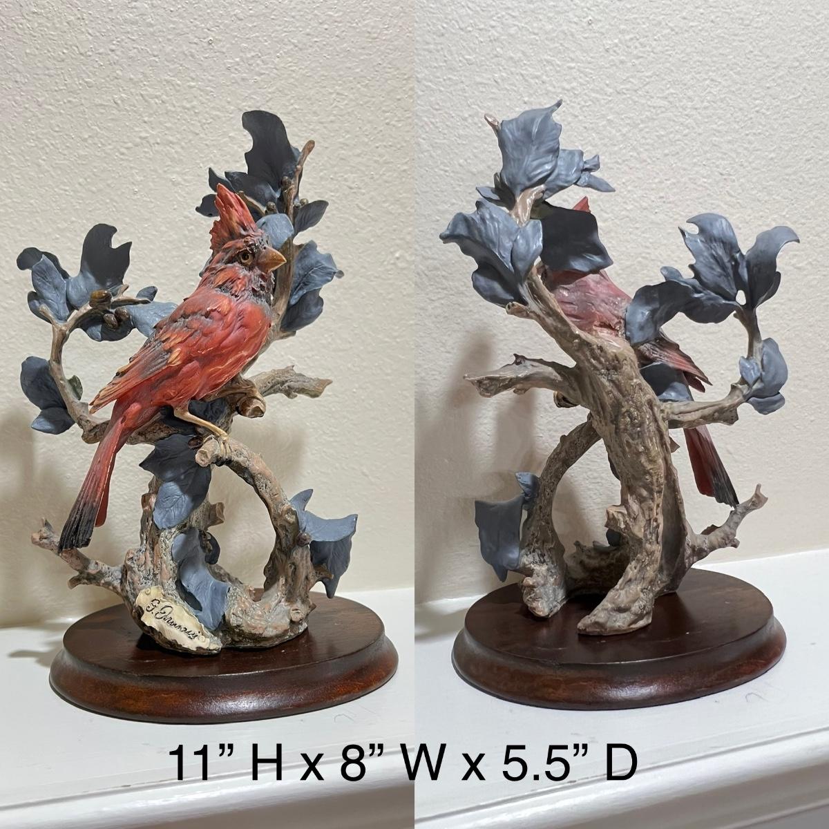 Both figurines are made of a resin like material. The Sparrow is attached to the stand. The cardinal is not attached to the stand. See pictures for measurements.