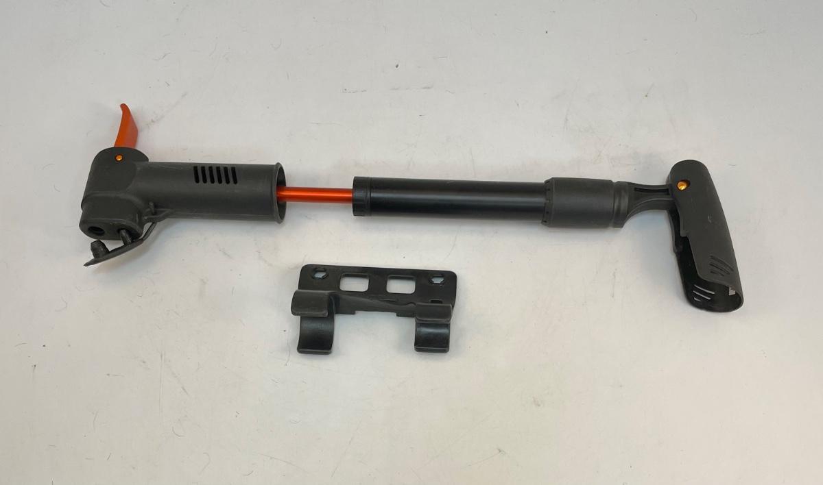 Frame mounted bike pump. Dual head fits Presta and Schrader valves. Pivoting handle for better grip. Large alloy locking lever grips valve tightly.
