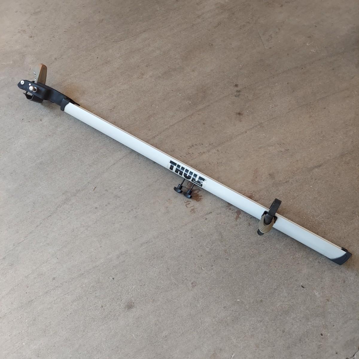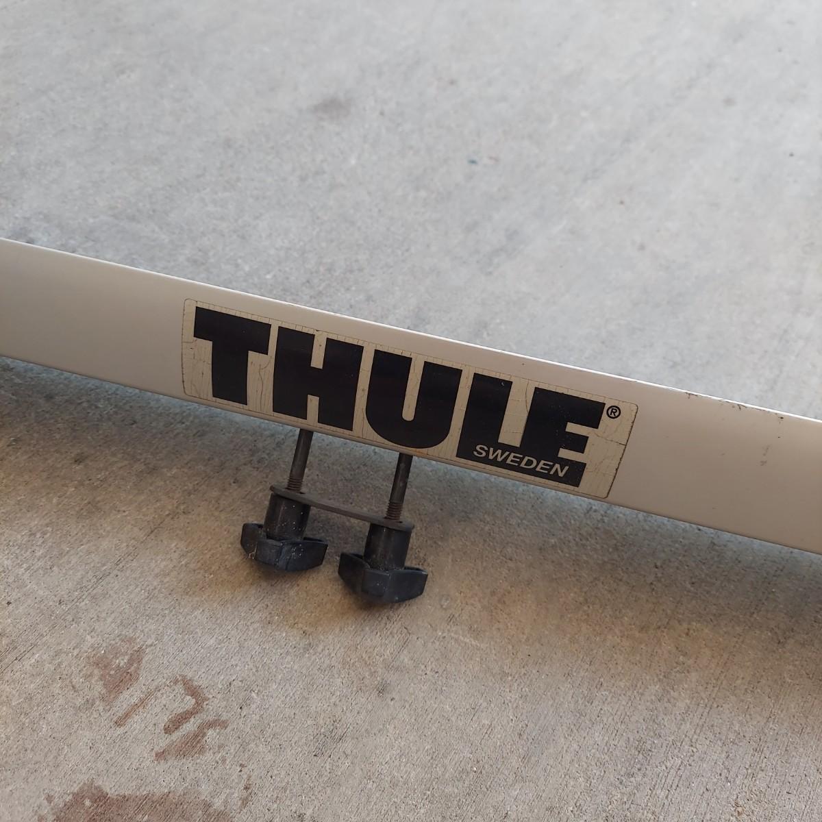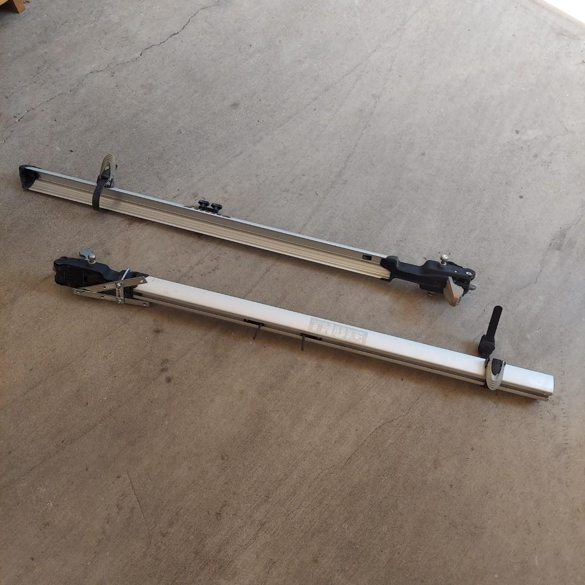 Lot includes two Thule ThruRide, QR/Thru Axle system Roof Rack roof mount bike racks. One is newer. The other is older and has been modified a bit. It's also missing the nuts to the two bolts that attach on end. Each is roughly 53” long. Please see photos for details. Local Pickup Only