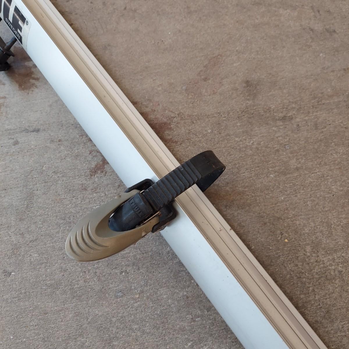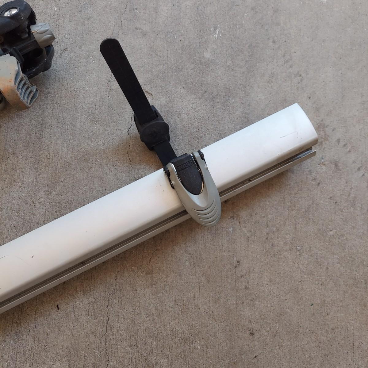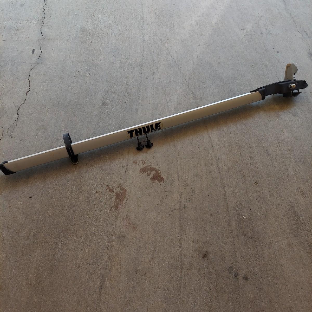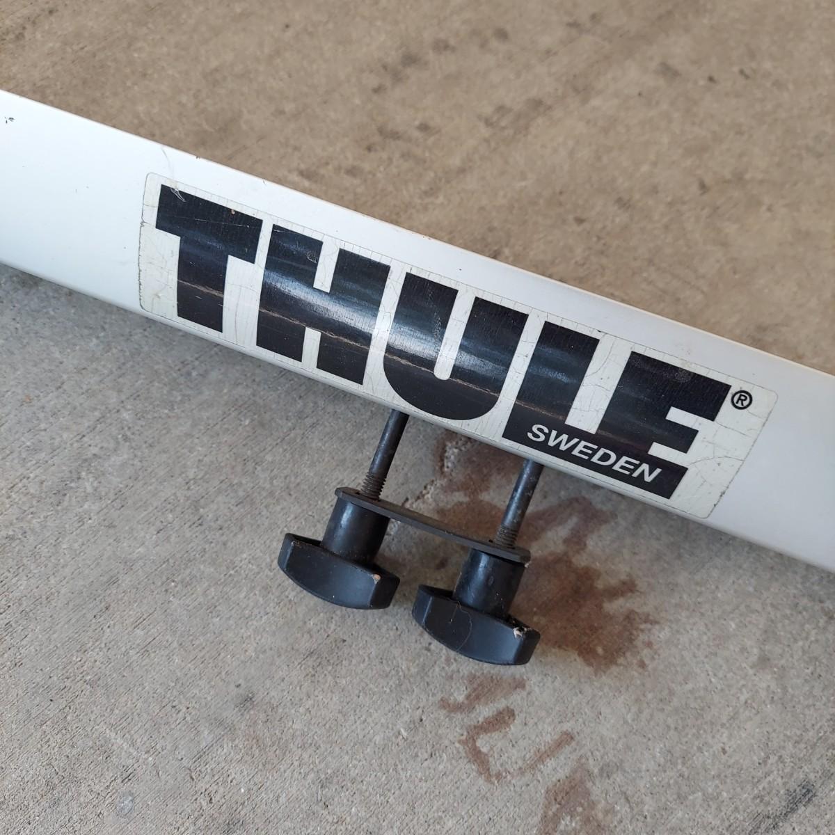 Lot includes two Thule ThruRide, QR/Thru Axle system Roof Rack roof mount bike racks. One is newer. The other is older and has been modified a bit. It's also missing the nuts to the two bolts that attach on end. Each is roughly 53” long. Please see photos for details. Local Pickup Only