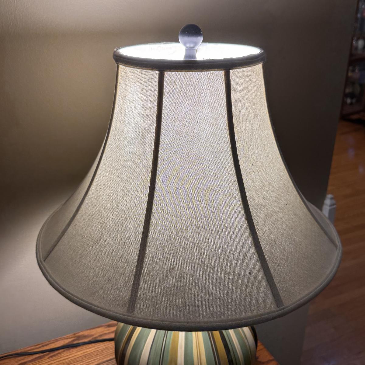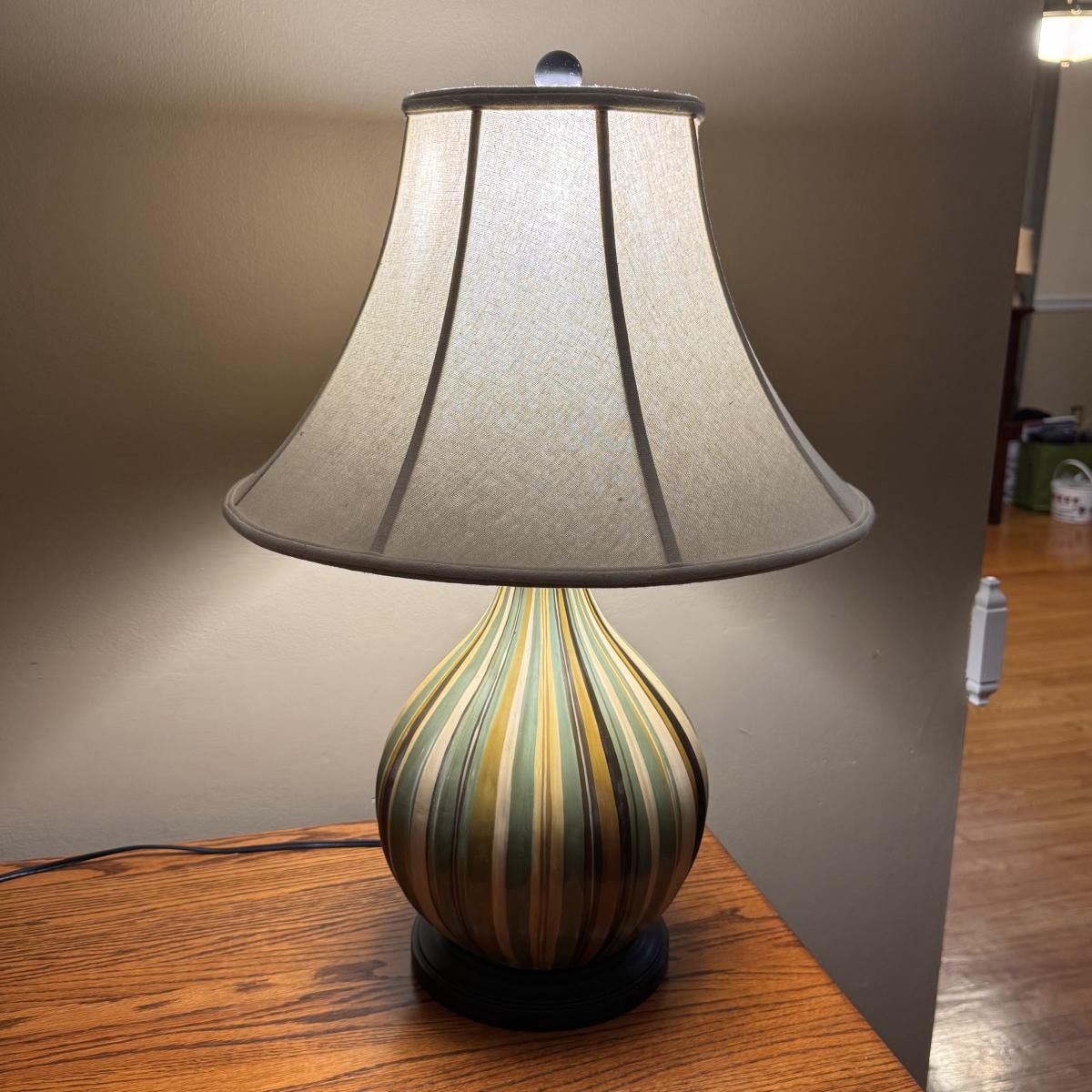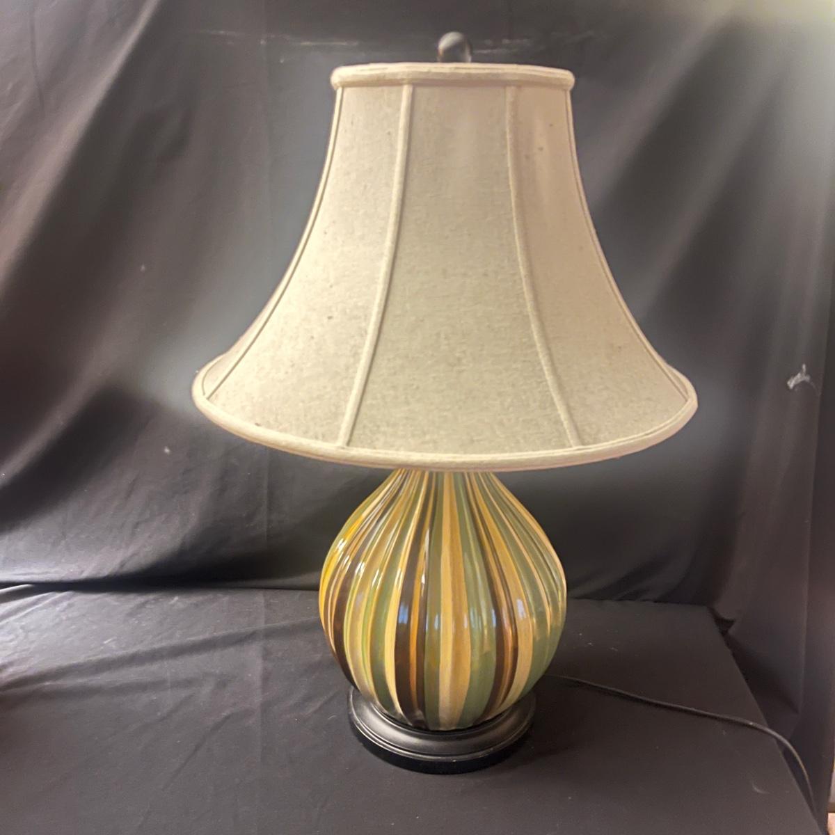 Lot includes one large lamp with a lampshade marked with Bill Blass. The lamp appears to be ceramic with a wooden base. The lamp, with the shade included, measures 18” x 25”H. There’s one small rip on the inside of the lampshade - see picture included. The rip is not on the outside, therefore it’s not visible. Shipping available. Shipping can be costly. We suggest contacting our preferred local shipping provider, Postage Express, with dimensions and getting an estimate before bidding: (828) 255-9250 or shipping@postageexpressnc.com.