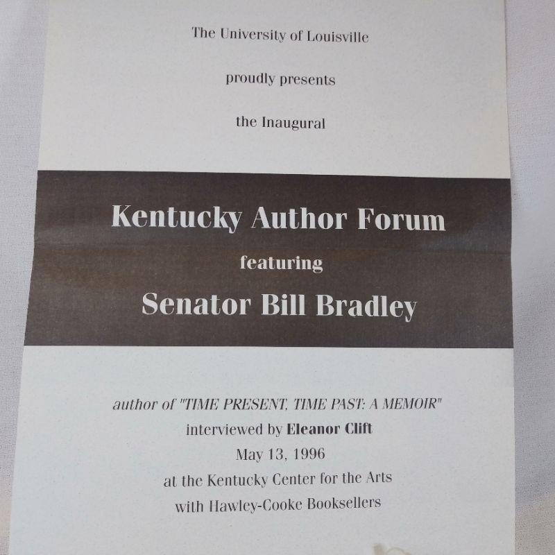 "Time Present, Time Past" A Memoir by Bill Bradley. Bill is a Kentucky author, basketball Hall of Famer and Senator. Book has 442 pages with intact dust cover. Also included is the inaugural program for Kentucky Forum at KY Center for the Arts - May 13, 1996.