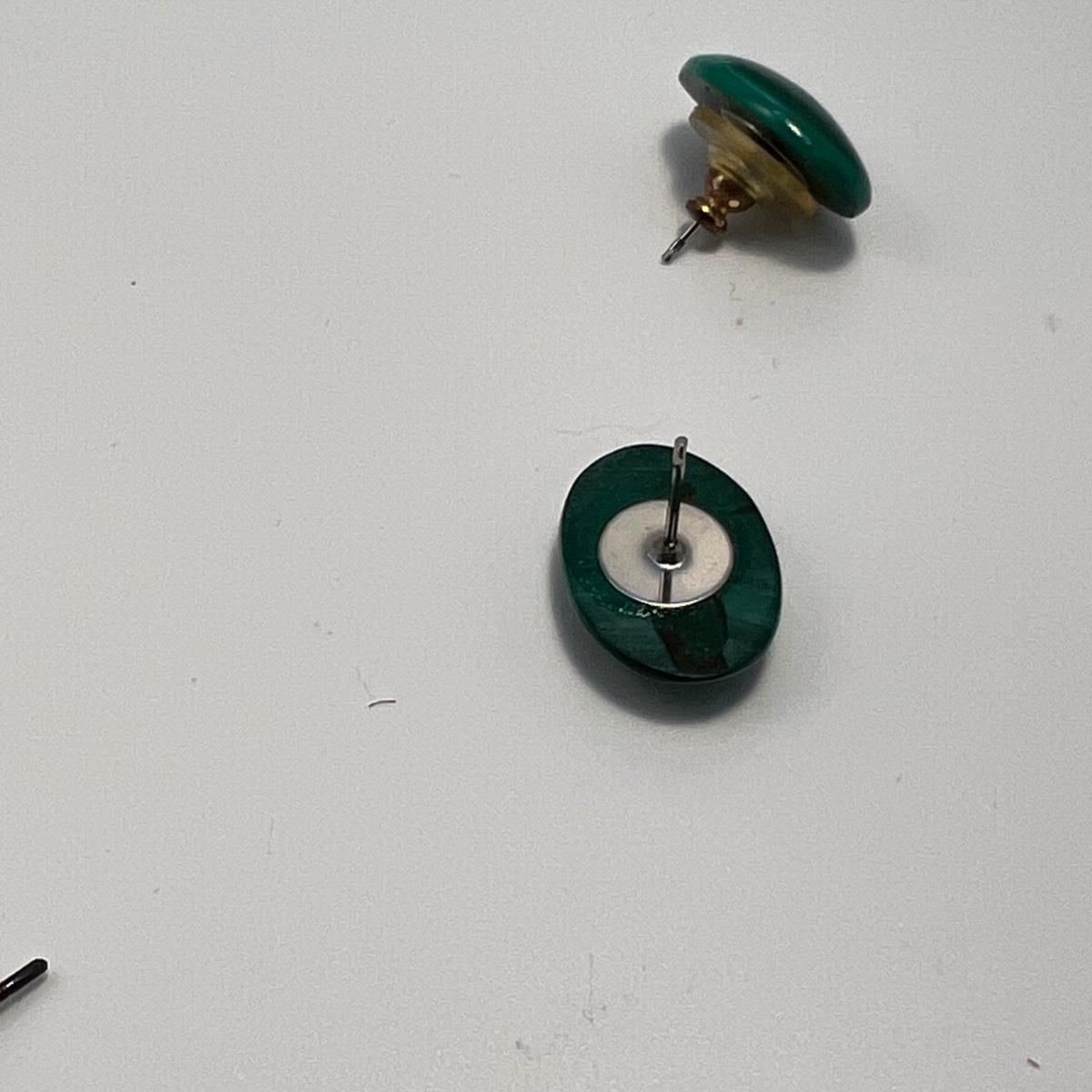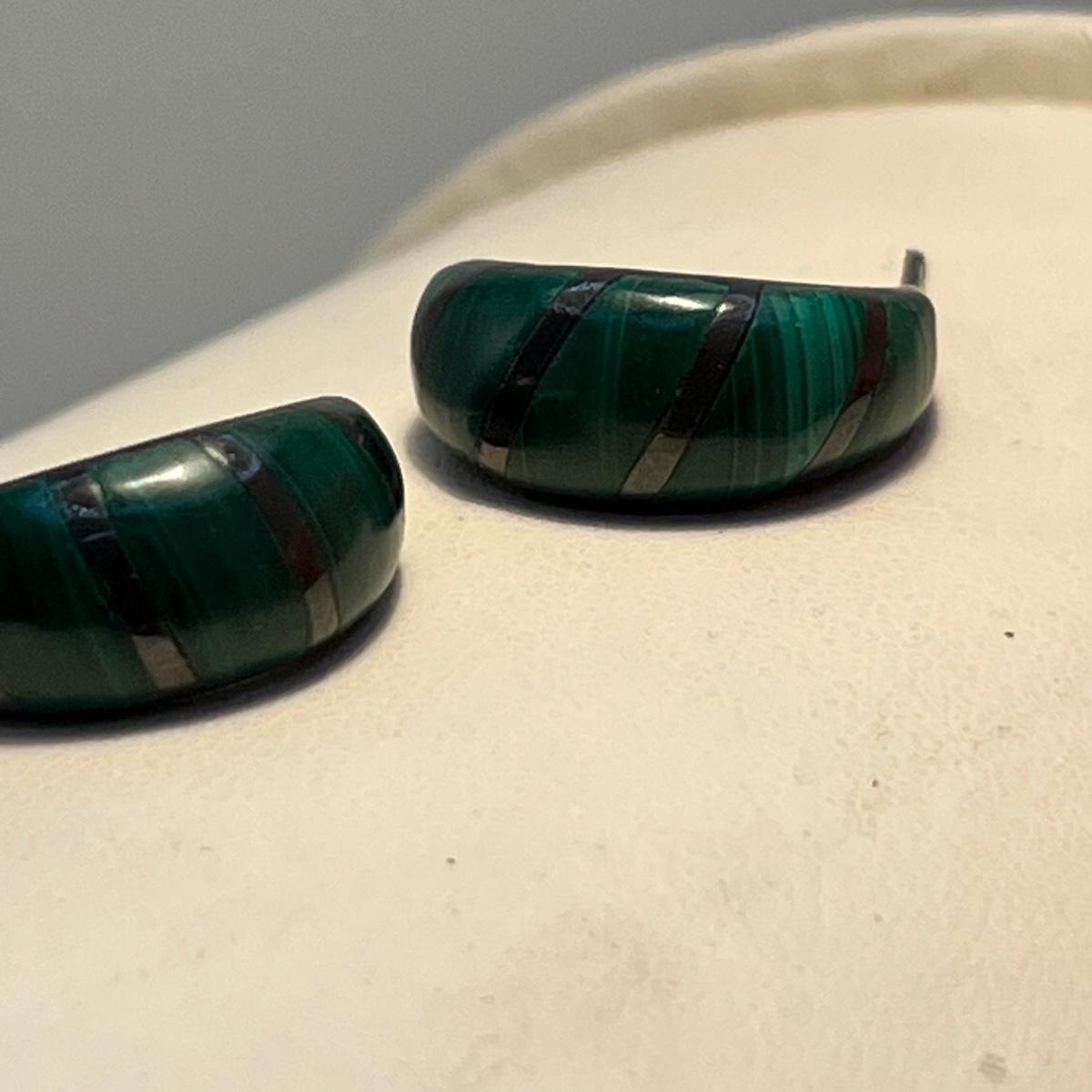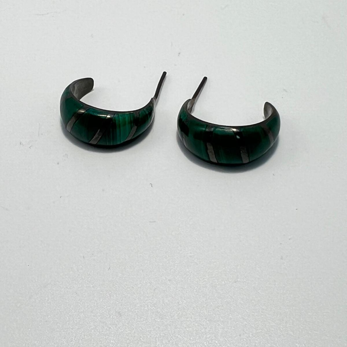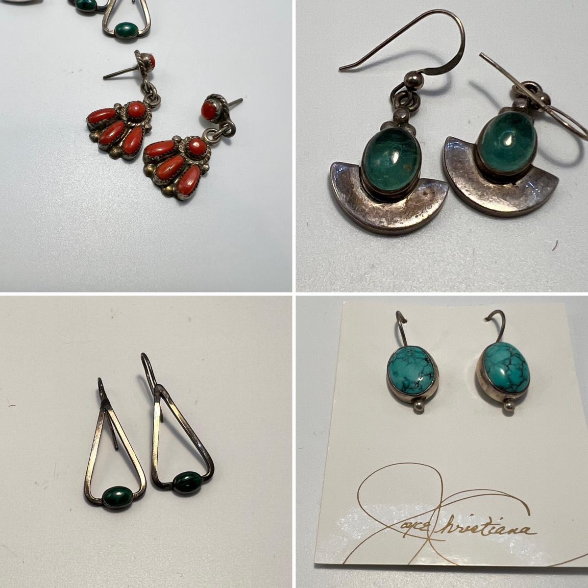 A beautiful assortment of earrings and pendant with stones. The pendant has a large pretty green stone that has the appearance of malachite, encased in sterling. Several other items appear to have malachite stones. All earrings are for pierced ears. Some have sterling marks and these markings are shown in photos when found. No marking was found on the Bill & Lou Zuni dangle earrings that have coral colored beads. The Nature Candles earrings also have no silver mark despite the card description. The oval turquoise earrings have a very faint mark that possibly reads 925, see photo.