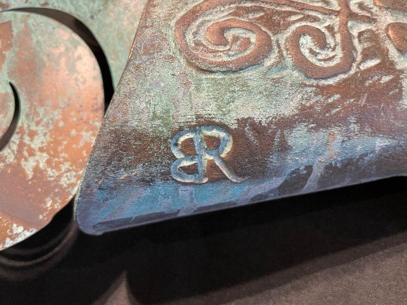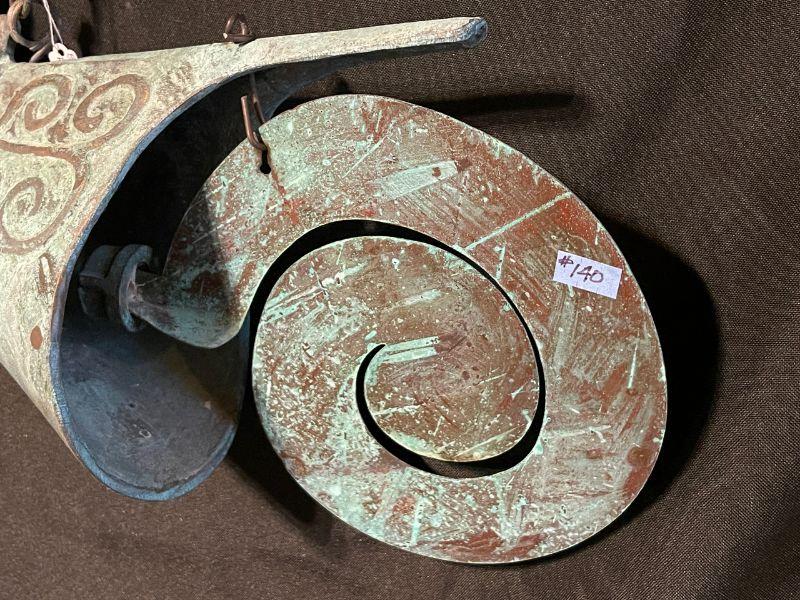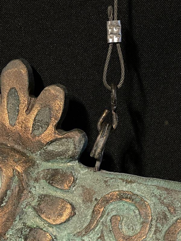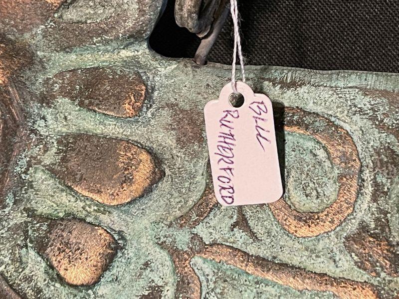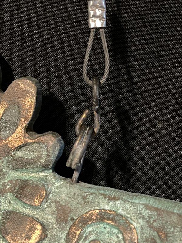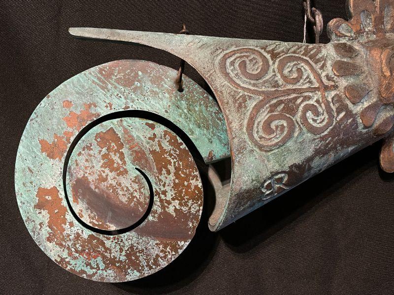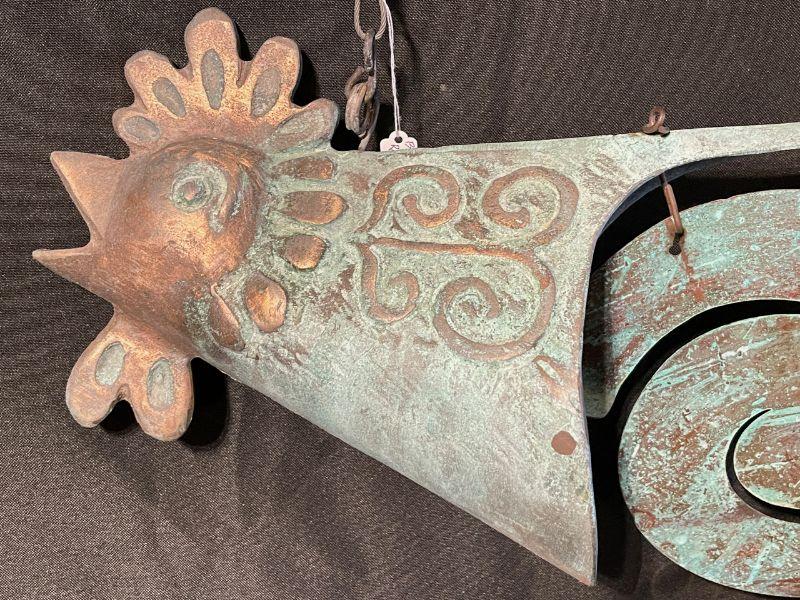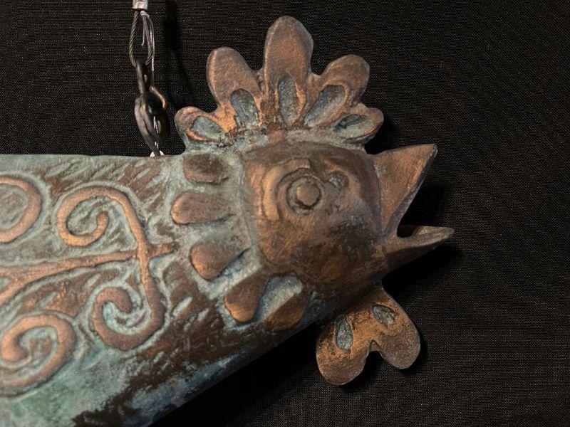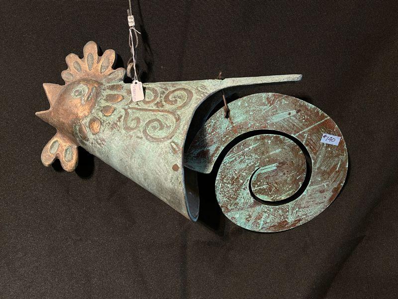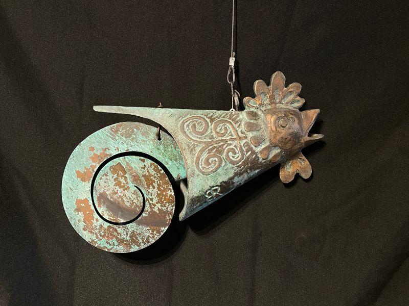 This cast bronze wind bell was created by noted Kansas artist Bill Rutherford. The artist was greatly influenced by the bronze bells of Paolo Solari and started creating these chimes, bells, in the 90's. The rooster shaped bell hangs horizontally as to catch the wind with the curled feather tail which engages the round heavy metal clapper inside the bell. It seems few of these perennial favorites ever come up for sale. Don't miss this very limited edition one!!