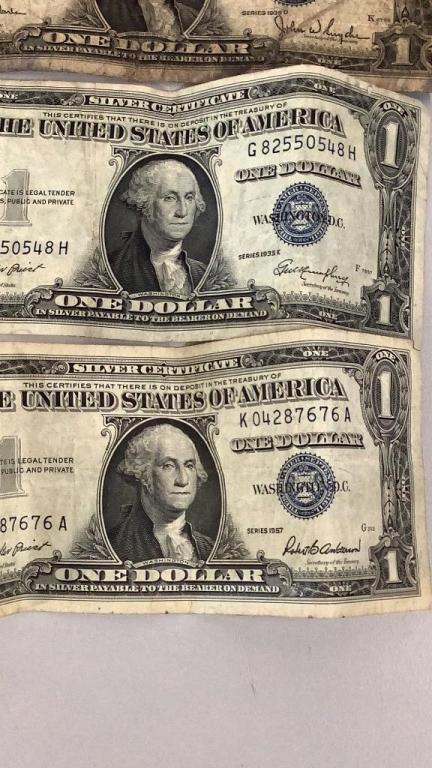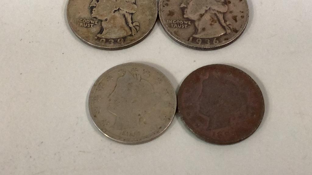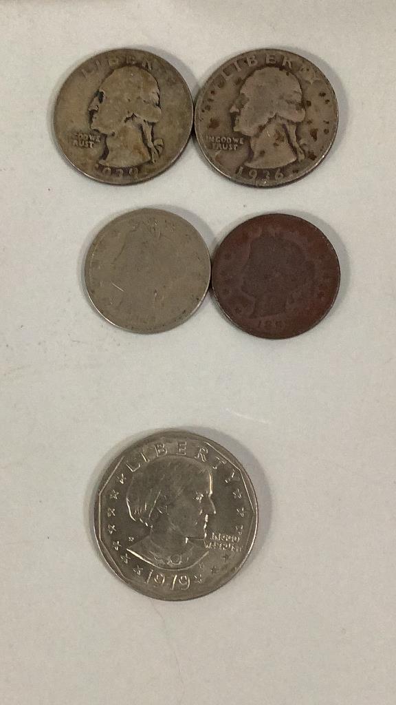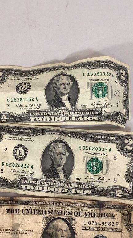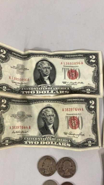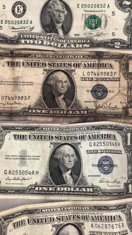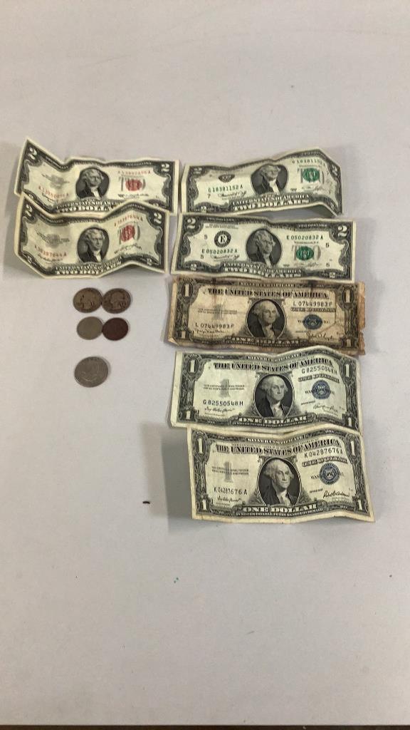 4-$2.00 bills.1953 red, 1963, red seal, 2@ 1976 green seal..3 $1.00 silver certificate 1935 D, 1935E, 1957..1936 quarter, 39 quarter, 1898 V Dime, 1912 V Dime..1979 Susan Anthony $1.00 coinÂ…all circulated