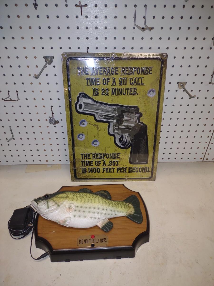WORKING BILLY BASS SINGING FISH & A TIN SIGN