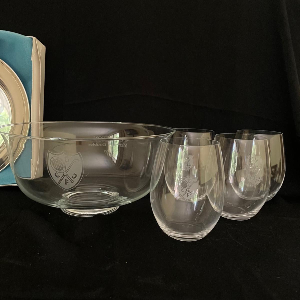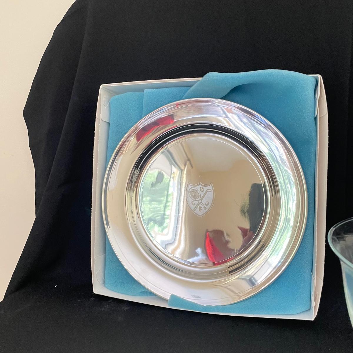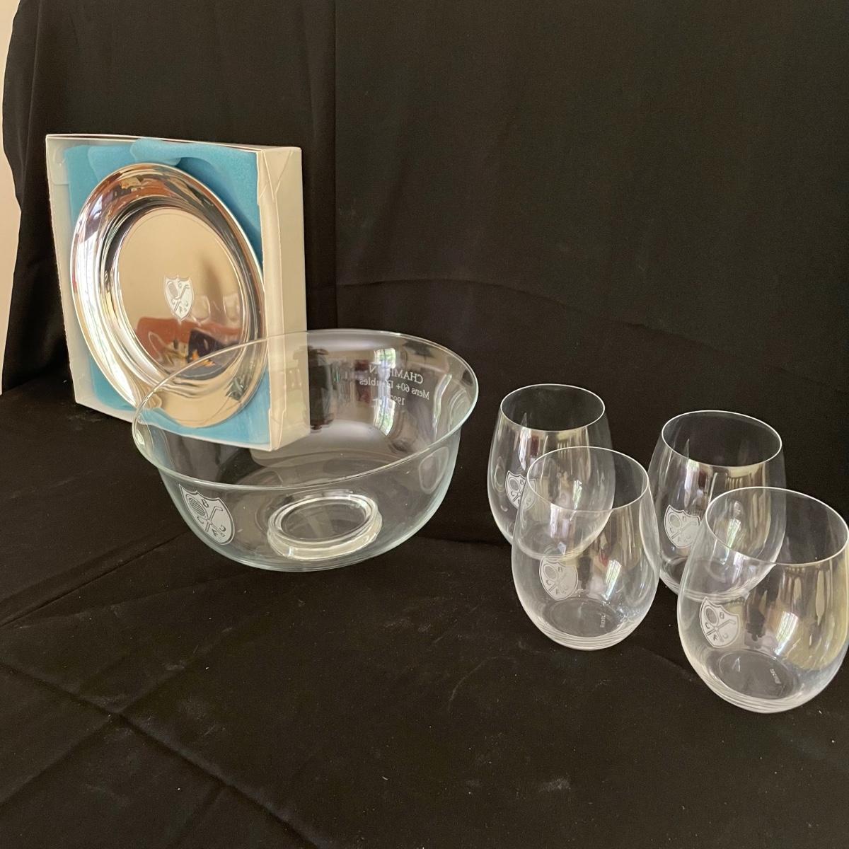 Four large stemless wine glasses, a trophy bowl and 10” shiny silver plated plate. See images. Shipping available.