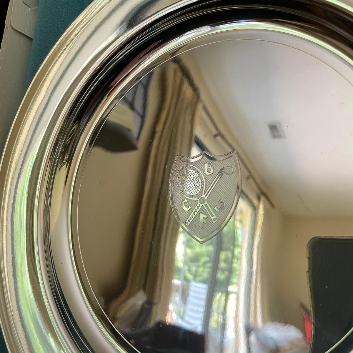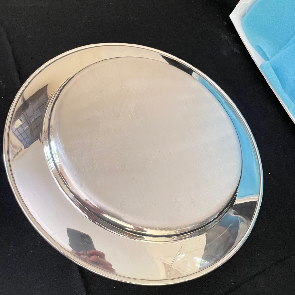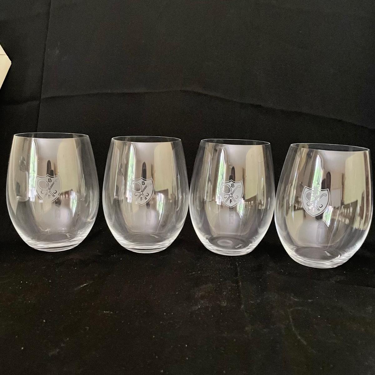 Four large stemless wine glasses, a trophy bowl and 10” shiny silver plated plate. See images. Shipping available.