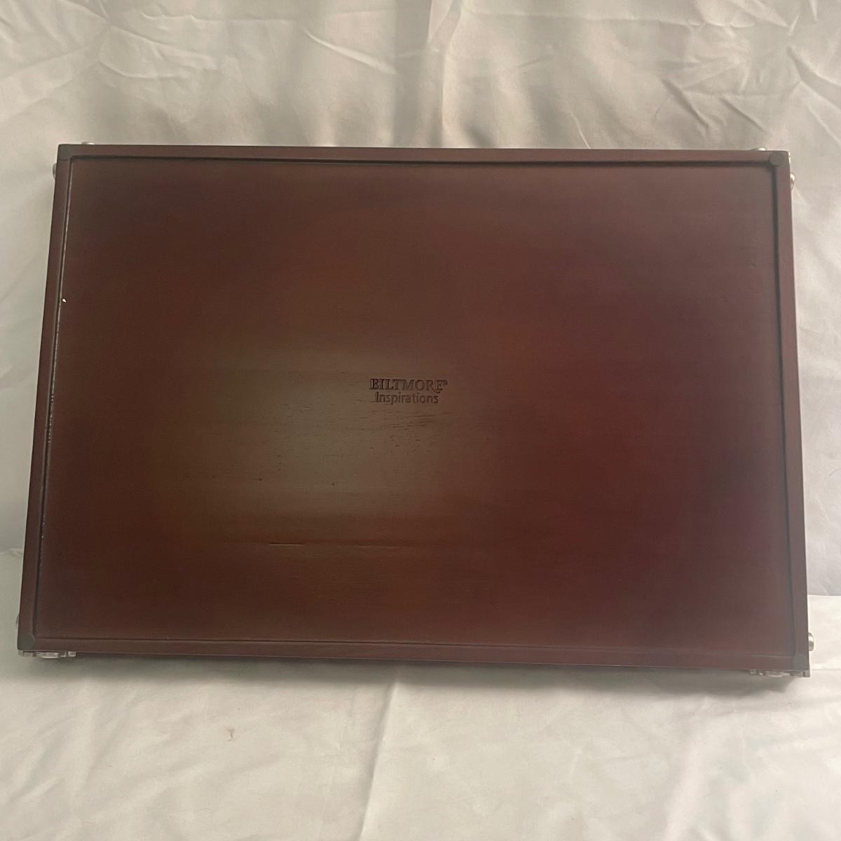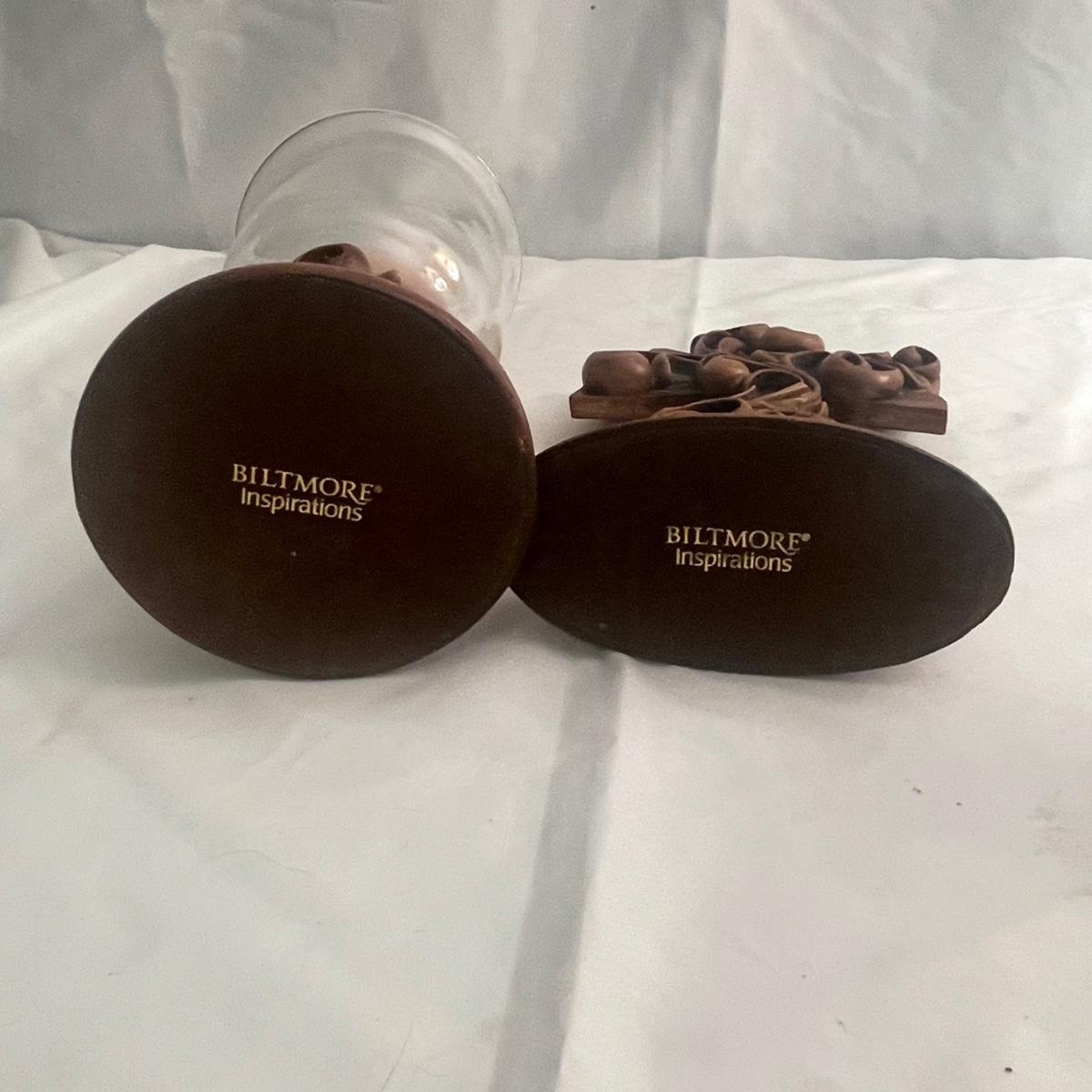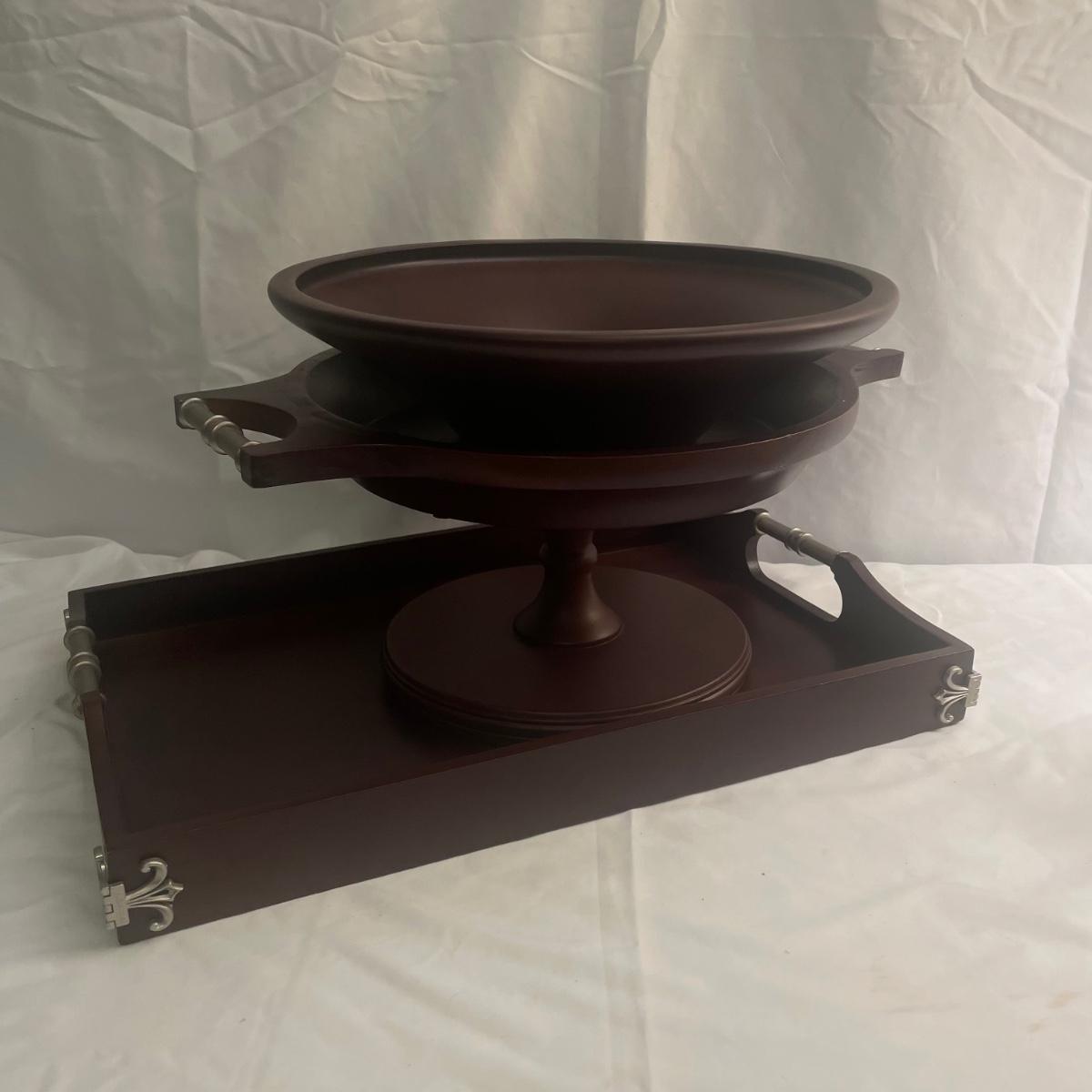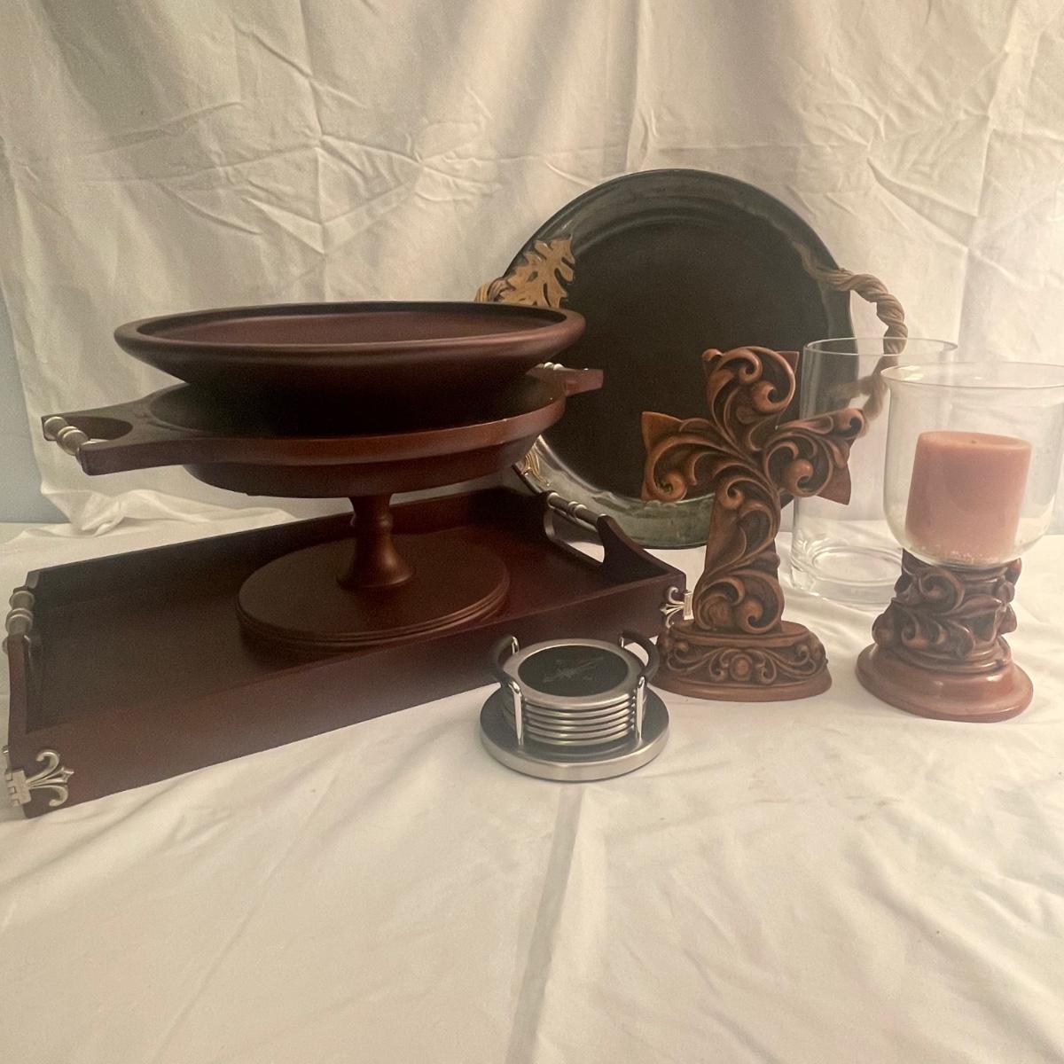 All 9 pieces in this lot are by Biltmore Inspirations and are in like new (possibly new) condition. Included is a silver colored Fleur de Lis coaster set, matching wood like cross statue and candle holder, tall glass vase, large pottery platter, and a 4-piece lightweight wood set that includes two metal handled trays, a salad bowl, and a pedestal. Largest rectangular tray measures 13.5” x 20” x 2”.