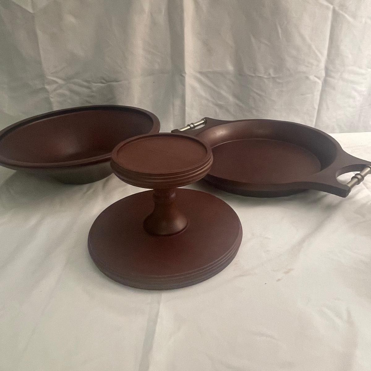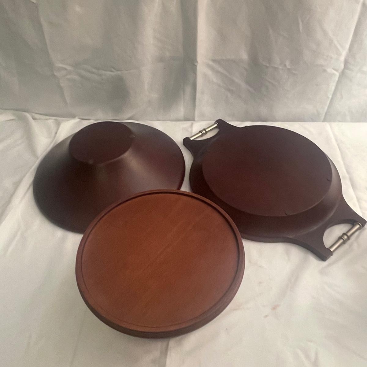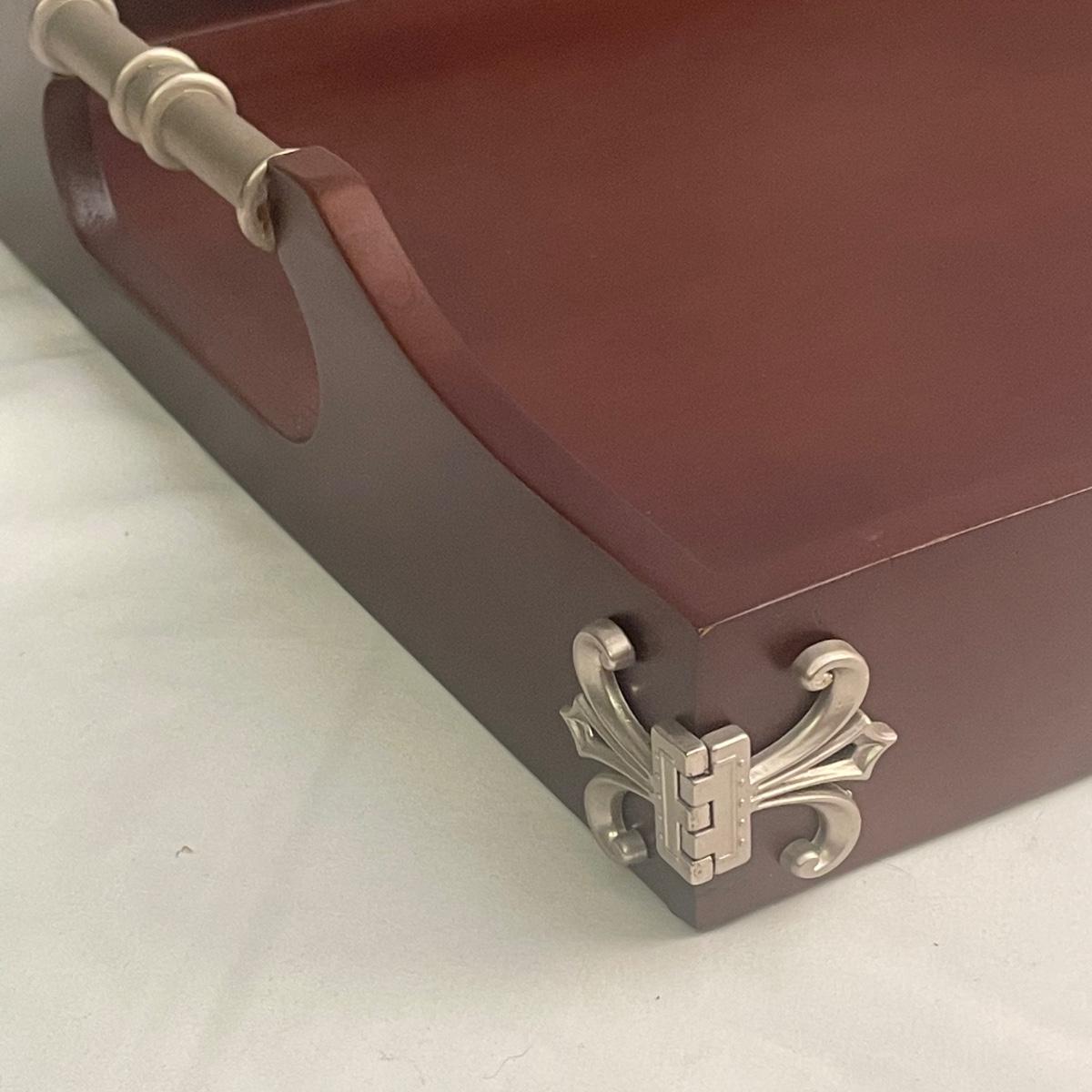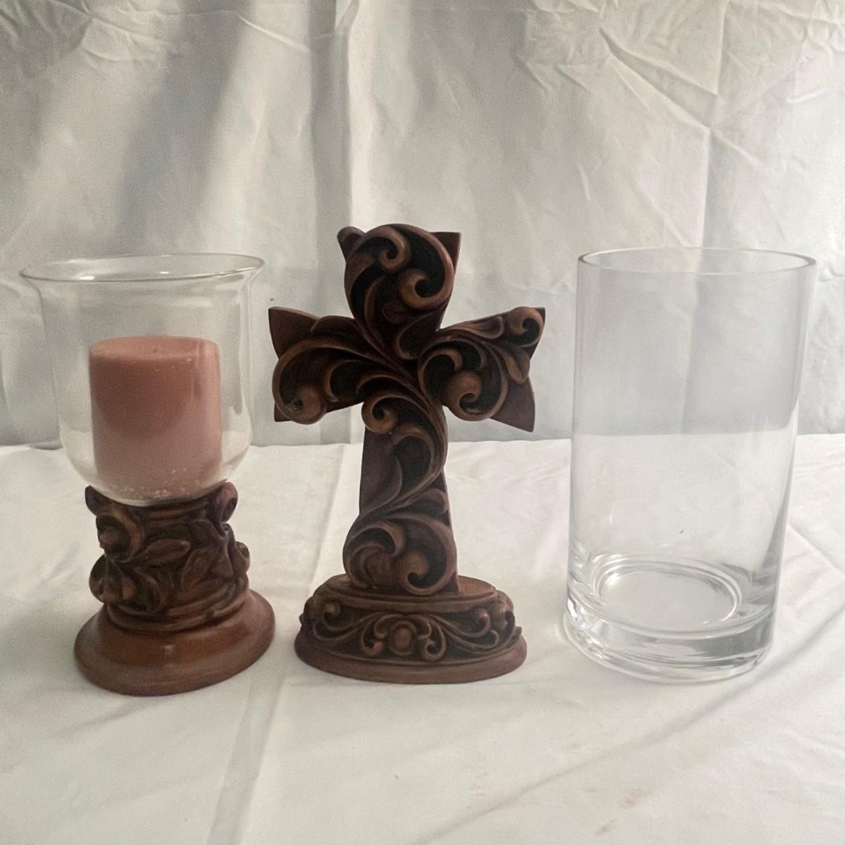All 9 pieces in this lot are by Biltmore Inspirations and are in like new (possibly new) condition. Included is a silver colored Fleur de Lis coaster set, matching wood like cross statue and candle holder, tall glass vase, large pottery platter, and a 4-piece lightweight wood set that includes two metal handled trays, a salad bowl, and a pedestal. Largest rectangular tray measures 13.5” x 20” x 2”.