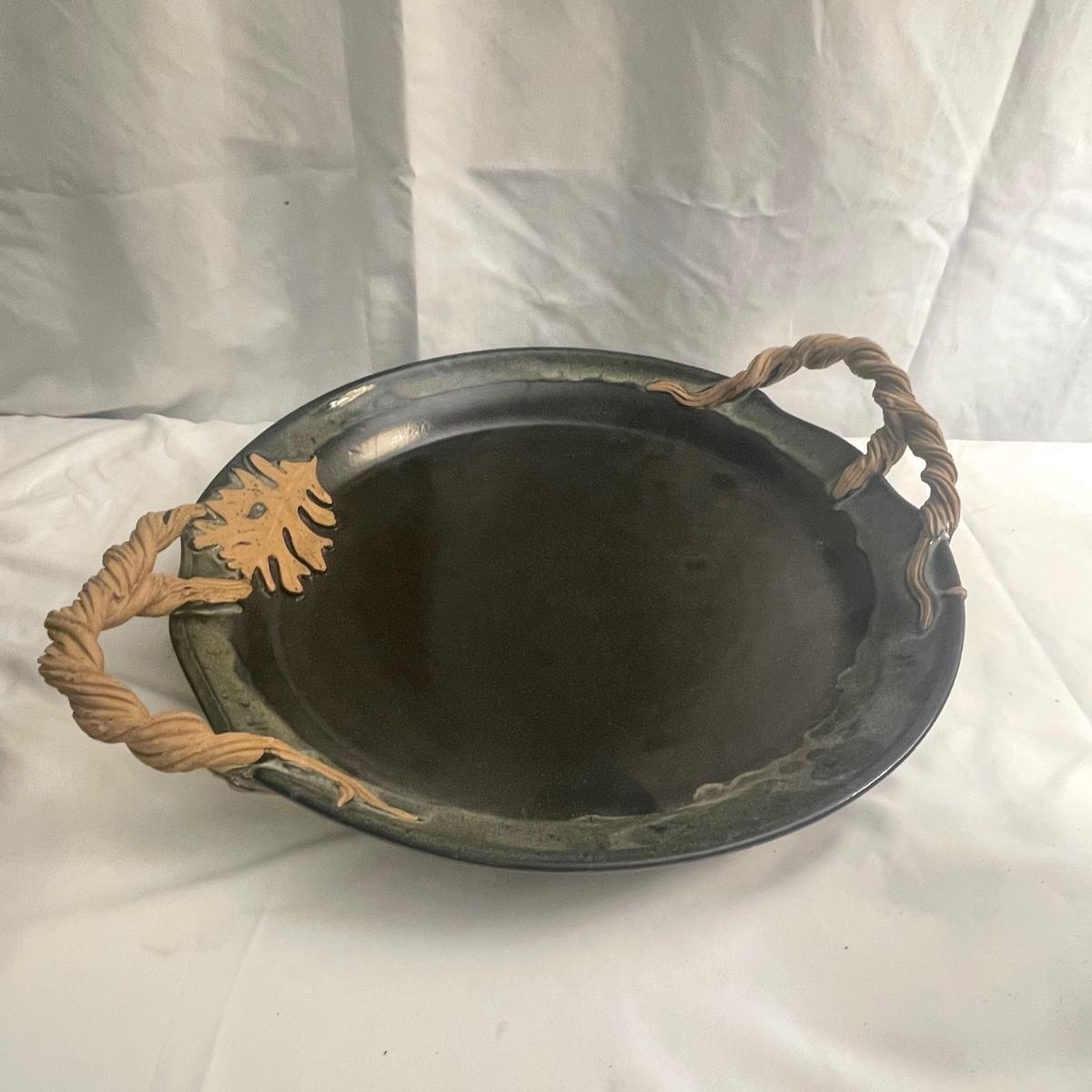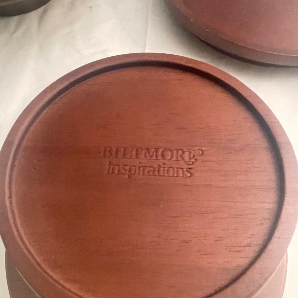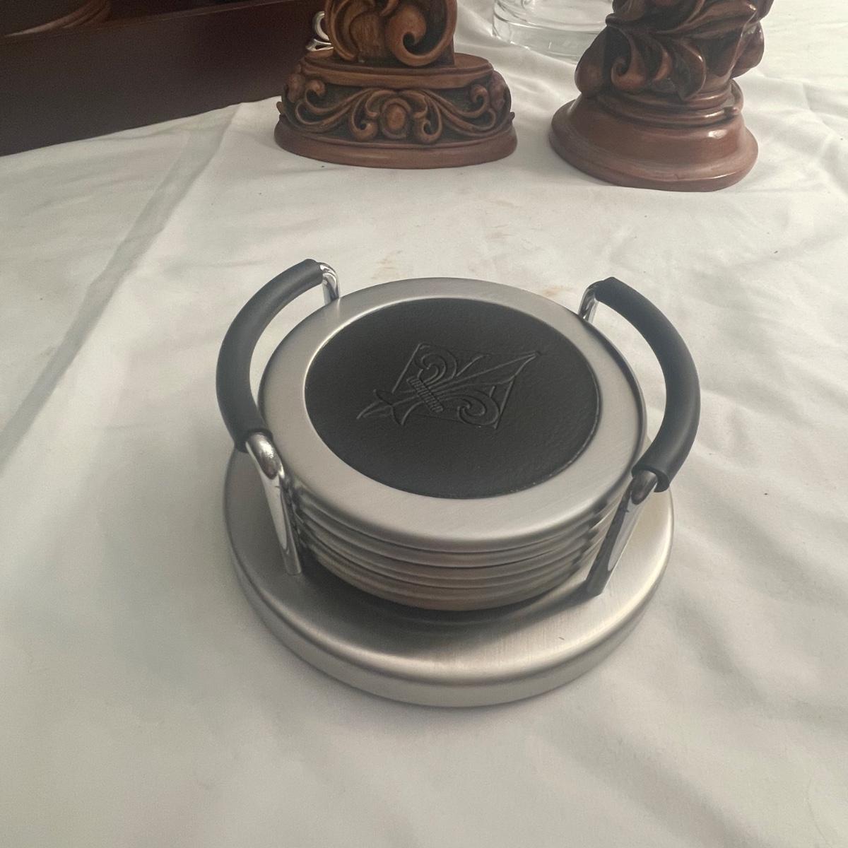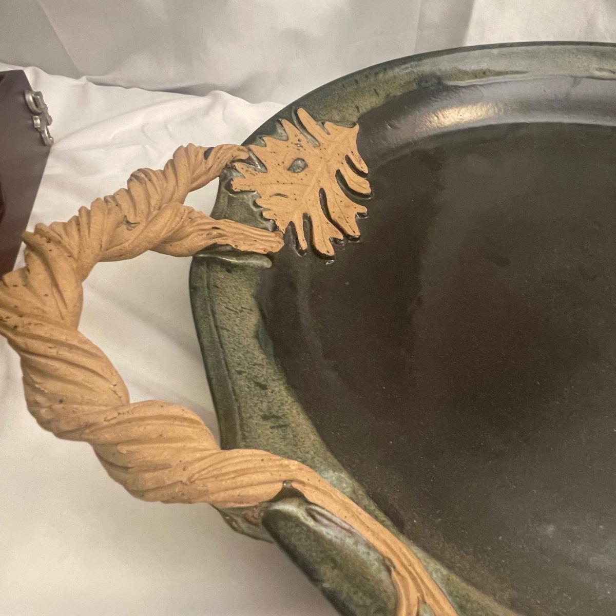 All 9 pieces in this lot are by Biltmore Inspirations and are in like new (possibly new) condition. Included is a silver colored Fleur de Lis coaster set, matching wood like cross statue and candle holder, tall glass vase, large pottery platter, and a 4-piece lightweight wood set that includes two metal handled trays, a salad bowl, and a pedestal. Largest rectangular tray measures 13.5” x 20” x 2”.