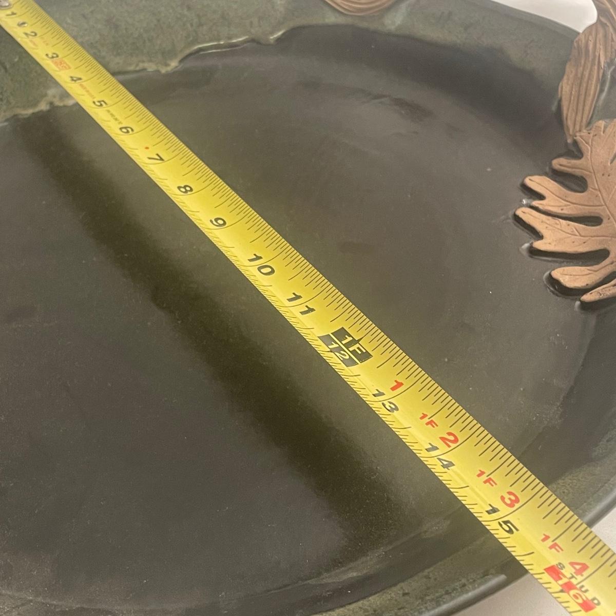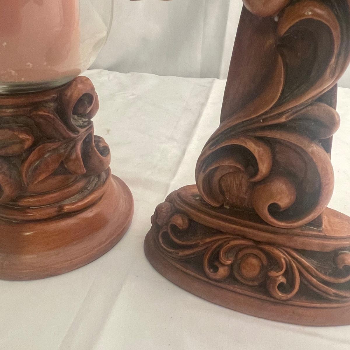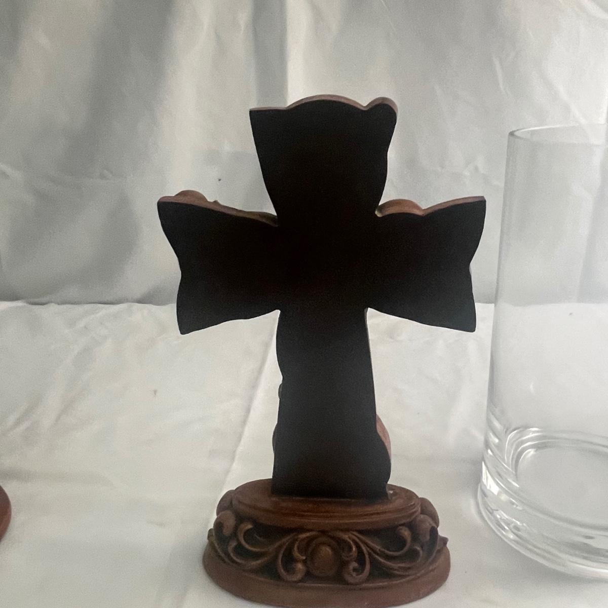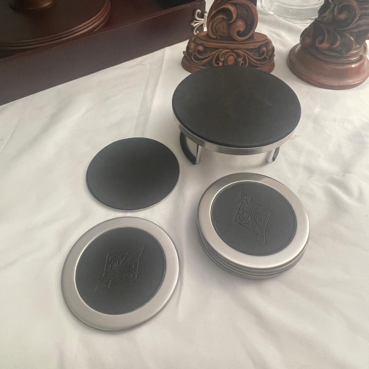 All 9 pieces in this lot are by Biltmore Inspirations and are in like new (possibly new) condition. Included is a silver colored Fleur de Lis coaster set, matching wood like cross statue and candle holder, tall glass vase, large pottery platter, and a 4-piece lightweight wood set that includes two metal handled trays, a salad bowl, and a pedestal. Largest rectangular tray measures 13.5” x 20” x 2”.
