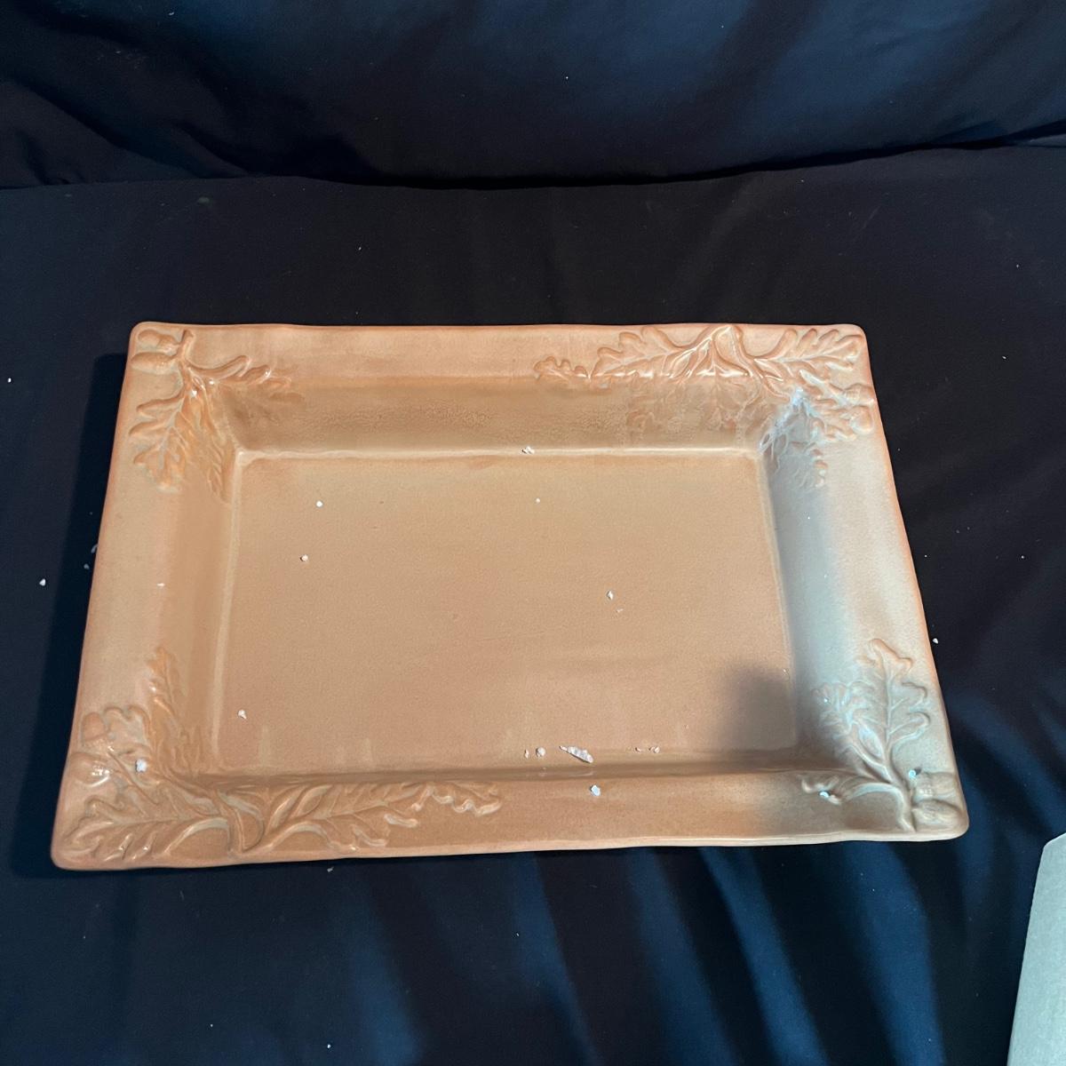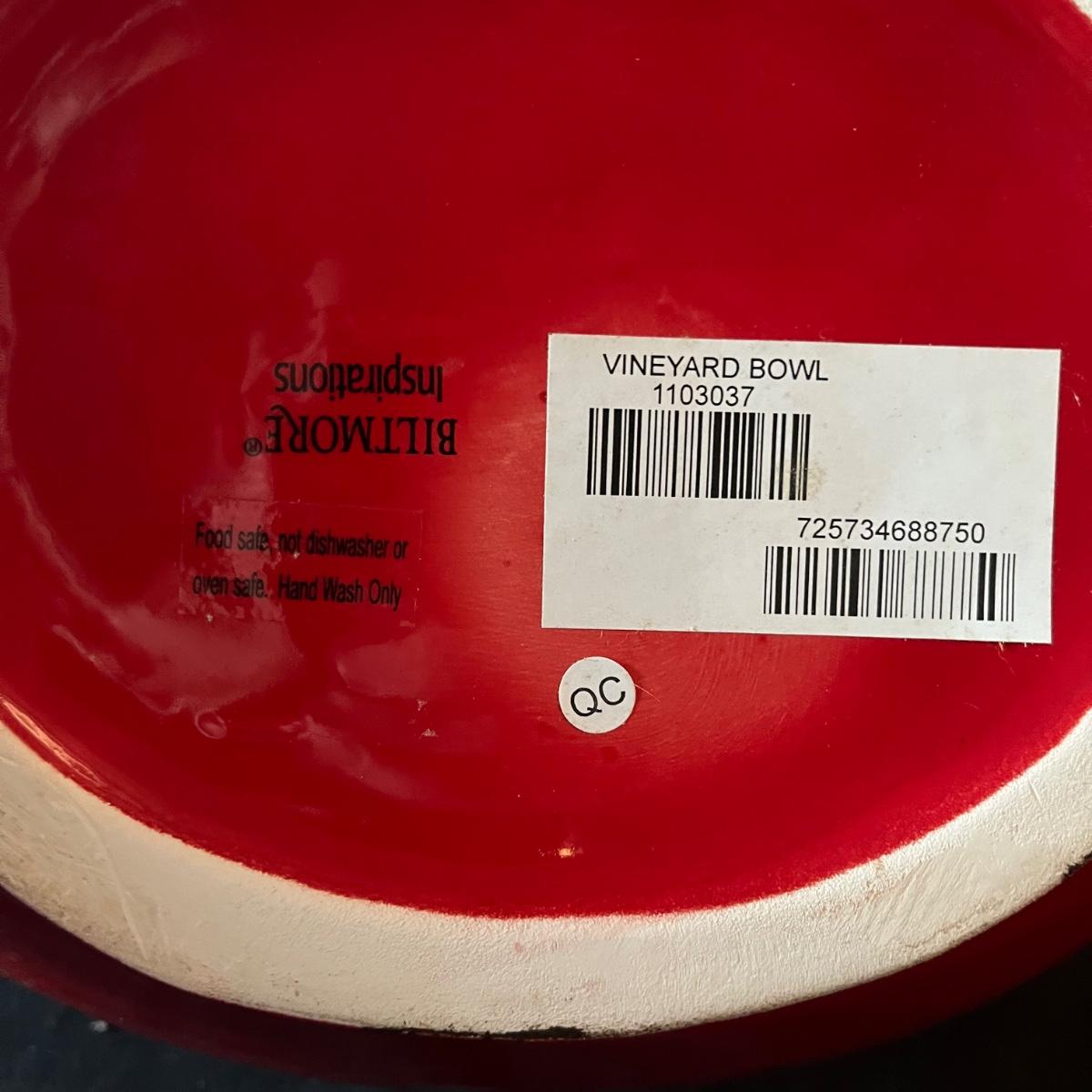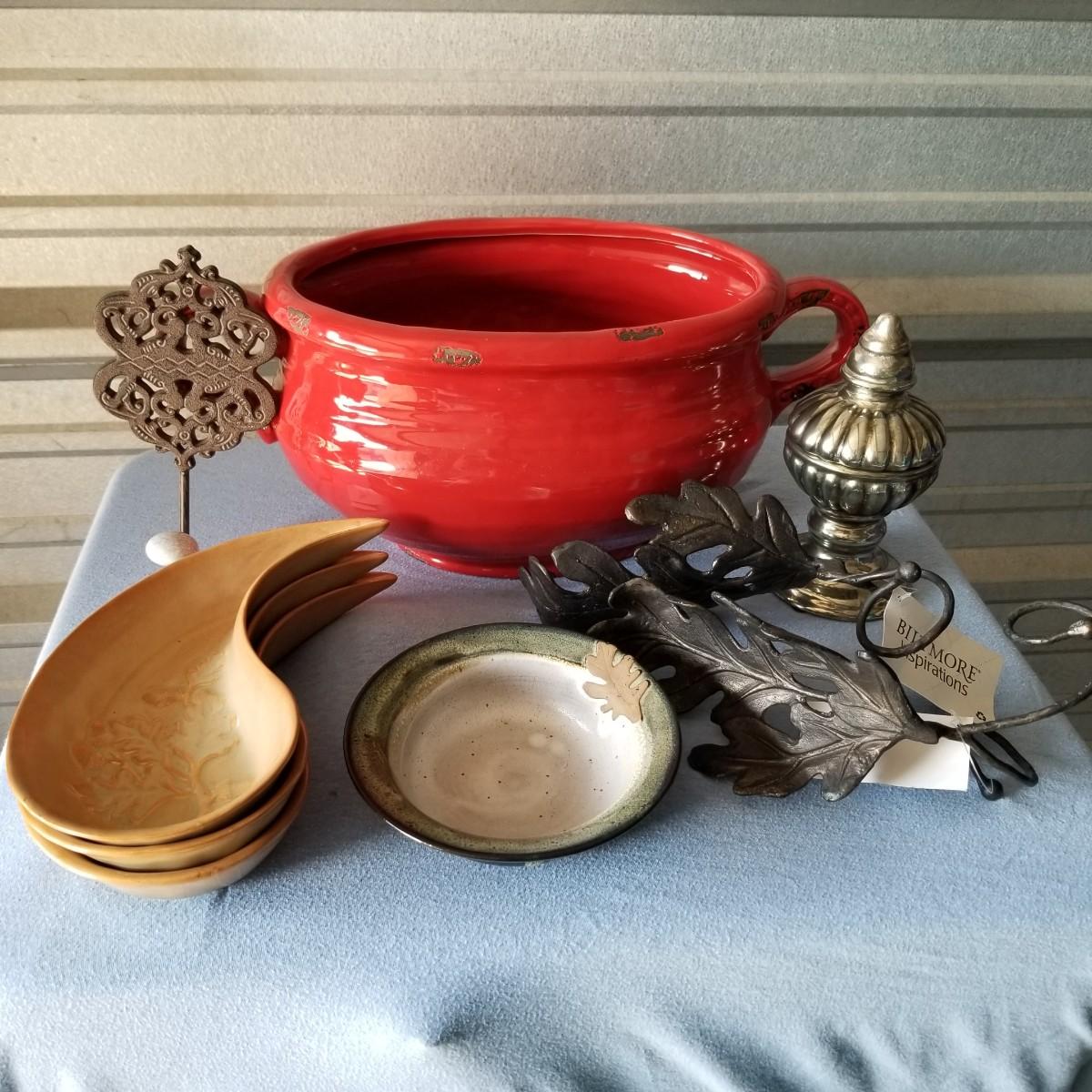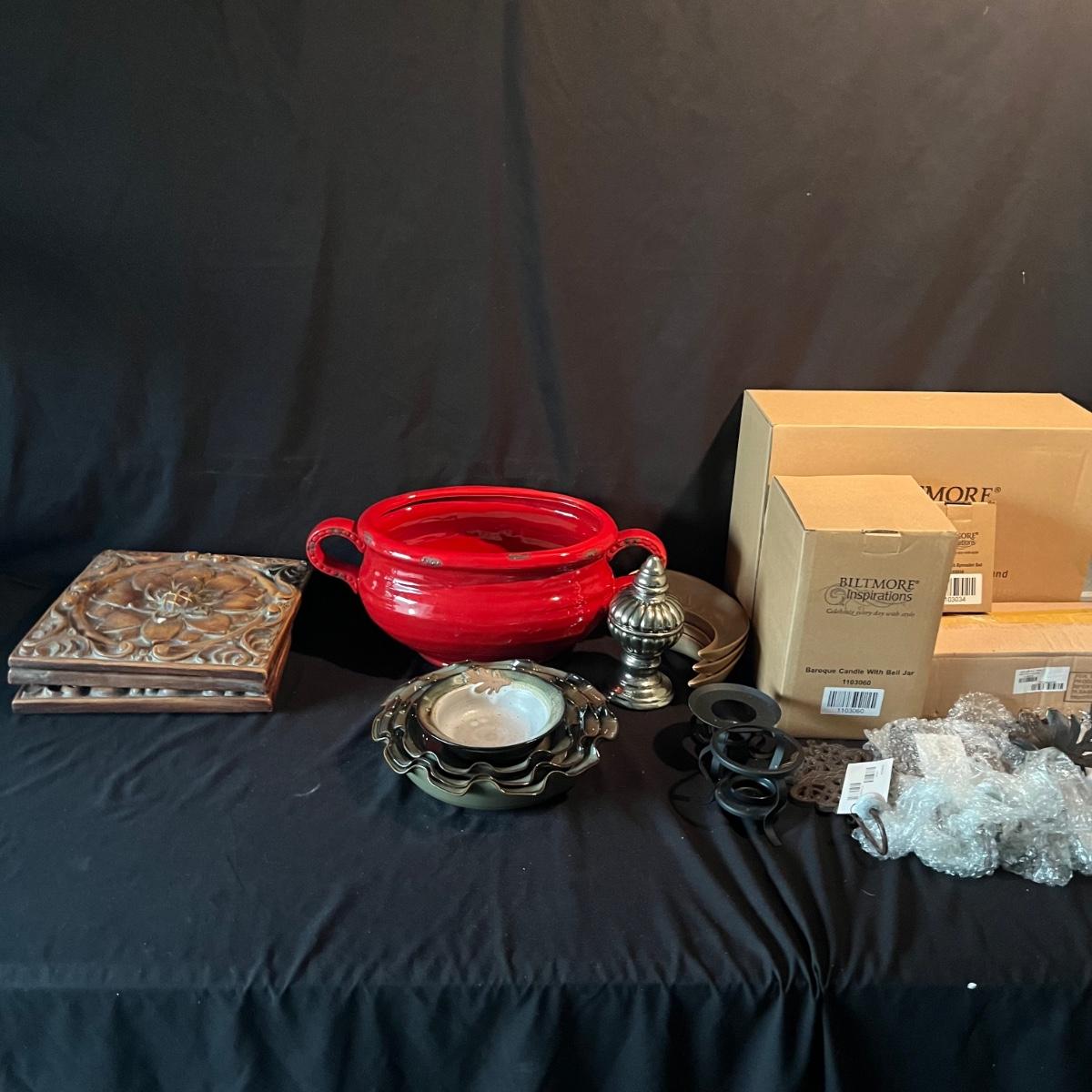 Lot contains ceramic Vineyard Bowl, three decorative wall hangings, three ceramic teardrop shaped bowls, three matching ceramic bowls, small ceramic bowl, seven metal wall hooks, metal plate stand, Olmstead oak baking dish with stand, Antler Hill wine bottle holder, small silver colored ceramic jar and Baroque candle with Bell jar. Vineyard Bowl measures 10” x 19” x 8”. Many of these items are new in box.