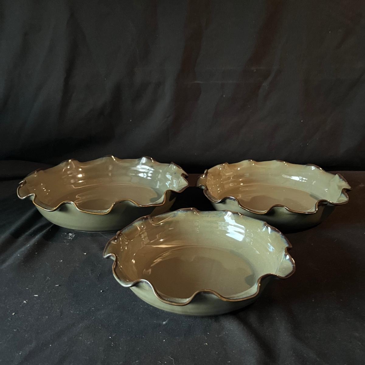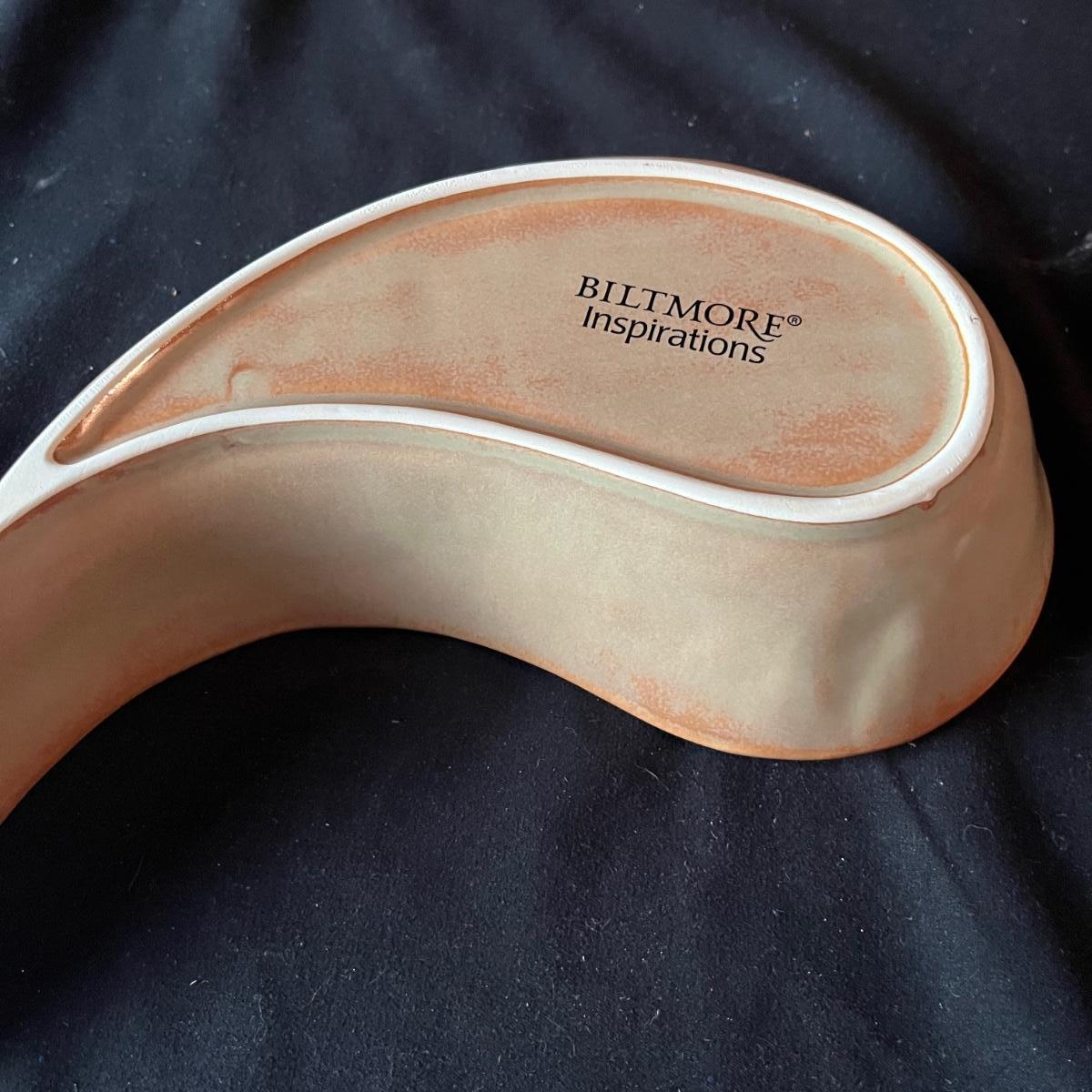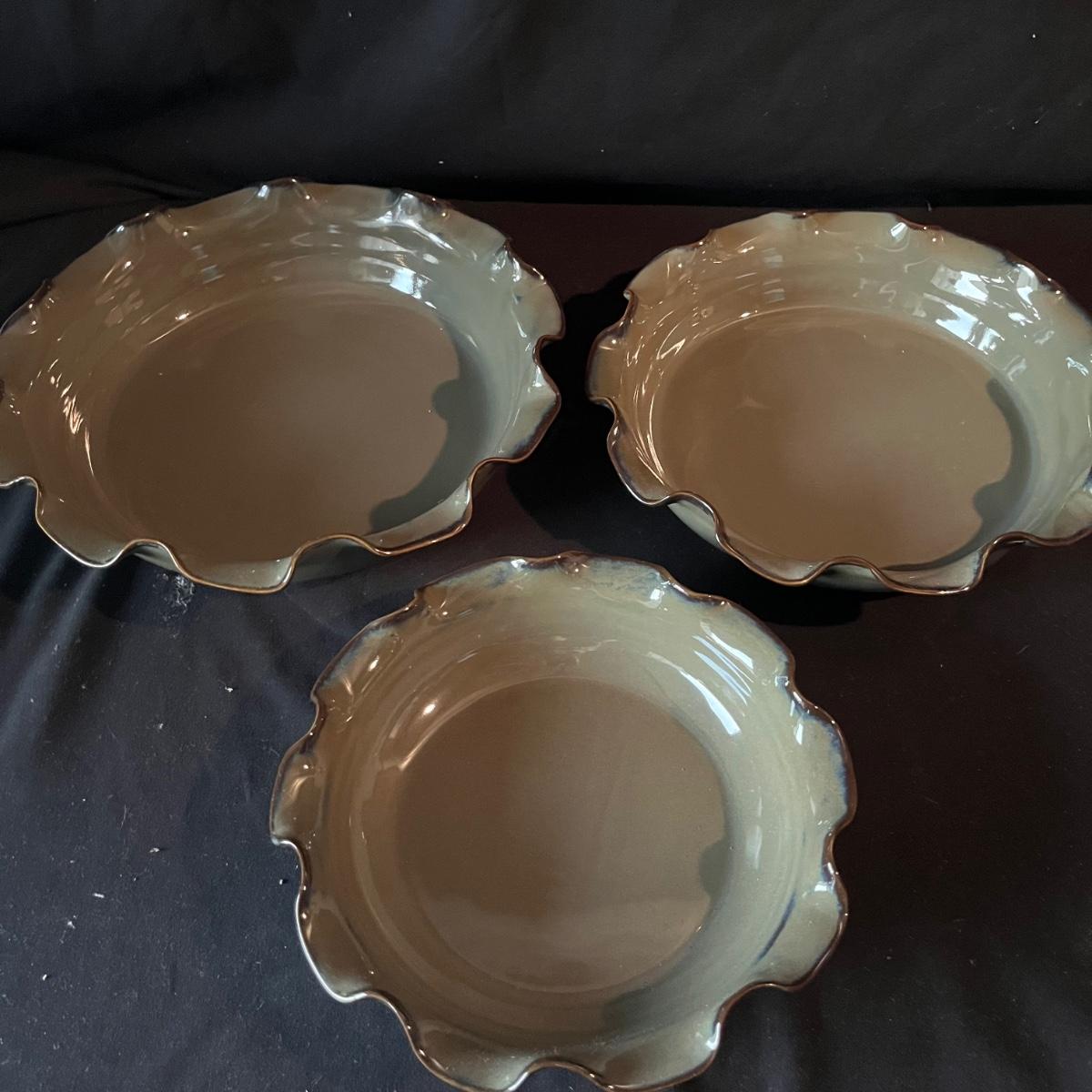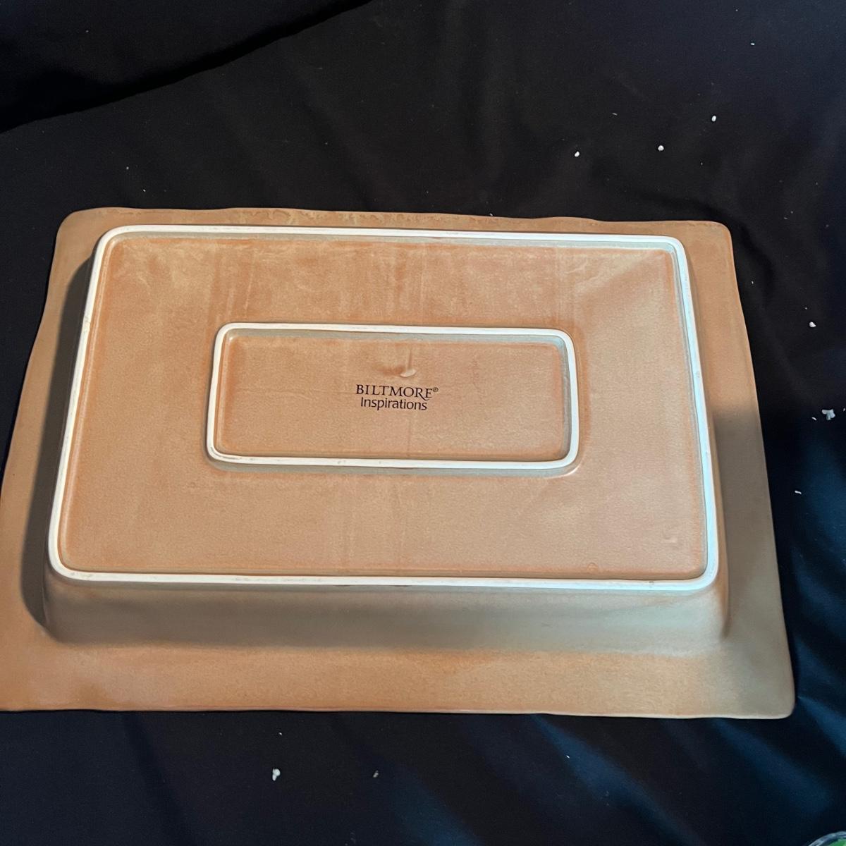 Lot contains ceramic Vineyard Bowl, three decorative wall hangings, three ceramic teardrop shaped bowls, three matching ceramic bowls, small ceramic bowl, seven metal wall hooks, metal plate stand, Olmstead oak baking dish with stand, Antler Hill wine bottle holder, small silver colored ceramic jar and Baroque candle with Bell jar. Vineyard Bowl measures 10” x 19” x 8”. Many of these items are new in box.
