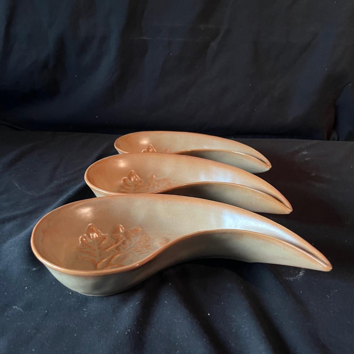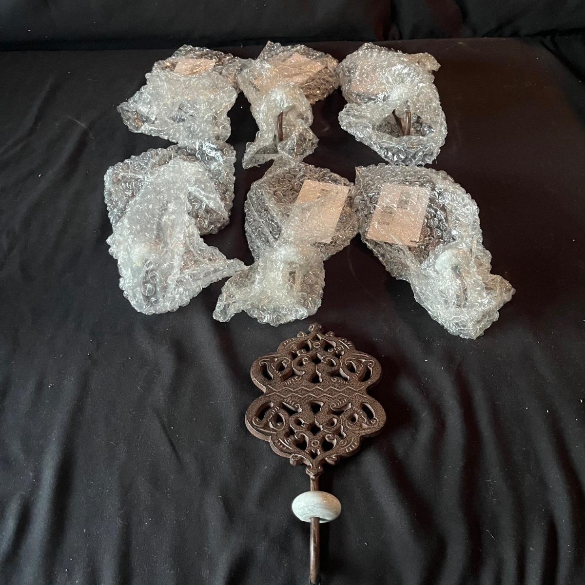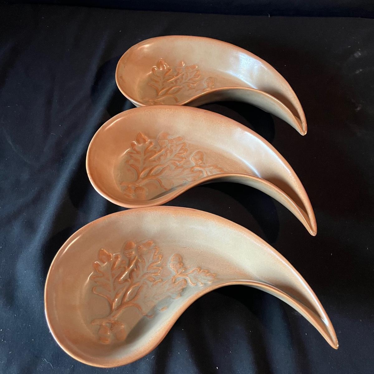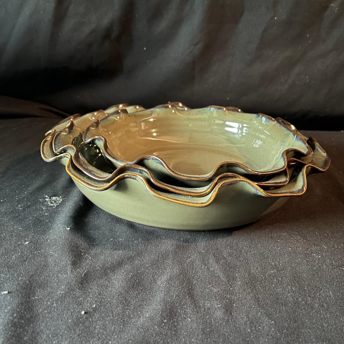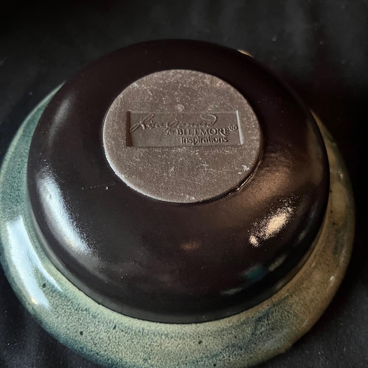 Lot contains ceramic Vineyard Bowl, three decorative wall hangings, three ceramic teardrop shaped bowls, three matching ceramic bowls, small ceramic bowl, seven metal wall hooks, metal plate stand, Olmstead oak baking dish with stand, Antler Hill wine bottle holder, small silver colored ceramic jar and Baroque candle with Bell jar. Vineyard Bowl measures 10” x 19” x 8”. Many of these items are new in box.