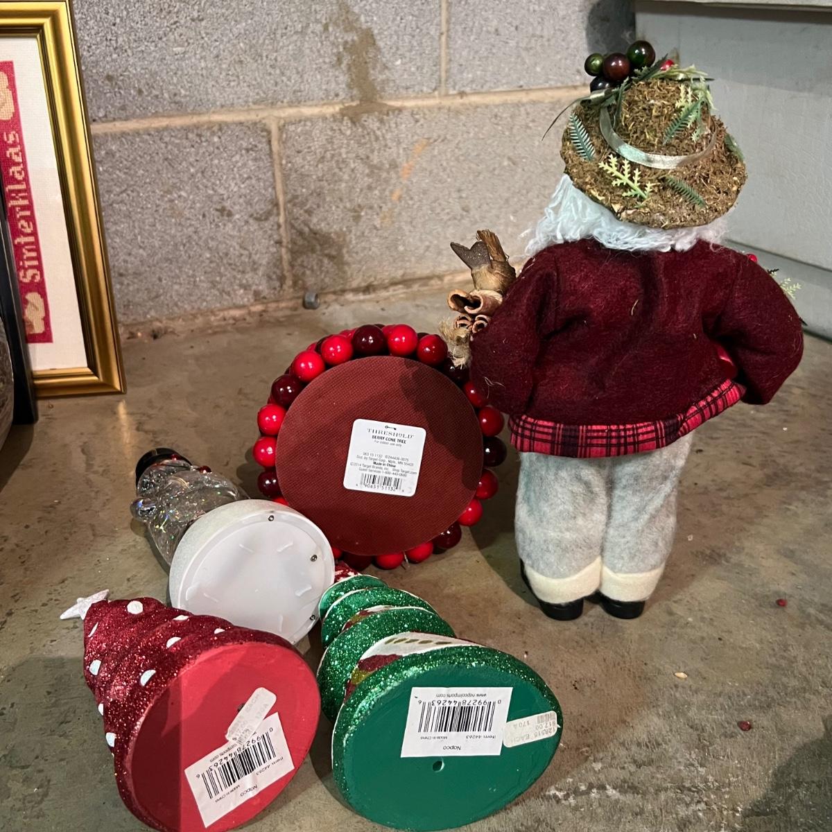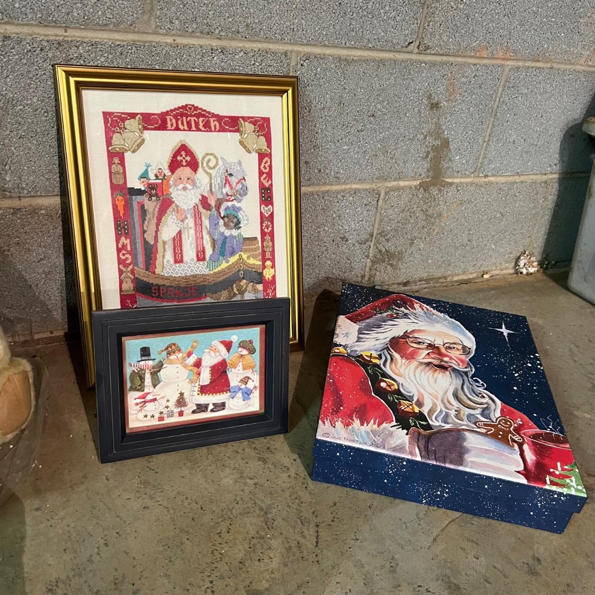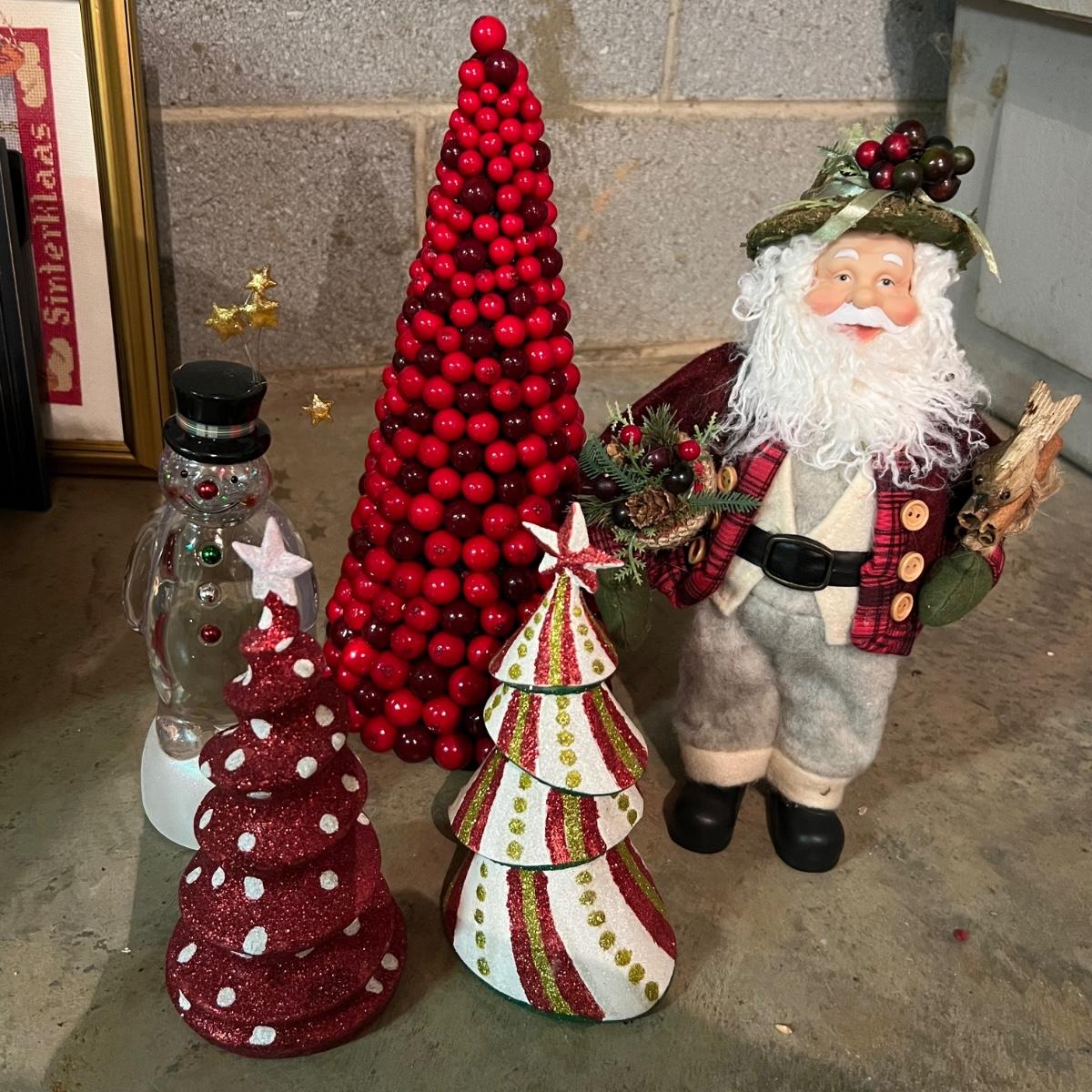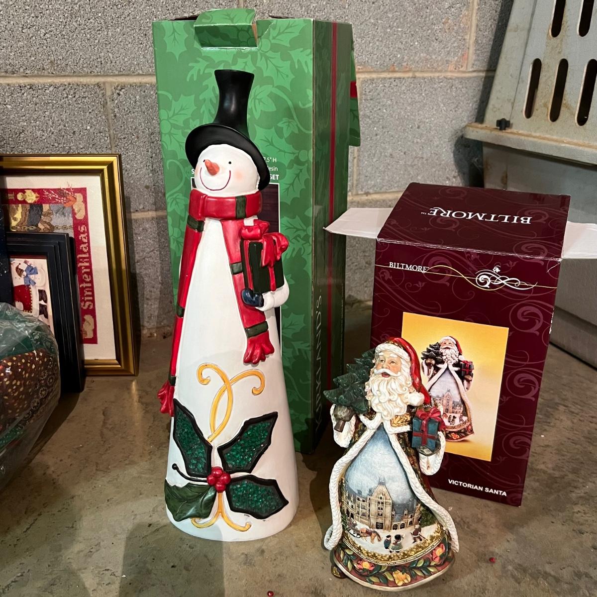 This assortment of Xmas decor includes a Victorian Biltmore Santa that appears to be resin and is 11”H. The Studio 56 is Knottinghill Church, comes with original box and there are also three each of small figurines and trees. The two framed pieces of art are under glass and in composite frames; needlepoint frame measures 12” x 16”. The gold composite choir boy has two candleholders, one of which needs gluing back into place. Couple of items are battery operated and have not been tested.