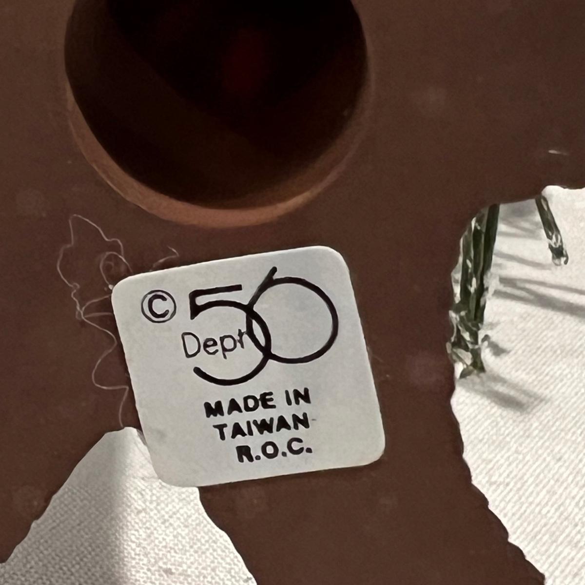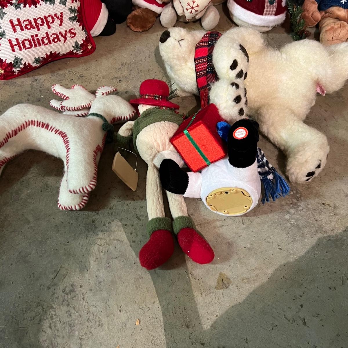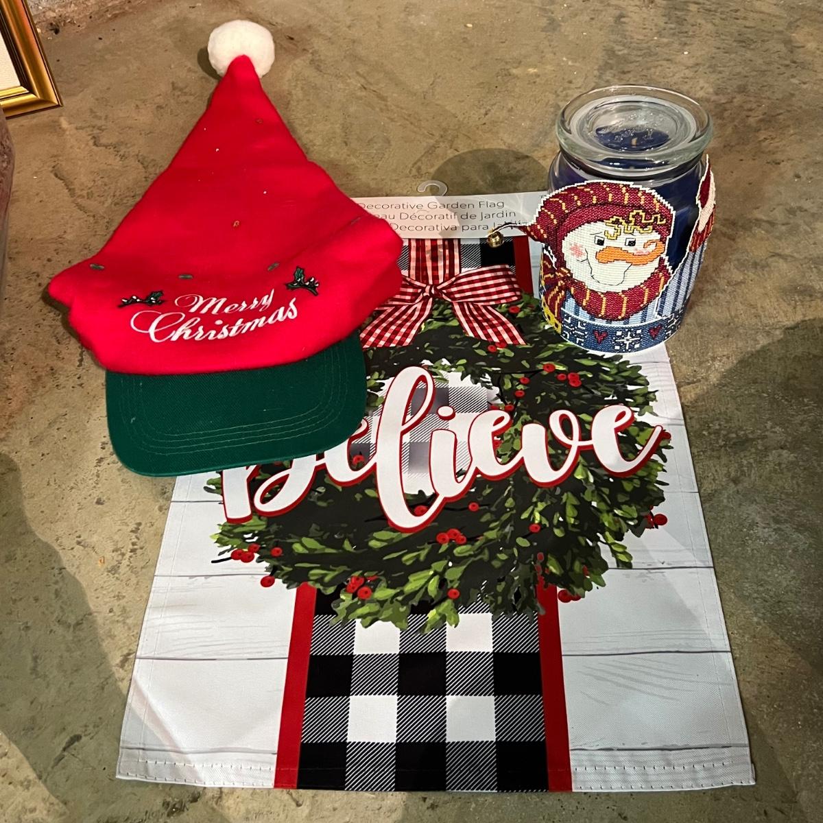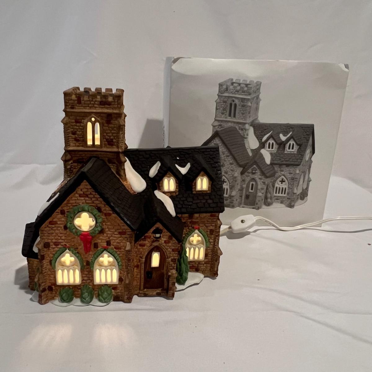 This assortment of Xmas decor includes a Victorian Biltmore Santa that appears to be resin and is 11”H. The Studio 56 is Knottinghill Church, comes with original box and there are also three each of small figurines and trees. The two framed pieces of art are under glass and in composite frames; needlepoint frame measures 12” x 16”. The gold composite choir boy has two candleholders, one of which needs gluing back into place. Couple of items are battery operated and have not been tested.