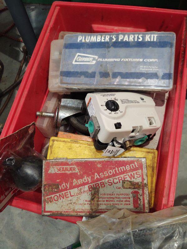Bin of assorted plumbing hose, tools, parts, kits, etc. as shown