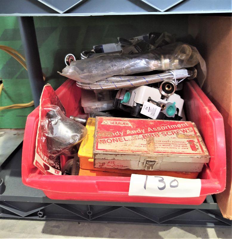lot 130 - Bin of assorted plumbing hose, tools, parts, kits, etc. as shown