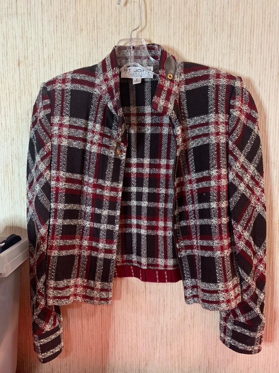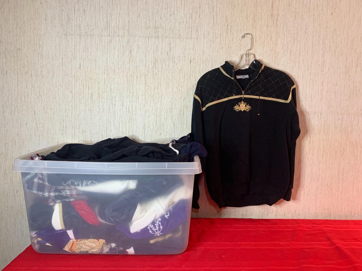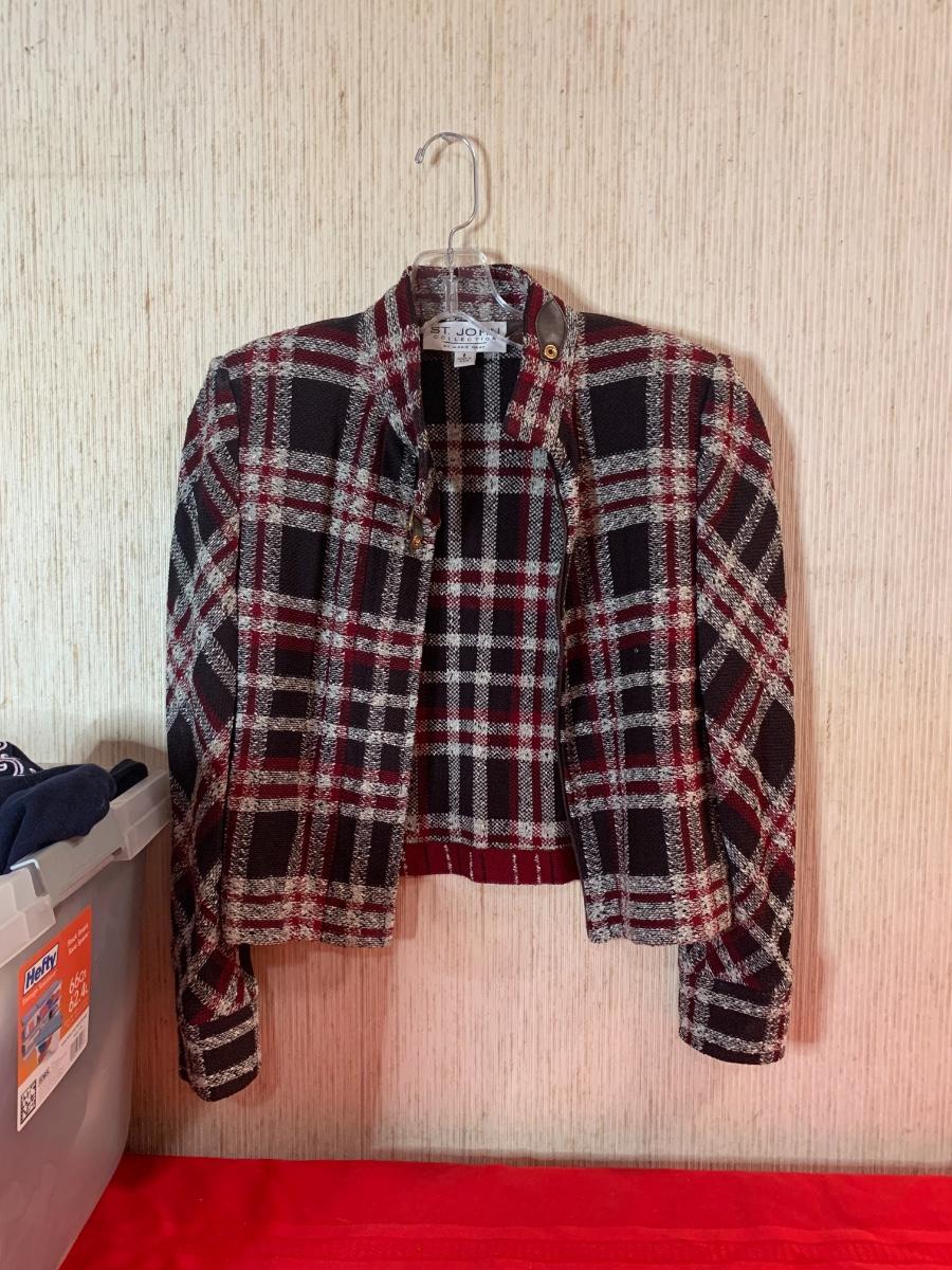 Entire heafty bin of St. John’s brand sweaters in great condition all in women’s size small, with assorted Italian handkerchiefs in great condition