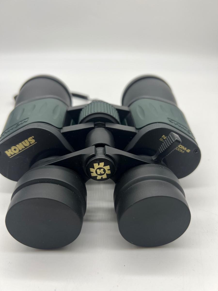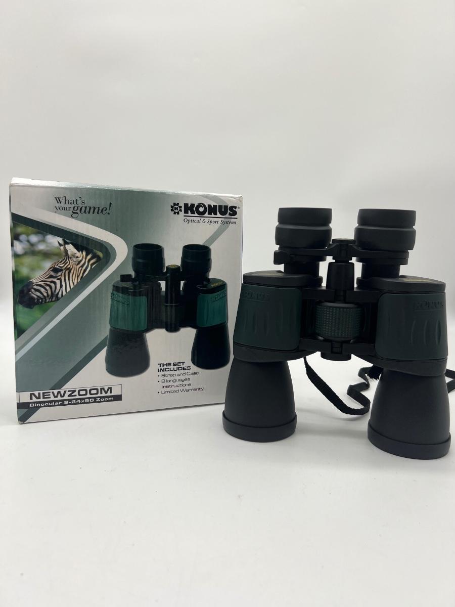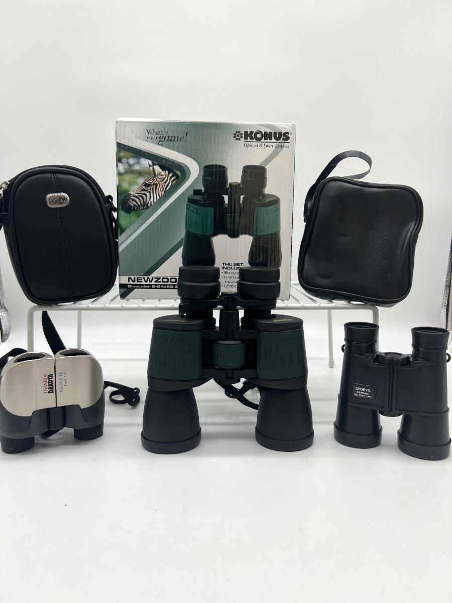 Three different binoculars lot. KONUS Newzoom 8-24X50 Zoom. Titanium Dakota 10X 25T- IR and Sports 7X40mm. All have cases included.