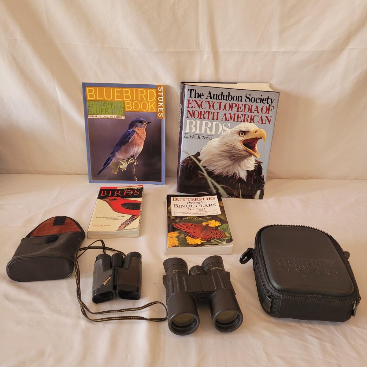 This lot includes a pair of Steiner Rocky S 8x42 binoculars, Nikon Venturer II 8x23 binoculars, North American bird books, and a butterfly book. Audubon Society Encyclopedia book measures approximately 9.5” x 2.5” x 11.5”H. Shipping available.