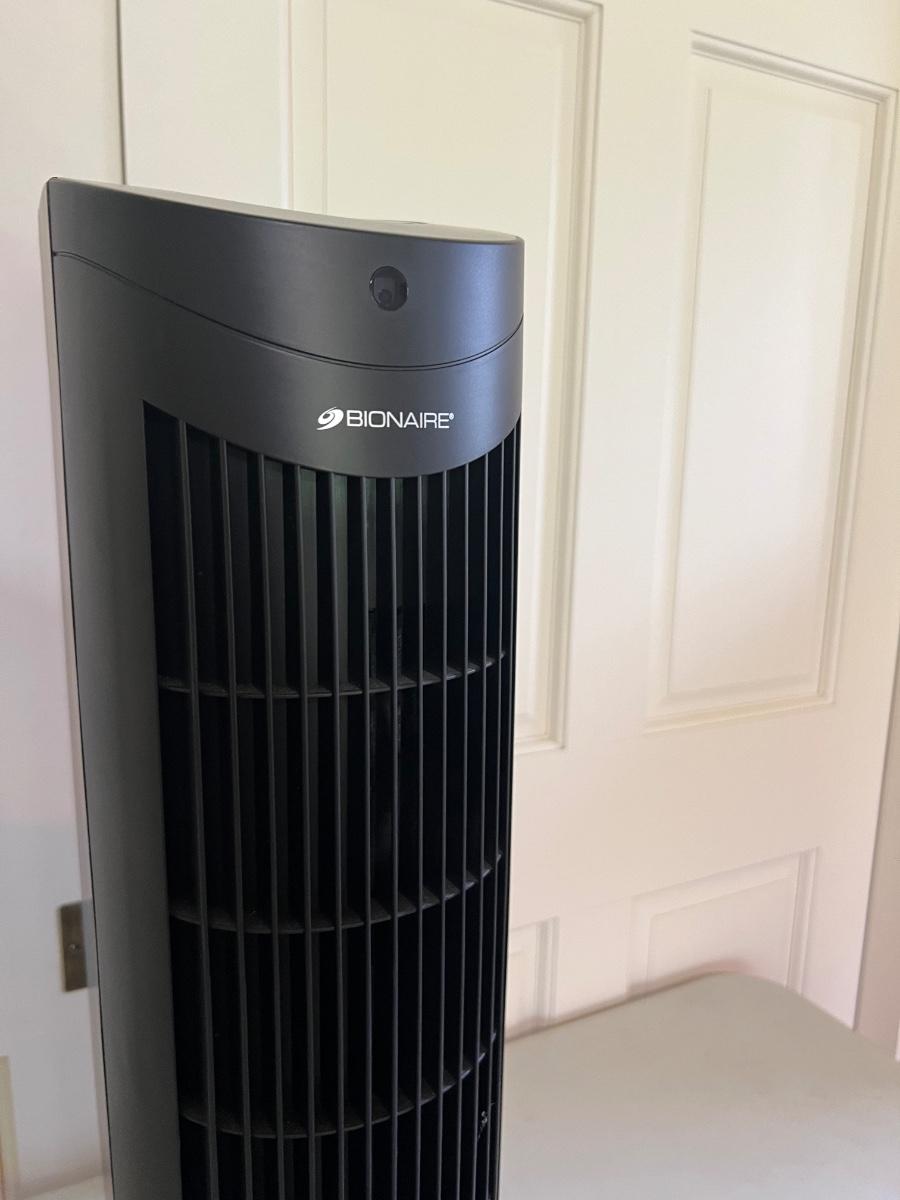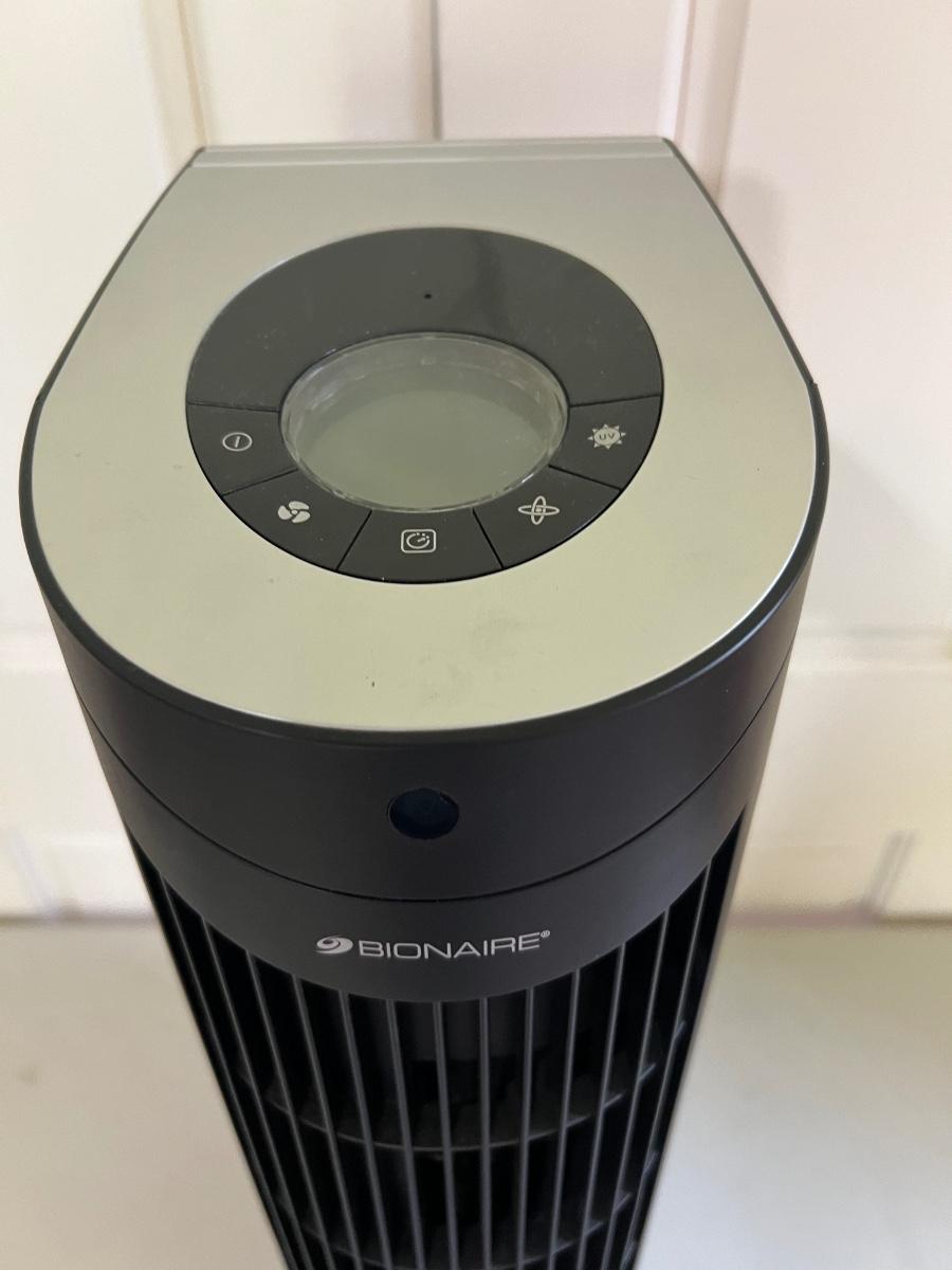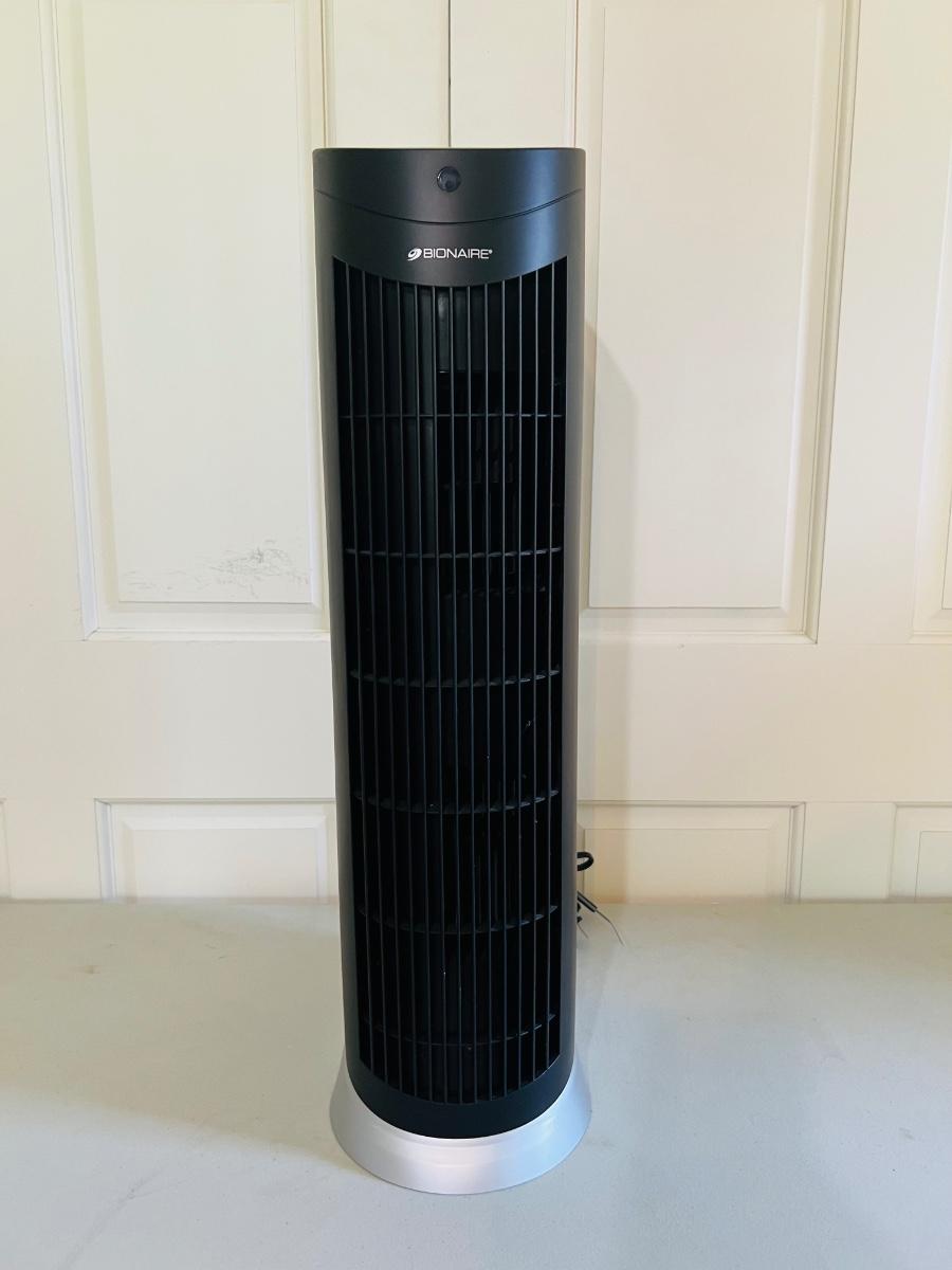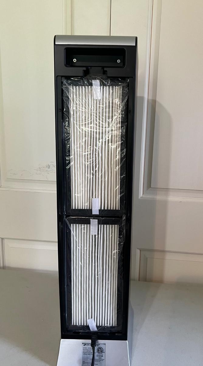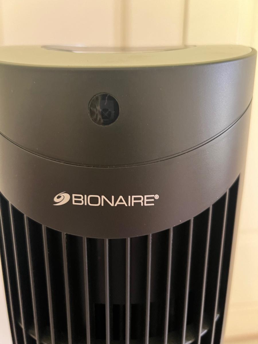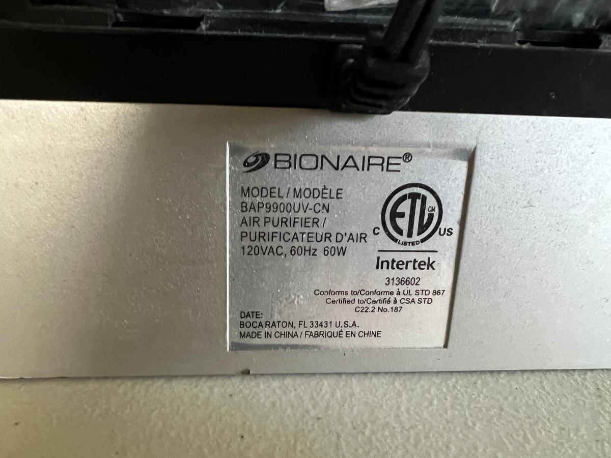 BIONAIRE Air purifier. Model #BAP9900UV-CN. Filters still have plastic on them. Measures 25 inches tall, approximately 9 1/2 inches deep 6 inches wide.