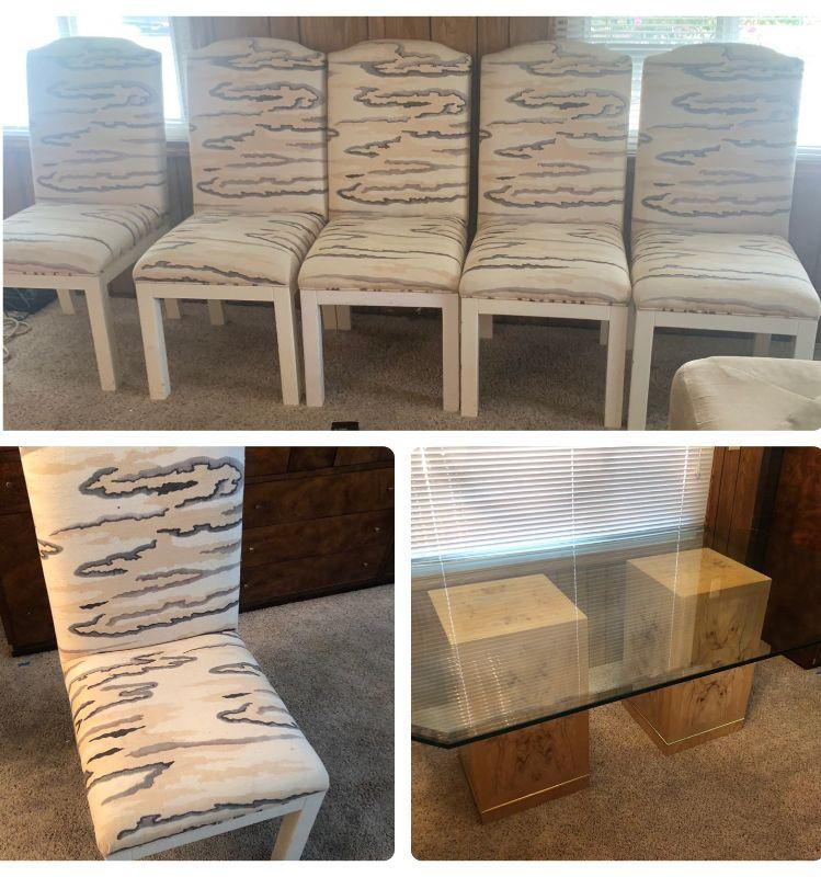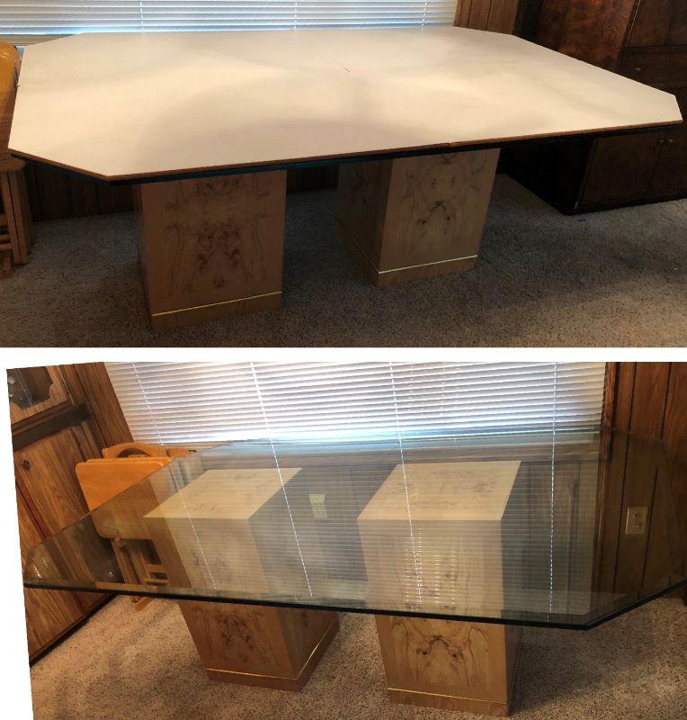 Bi-pedestal faux marble and glass top dining table with protective top and 8 chairs