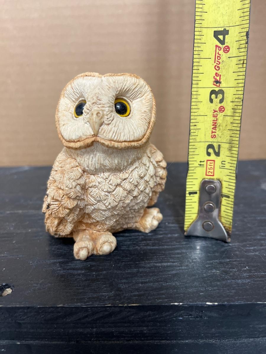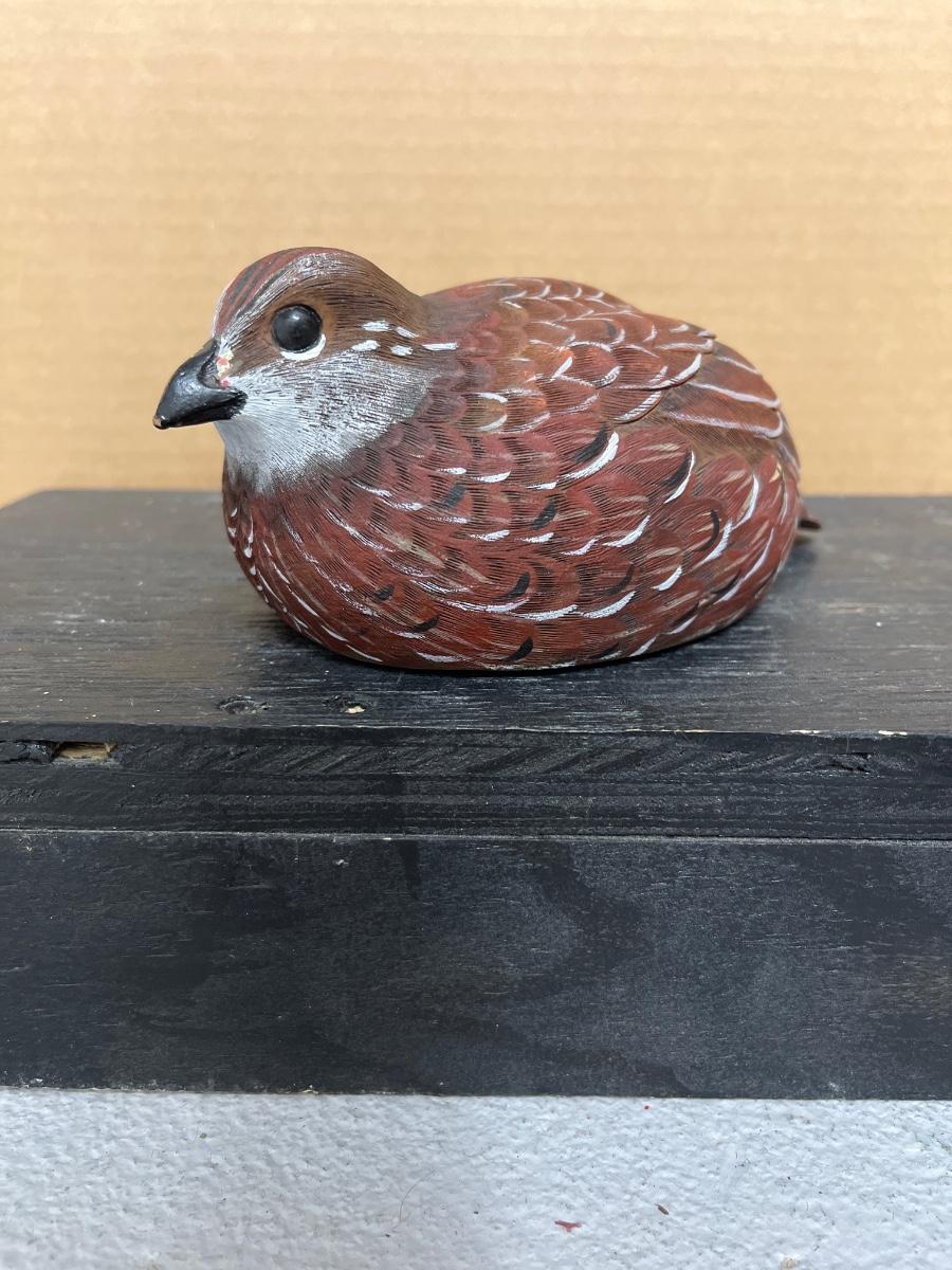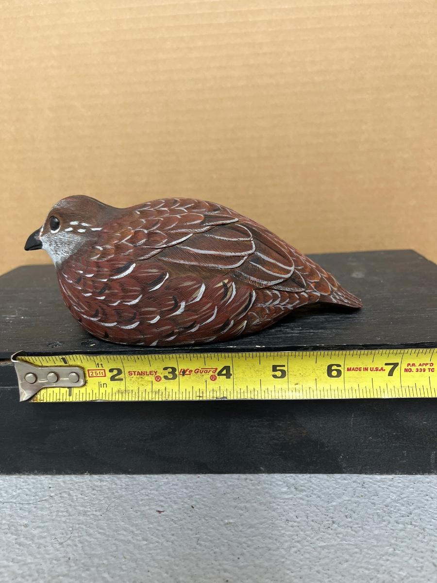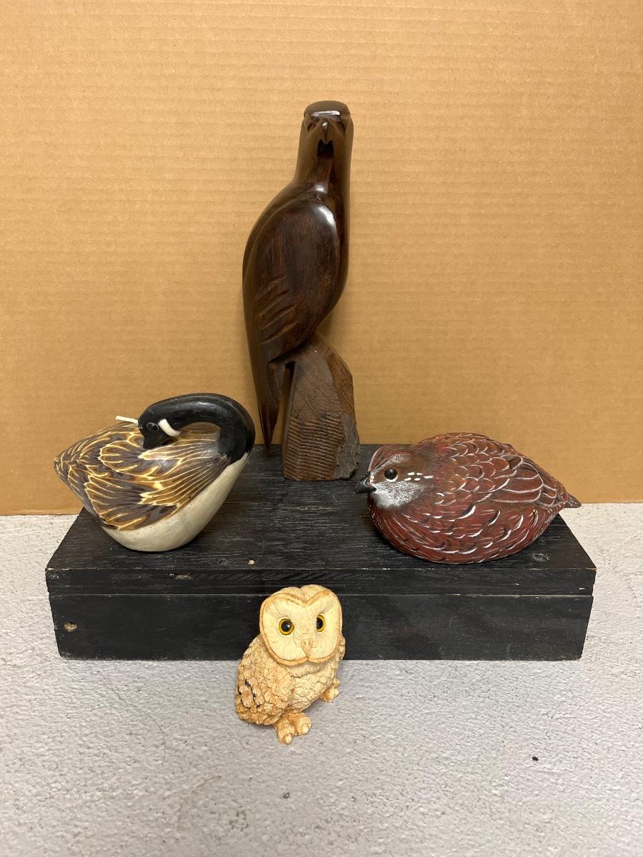 Ironwood hawk, bobwhite quail decoy, goose candle and Stone Critters barn owl