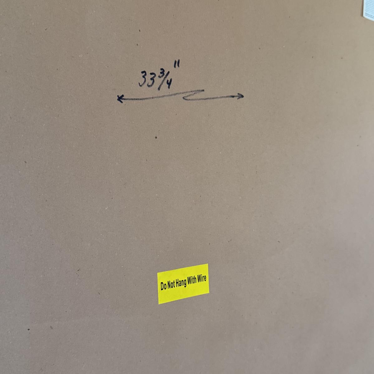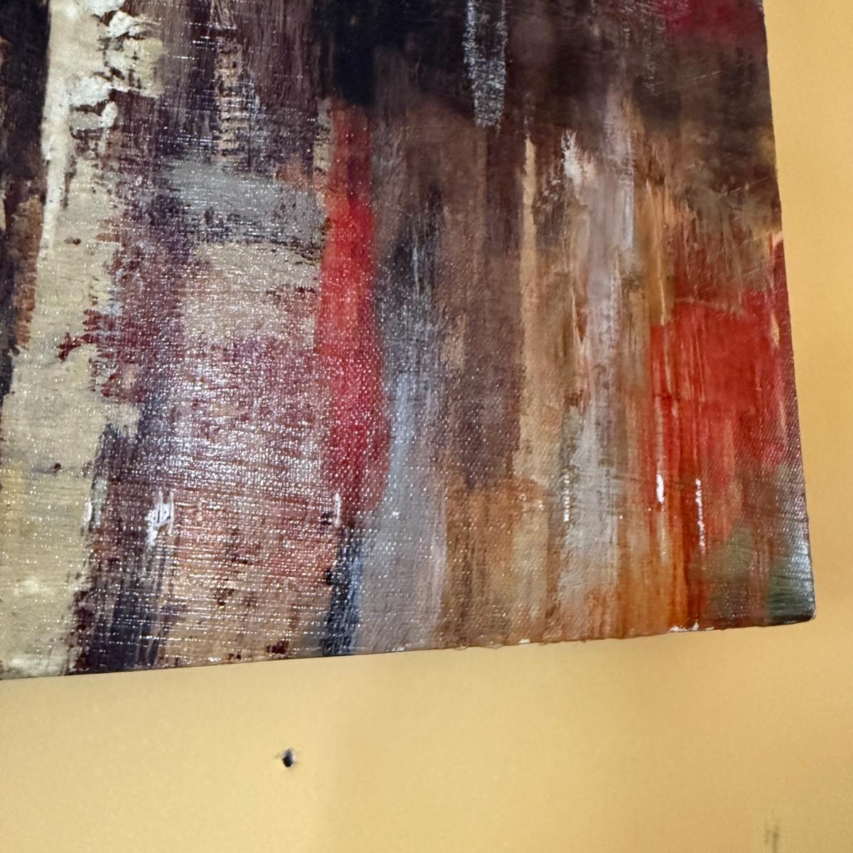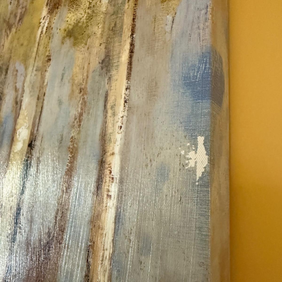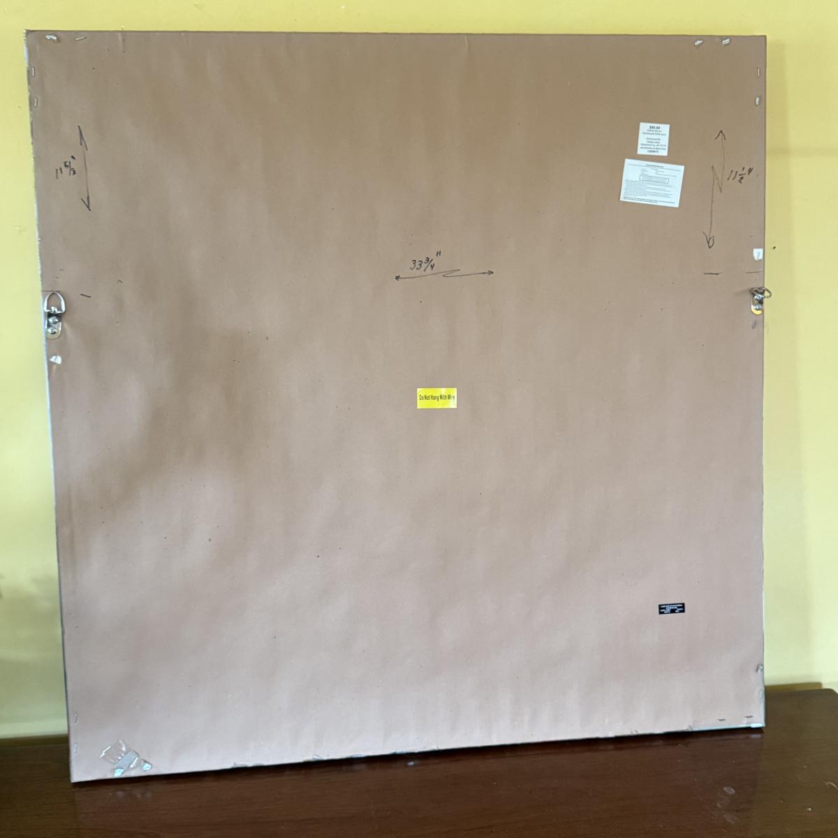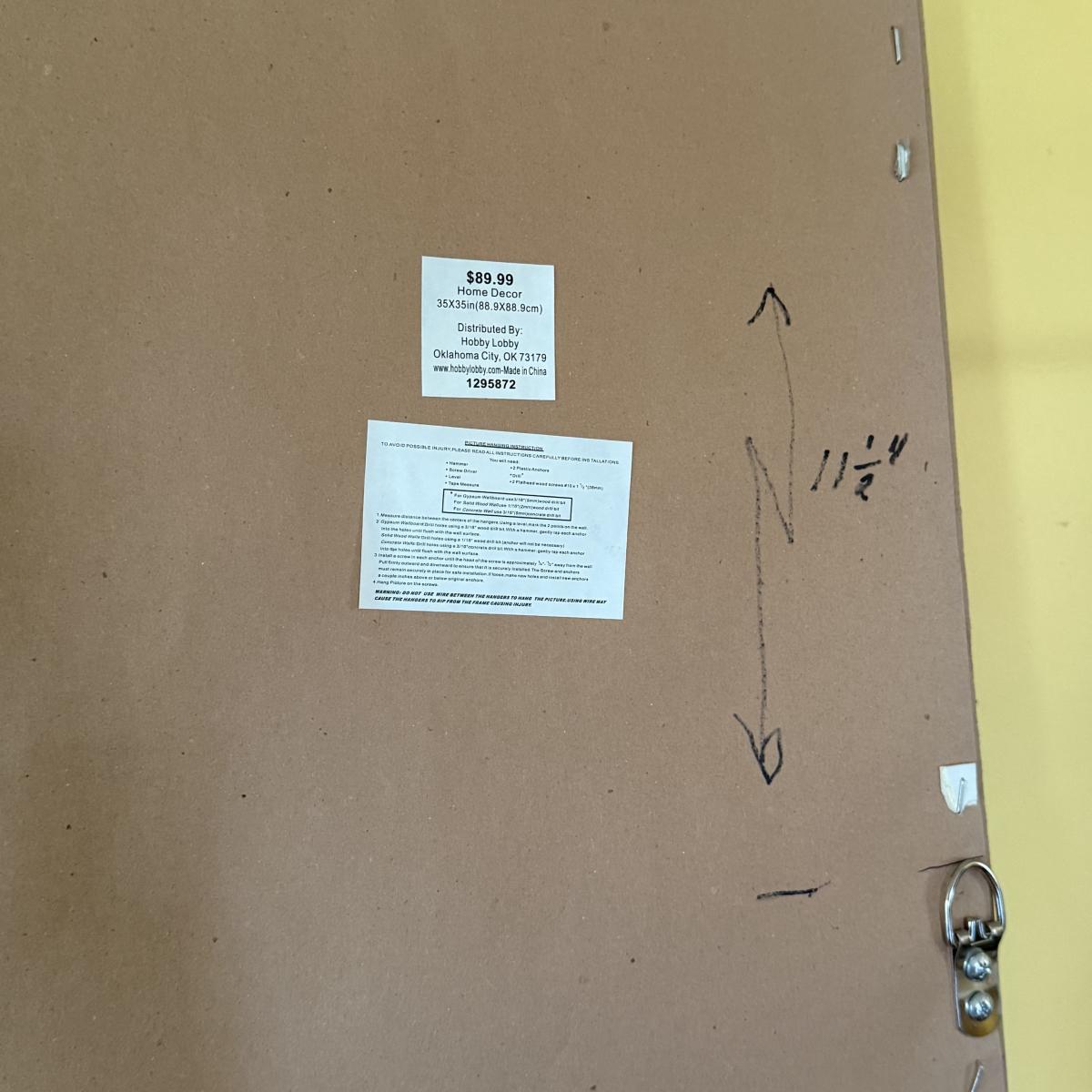 Large canvas art. Art appears to be a print with a textured finish that emulates paint brush strokes. There are a couple areas of wear. The item measures 35” x 35”. Tag on the back states that this art is from Hobby Lobby.