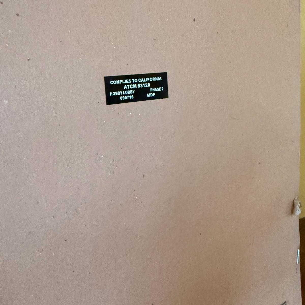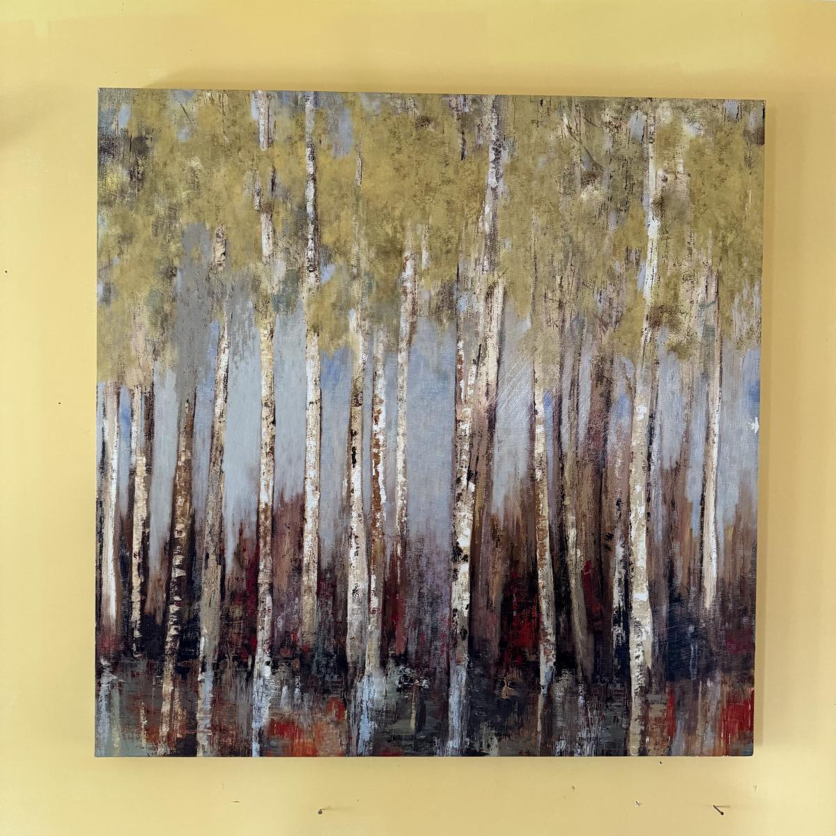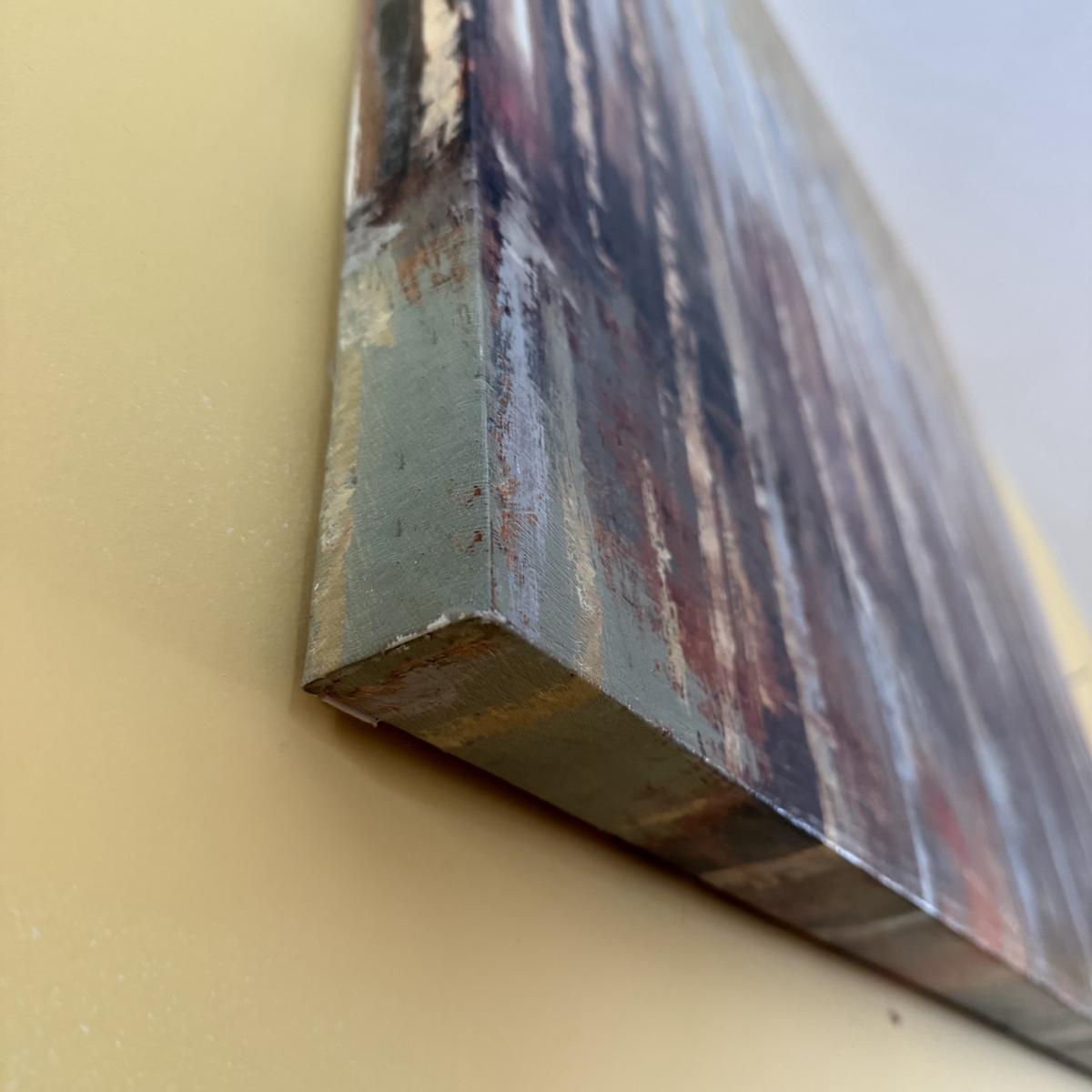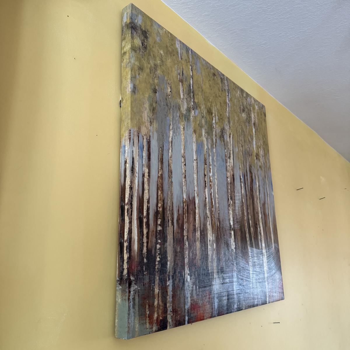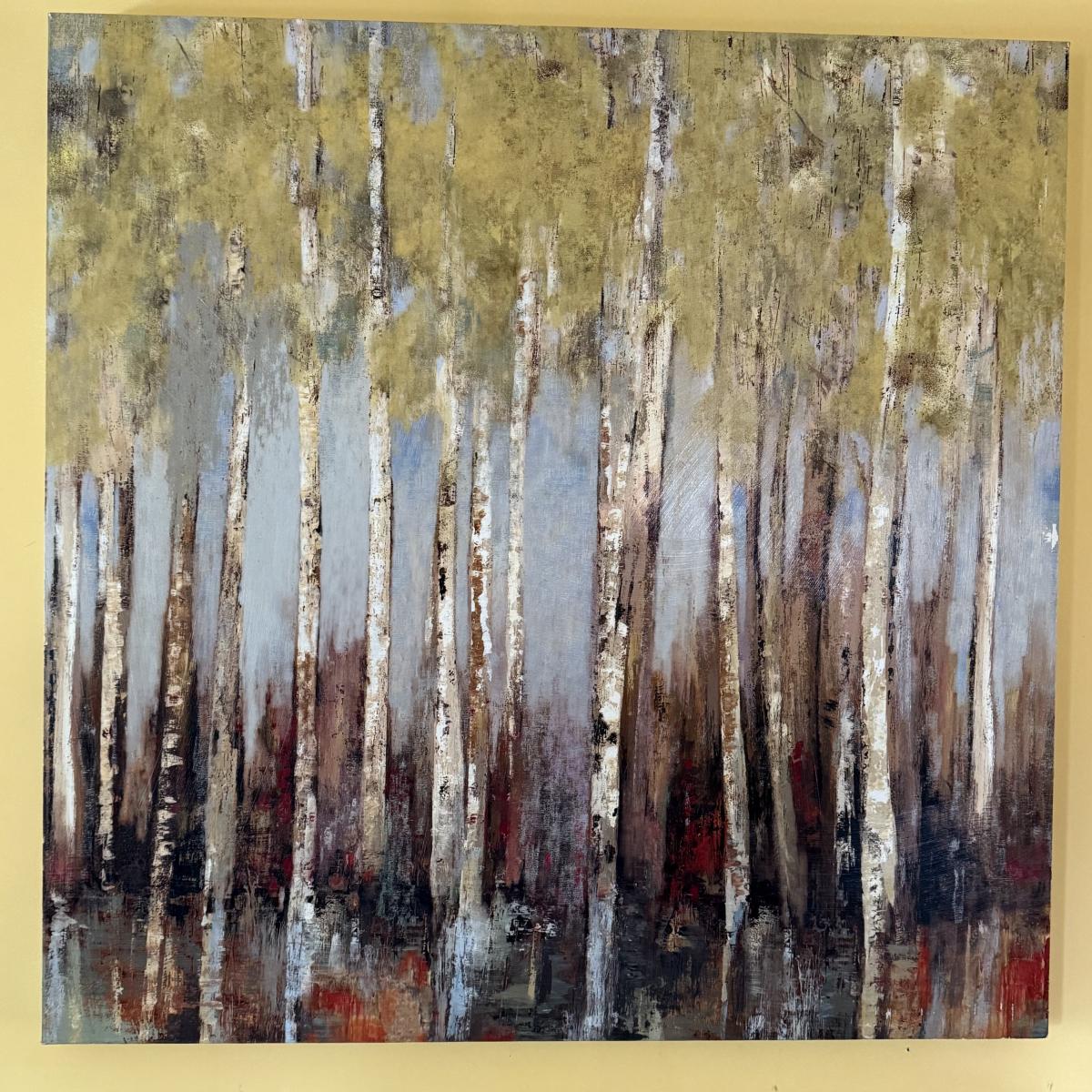 Large canvas art. Art appears to be a print with a textured finish that emulates paint brush strokes. There are a couple areas of wear. The item measures 35” x 35”. Tag on the back states that this art is from Hobby Lobby.